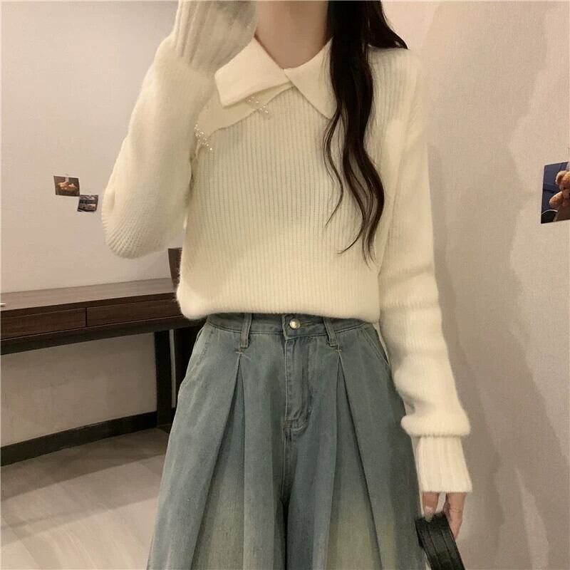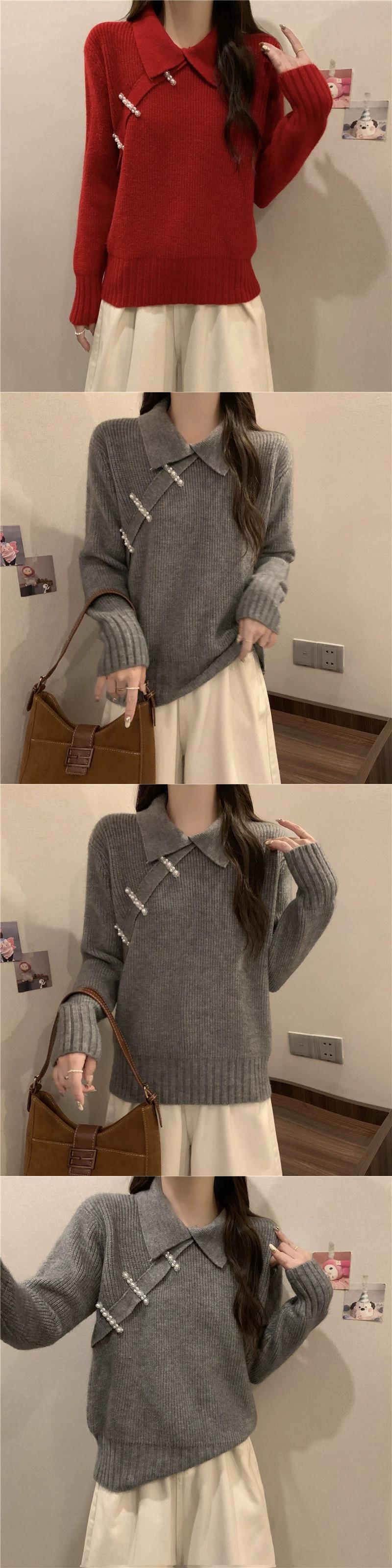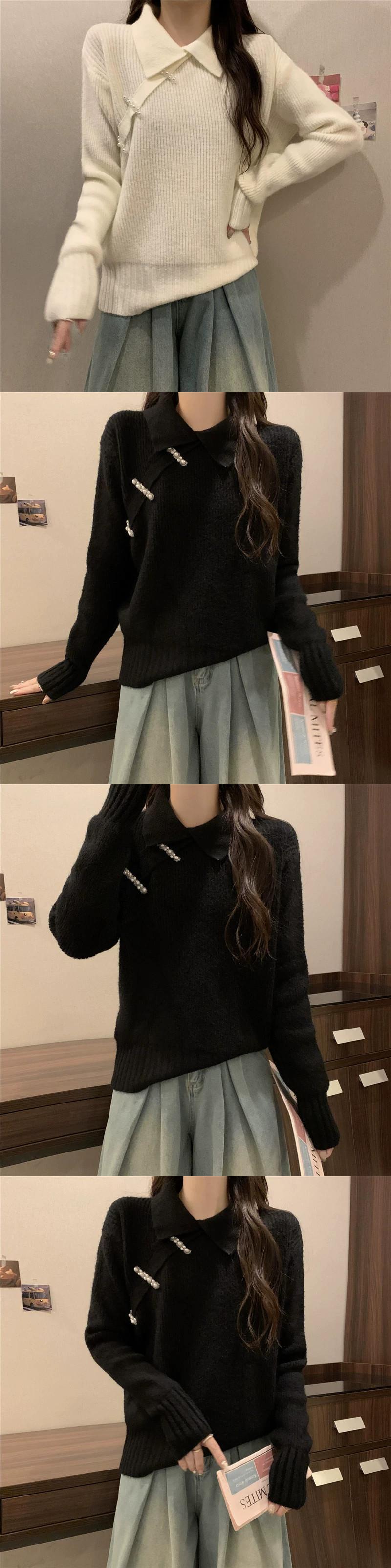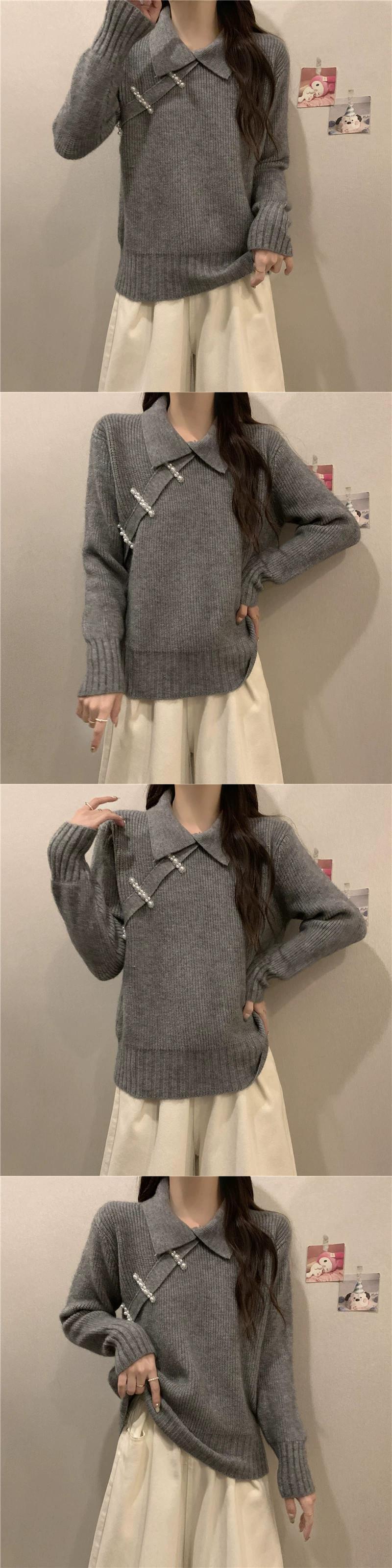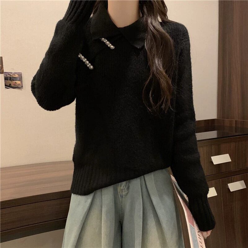 プラスサイズの女性の 2023 冬の新デザインニッチシックなパールプレートボタン人形の襟長袖ルーズセーター ロング 大きめサイズ ウィンター 冬物 真珠 8884175845575798