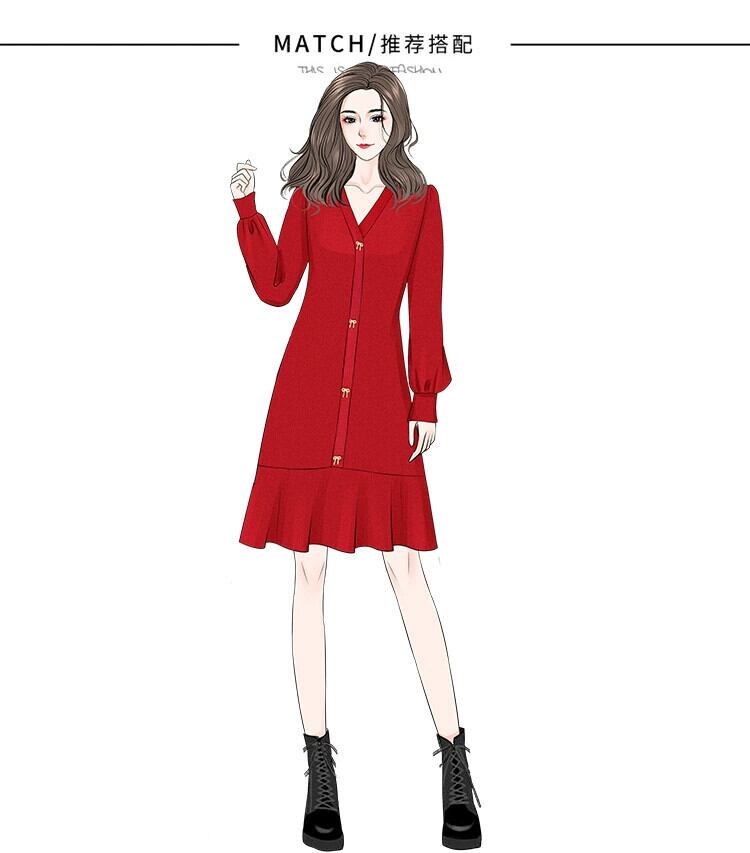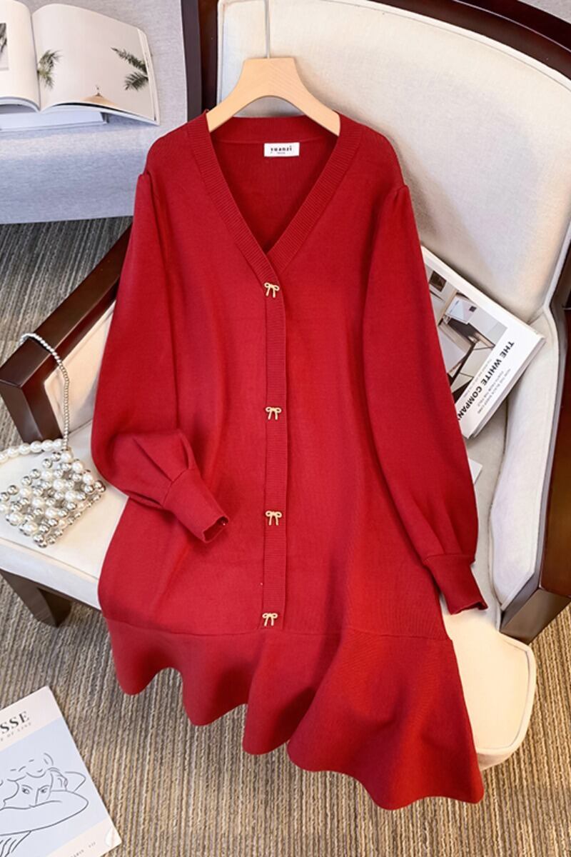 フレンチレトロインナーニットドレス女性の冬服プラスサイズ脂肪姉妹ハイエンドレッド V ネックスリムセータードレス 大きめサイズ ウィンター 冬物 Vネック 8884138009360281