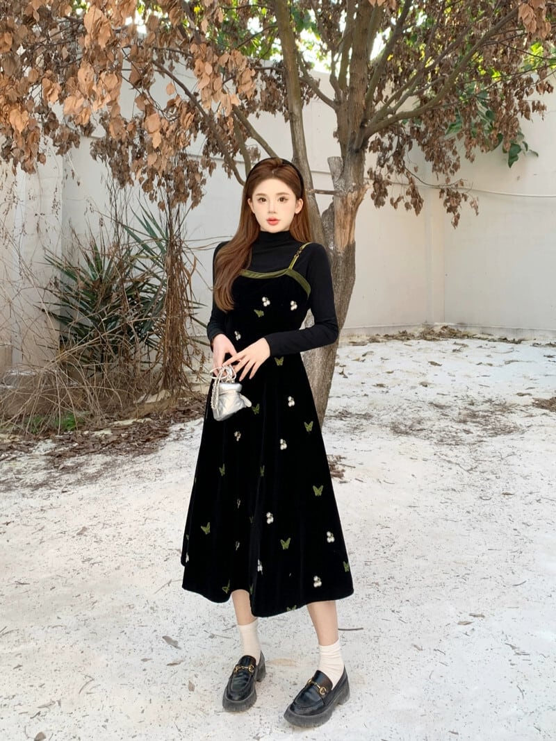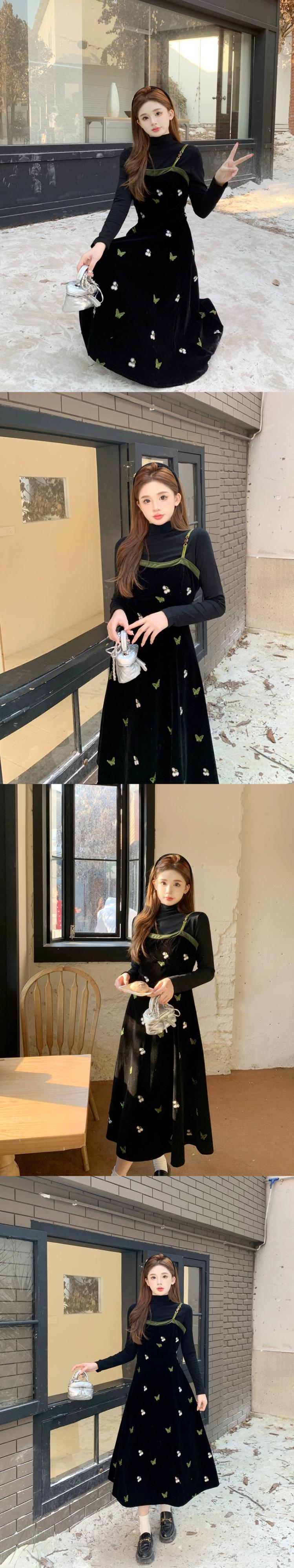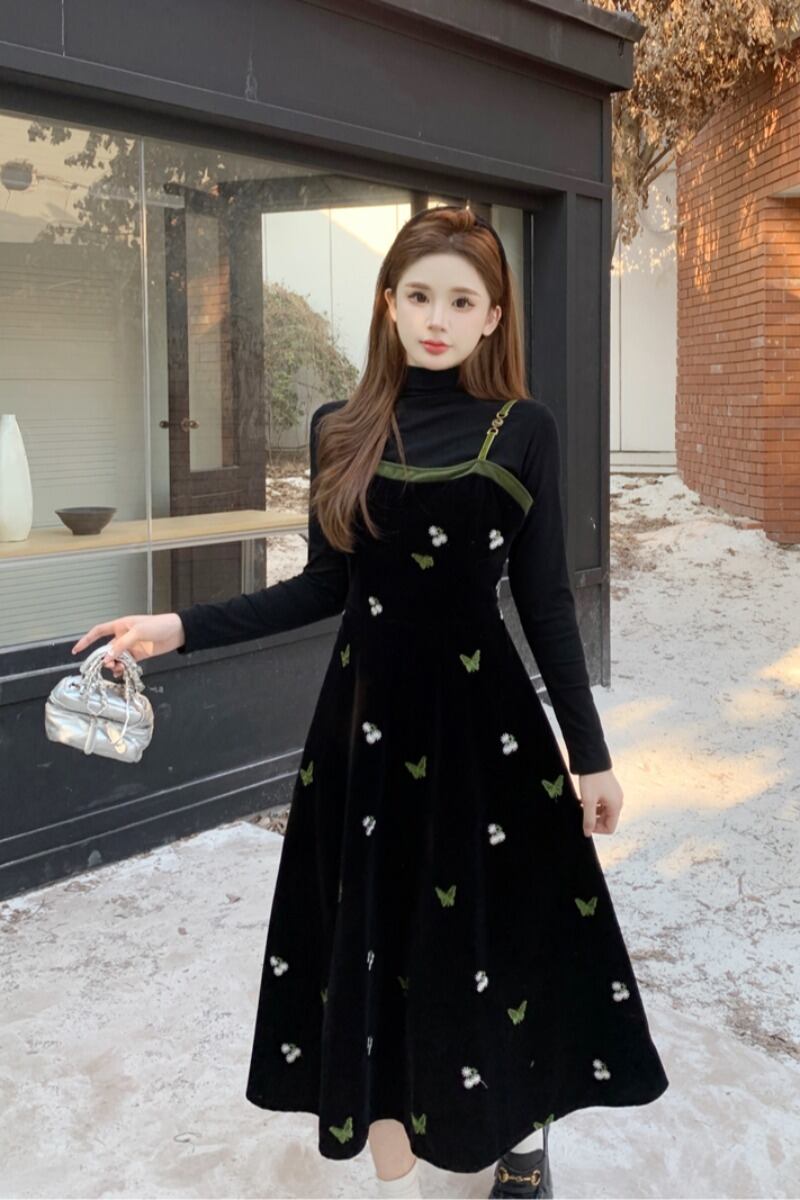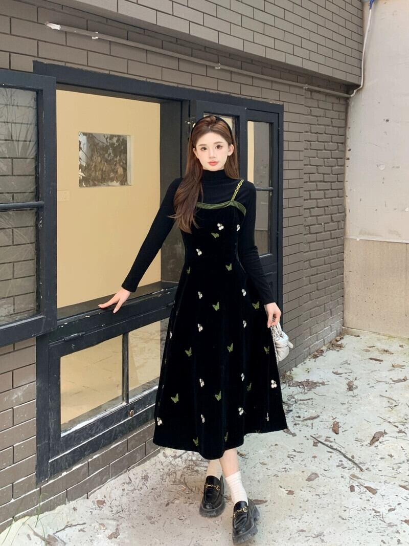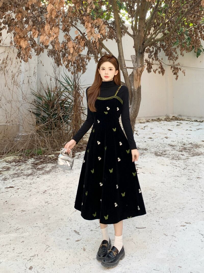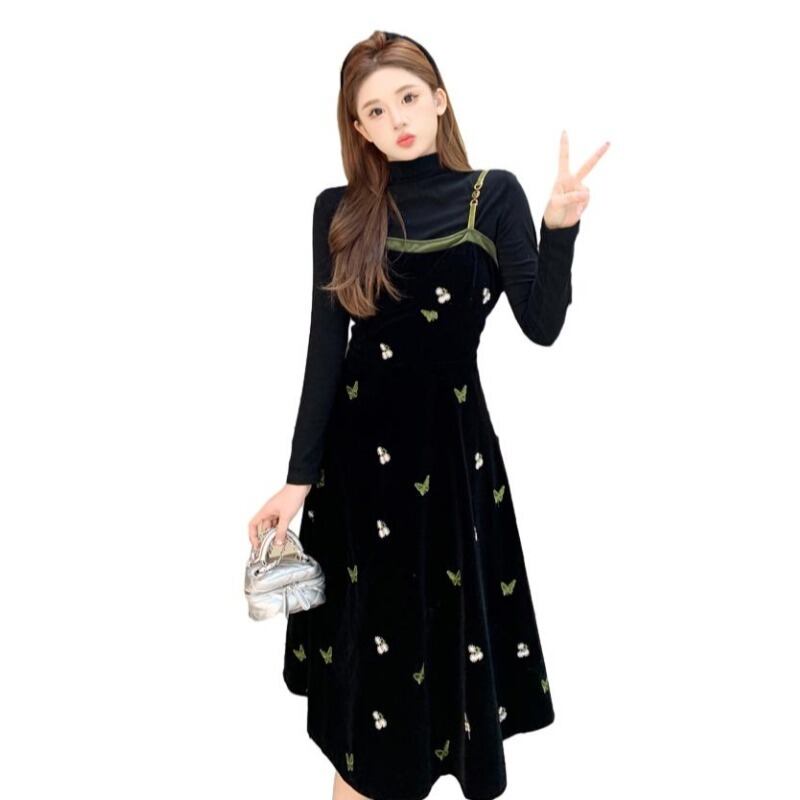 プラスサイズ脂肪ミリメートル黒スリムインナートップ秋冬フレンチベルベットサスペンダードレススーツ女性の高級感 ブラック 大きめサイズ オータム 秋物 ウィンター 冬物 8884166921713383