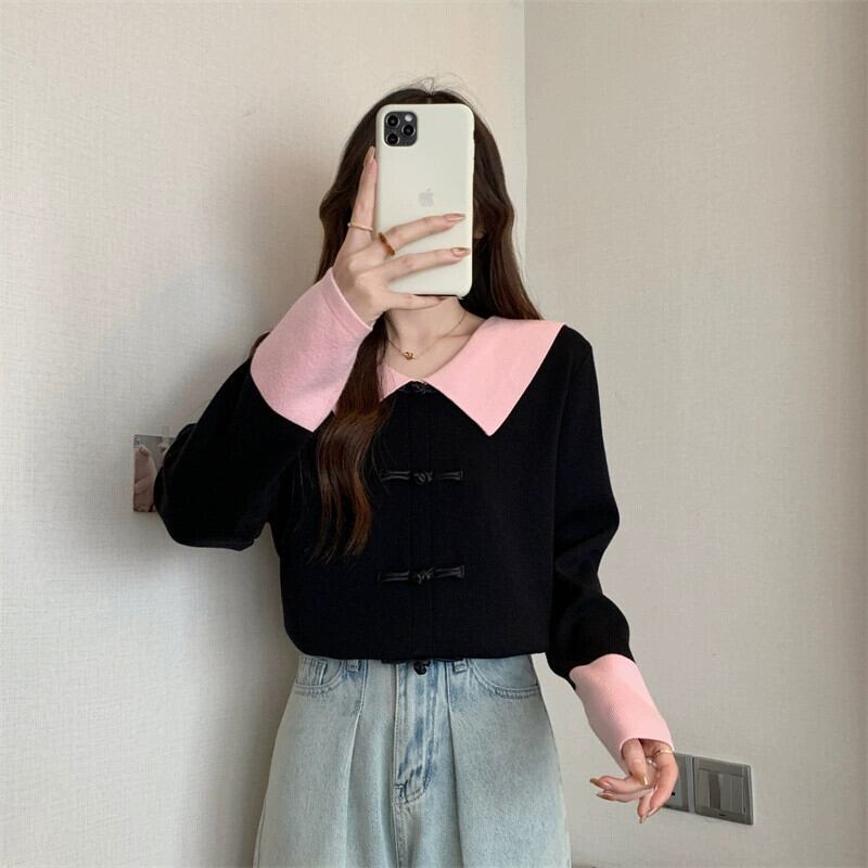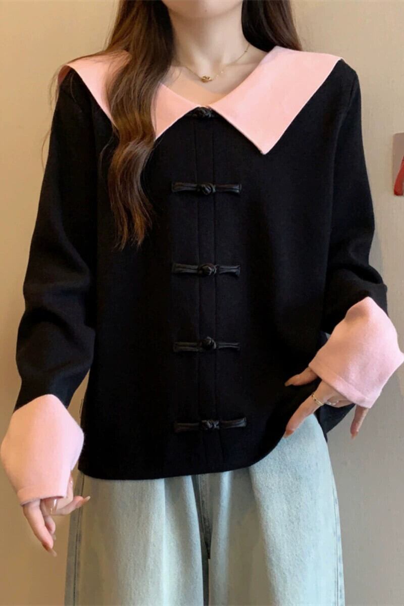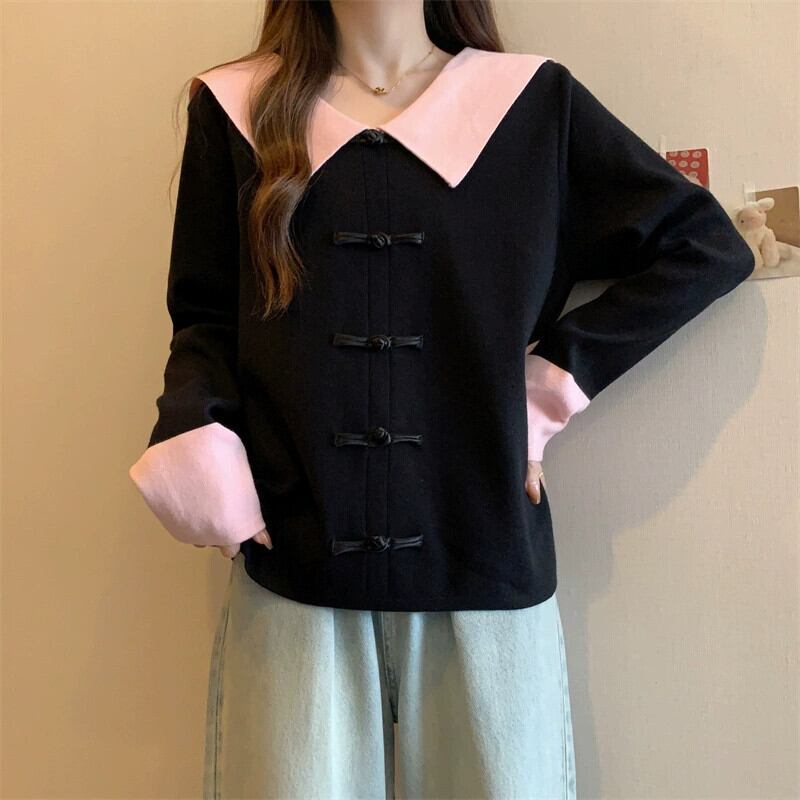 プラスサイズの女性のシックなプレートボタン人形の襟長袖セーター女性の長袖 2023 秋の新デザイントップ ロング 大きめサイズ オータム 秋物 8884152794728558