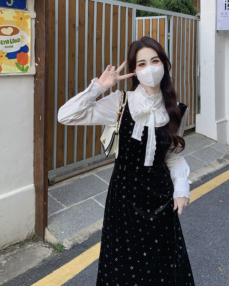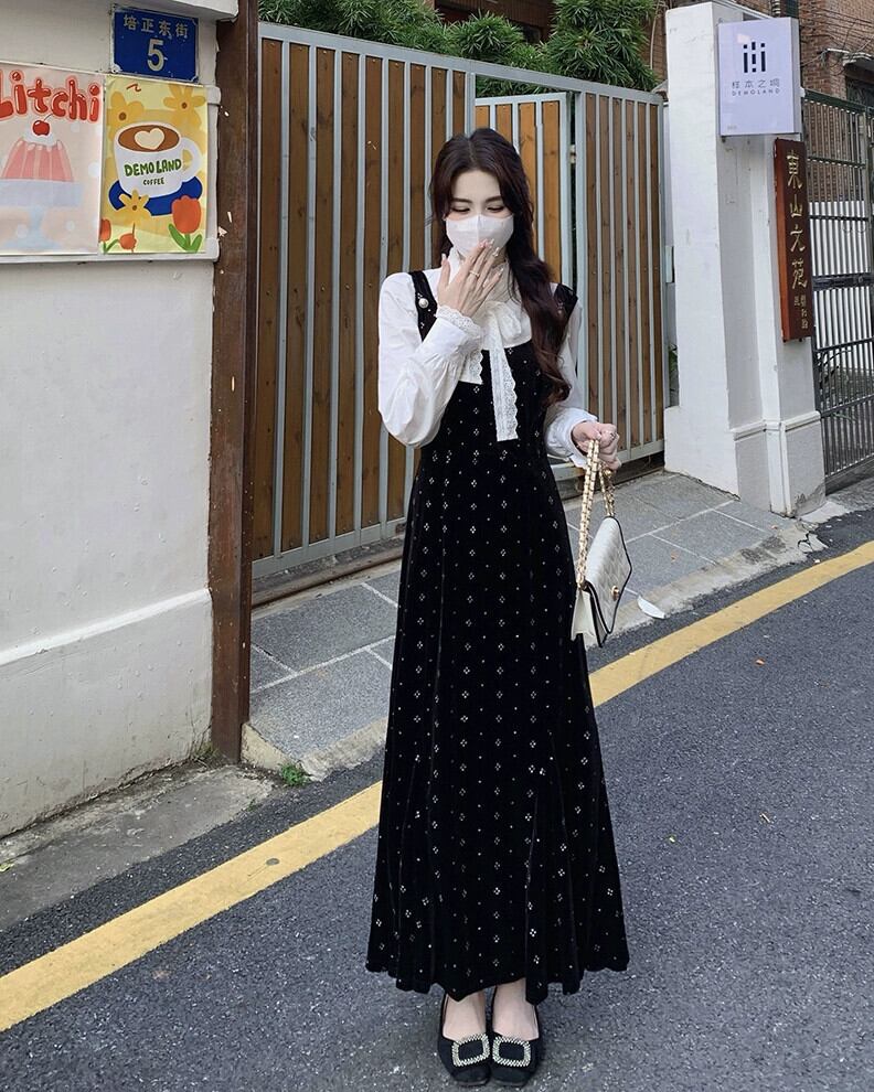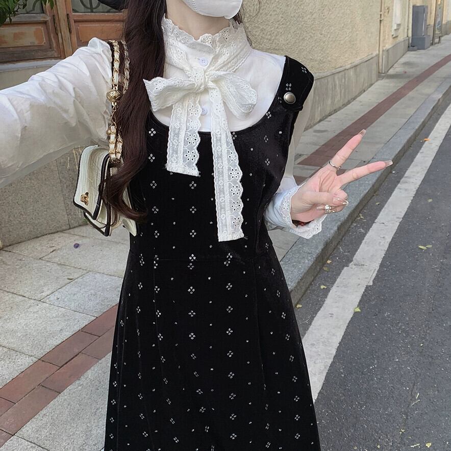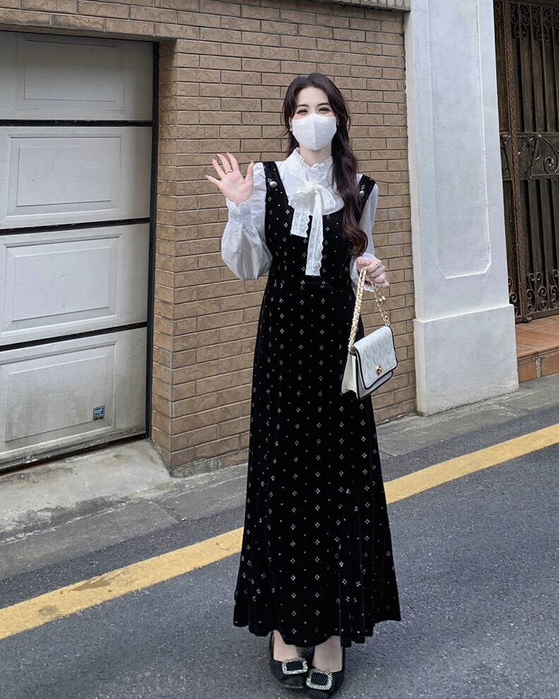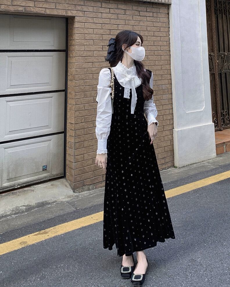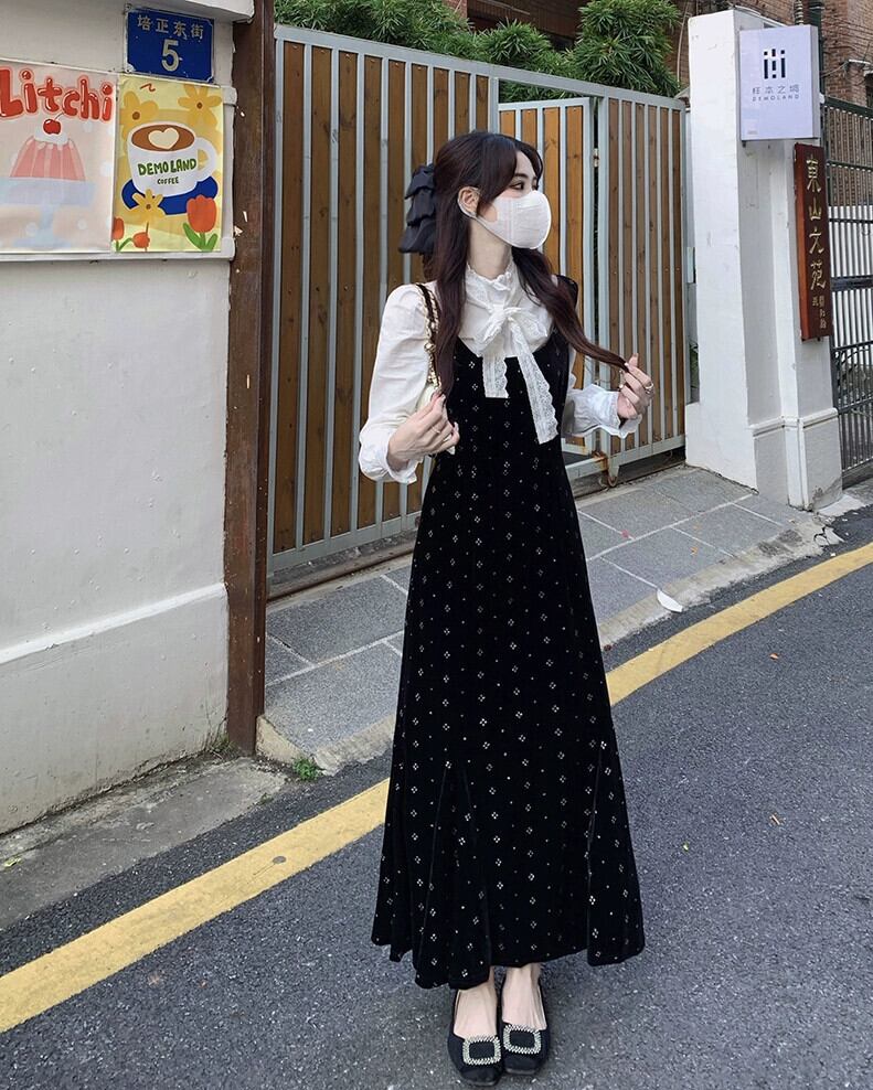 プラスサイズの女性の冬の新しいフレンチレトロベルベットドレス黒ウエスト痩身花サスペンダーフィッシュテールスカート ブラック 大きめサイズ ウィンター 冬物 花柄 8884133087767476