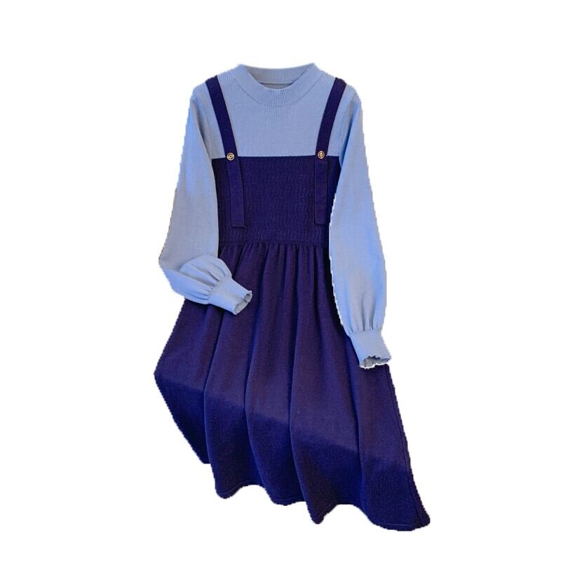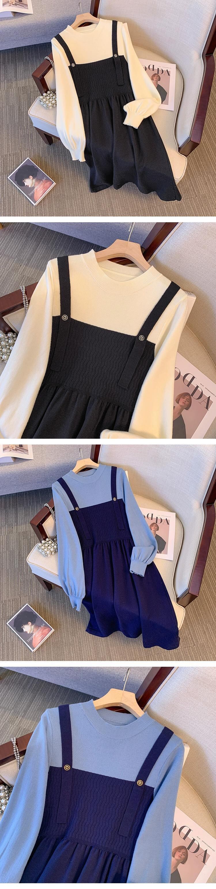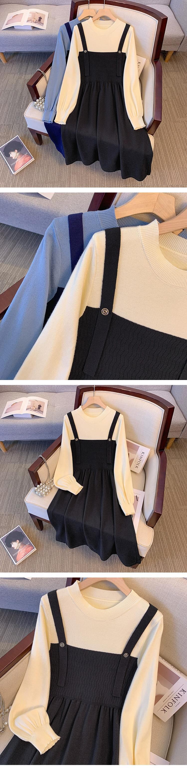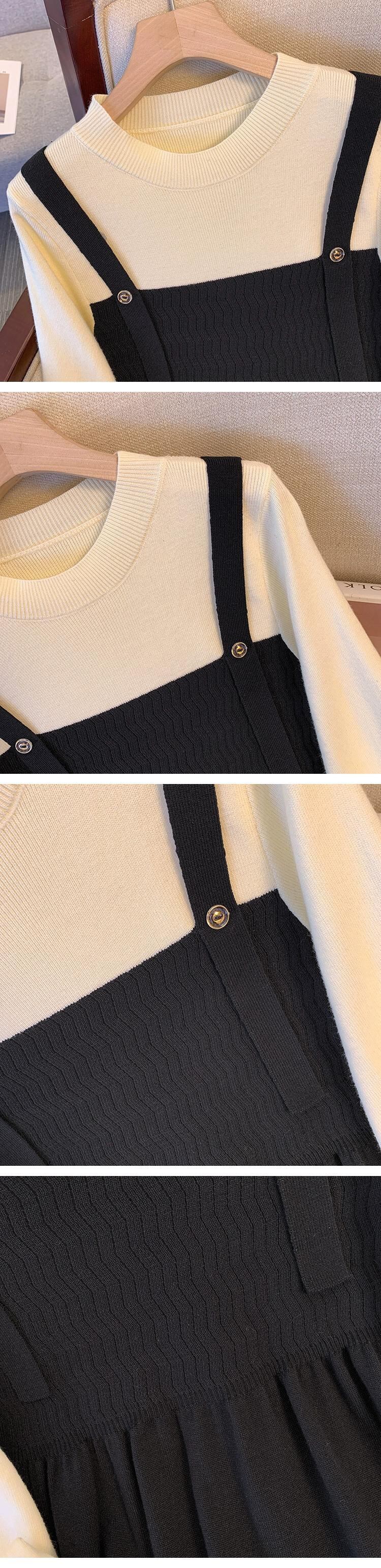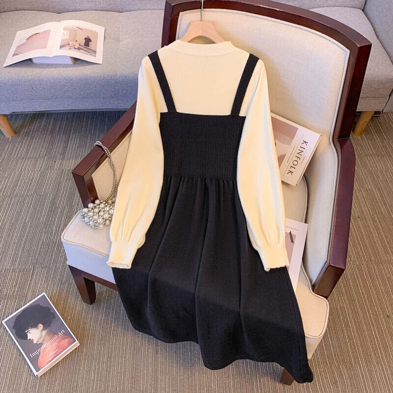 プラスサイズの女性の脂肪 mm 偽ツーピーススプライシングニットスカート冬の新 2023 ファッション対照的なカラーデザインのドレス 大きめサイズ ウィンター 冬物 8884117065314286