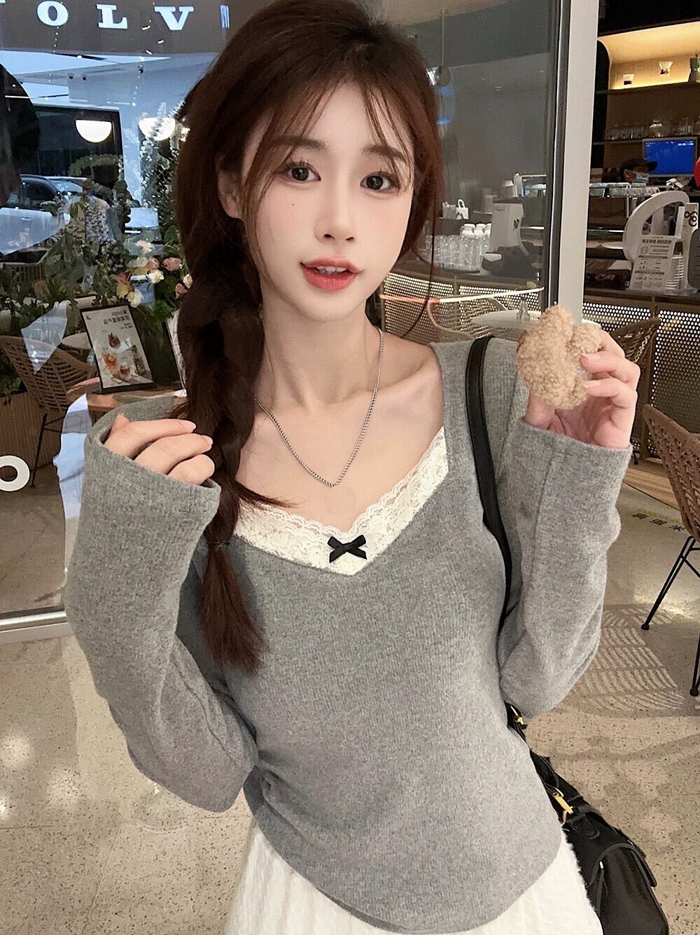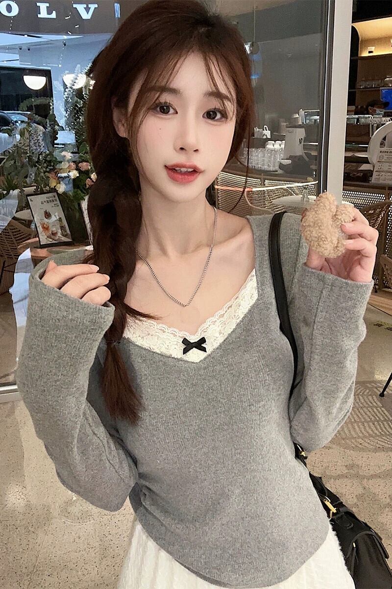 プラスサイズのレーススプライシング起毛長袖 Tシャツ女性の秋と冬の脂肪 MM 痩身ボトミングシャツ右肩トップ ロング 大きめサイズ オータム 秋物 ウィンター 冬物 88841374724921