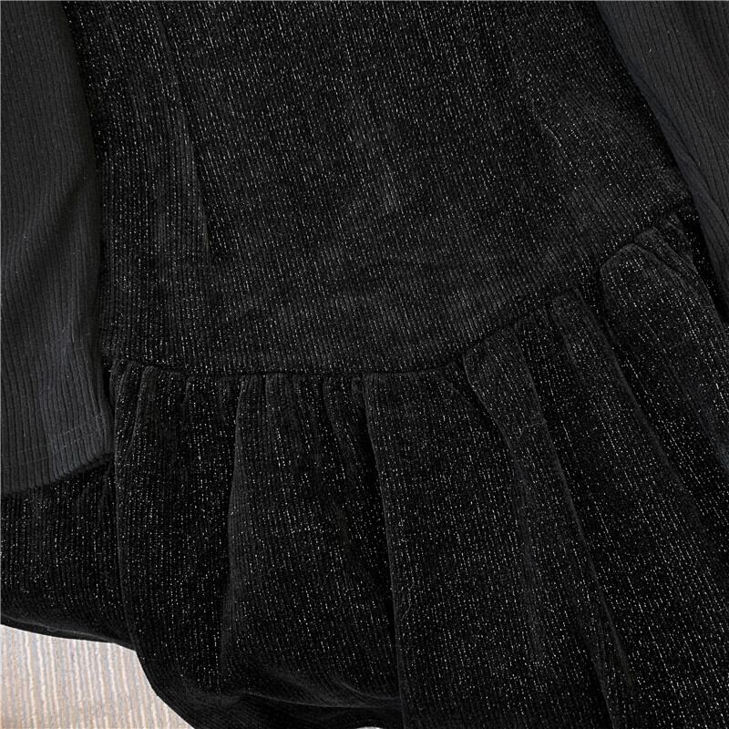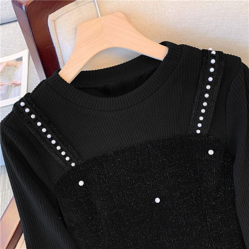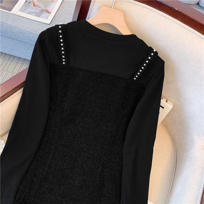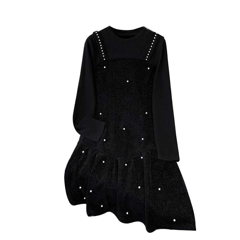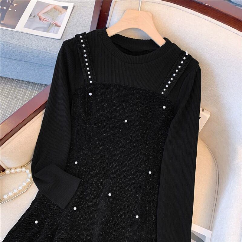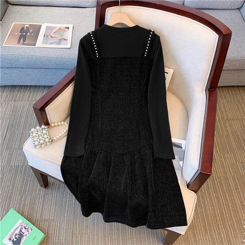 プラスサイズの婦人服 2023 春の新作ファット mm ラウンドネック長袖ミッドレングスファッショナブルな気質偽ツーピースドレストレンディ ロング 大きめサイズ スプリング 春物 Oネック 8884133973209979