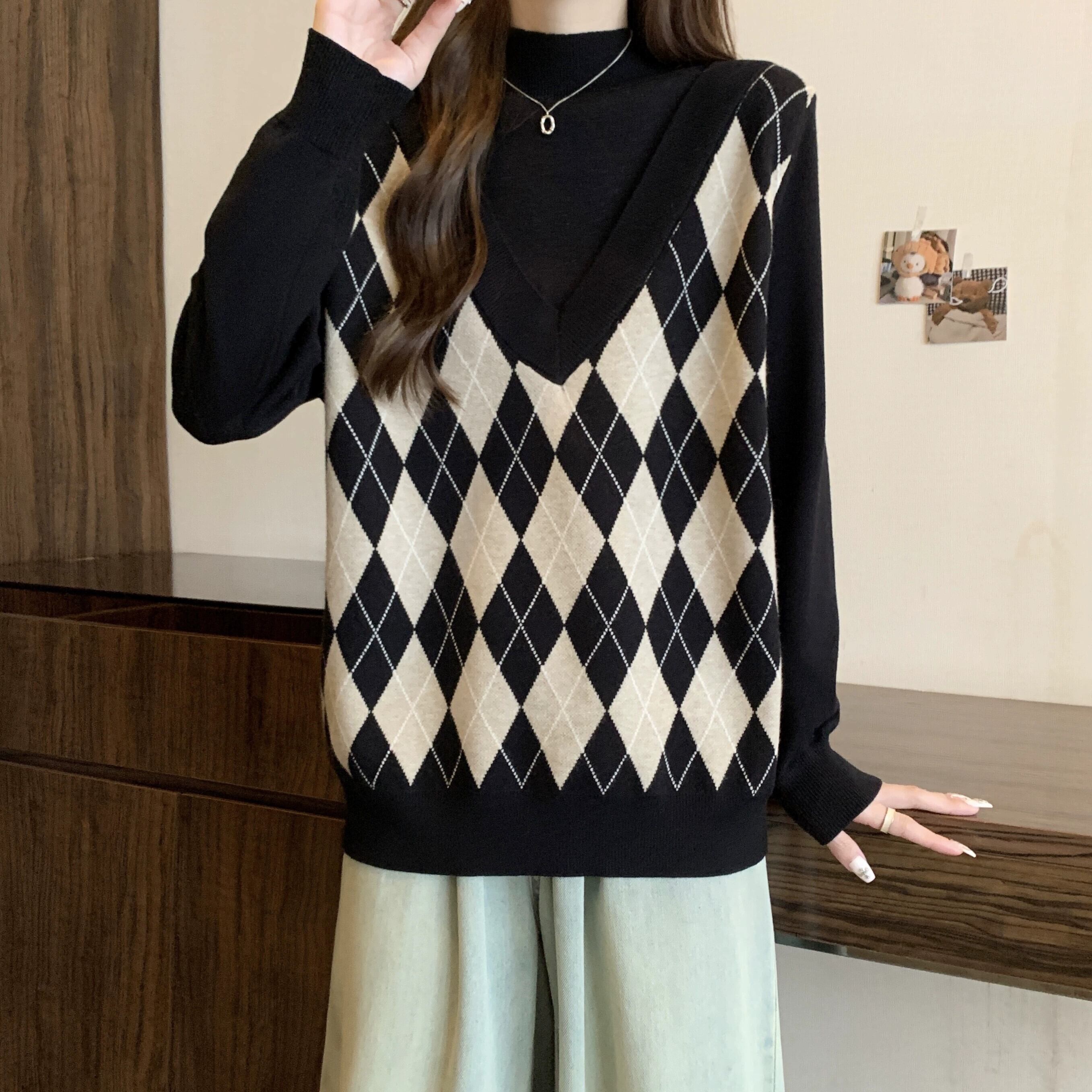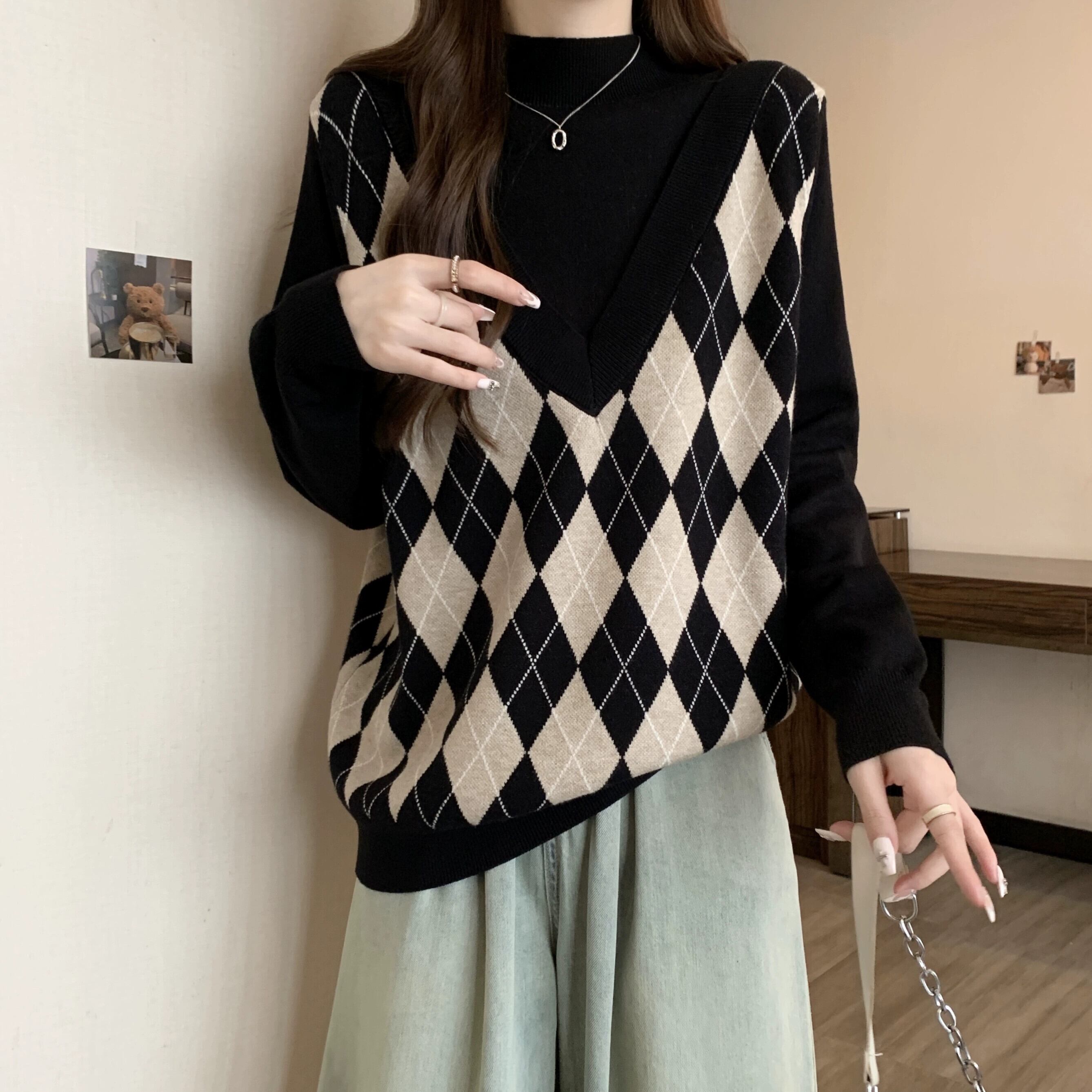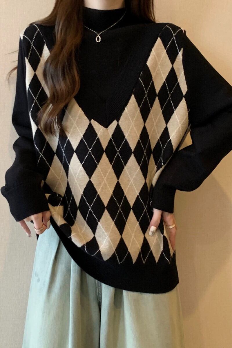 プラスサイズの女性の脂肪 mm 冬の新 2023 偽ツーピースルーズファッショナブルな気質多用途セーター年齢を減らすトップス 大きめサイズ ウィンター 冬物 8884151822203261
