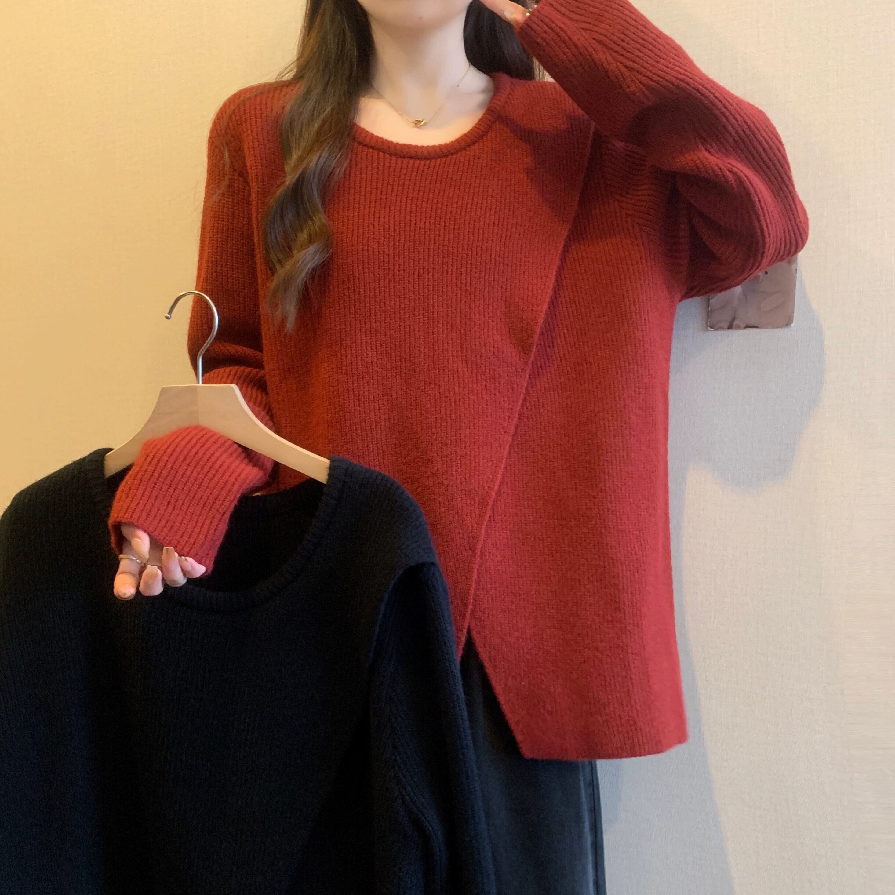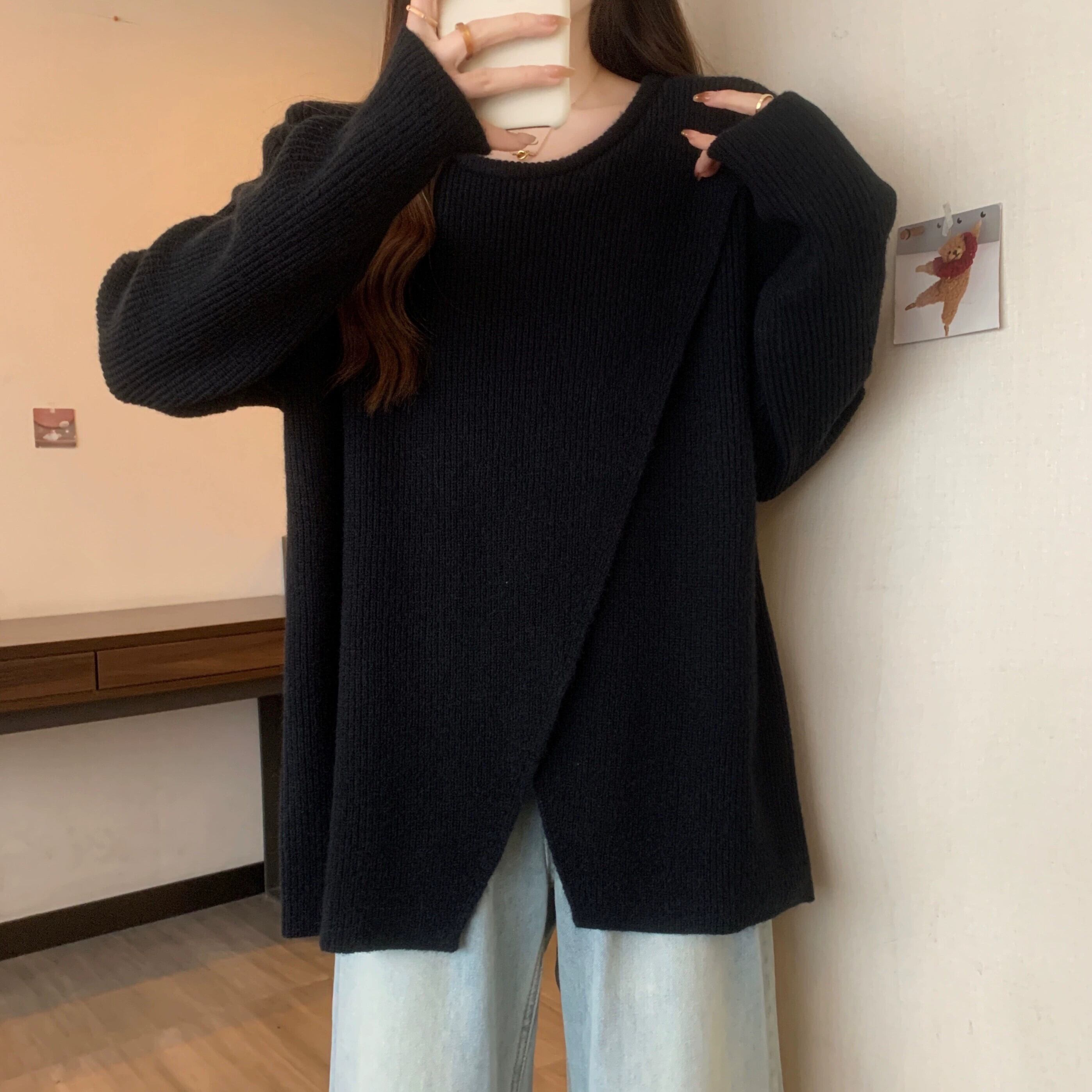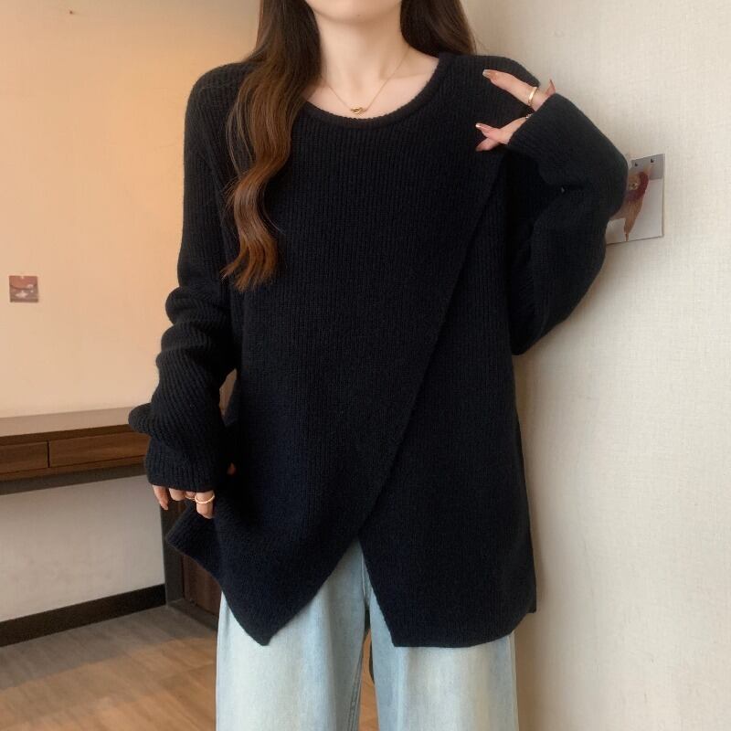 大きいサイズのミドル丈セーター女性 2023 春の新しいラウンドネックデザイン不規則なスリットルーズ痩身セーター 大きめサイズ スプリング 春物 Oネック 8884170149514250