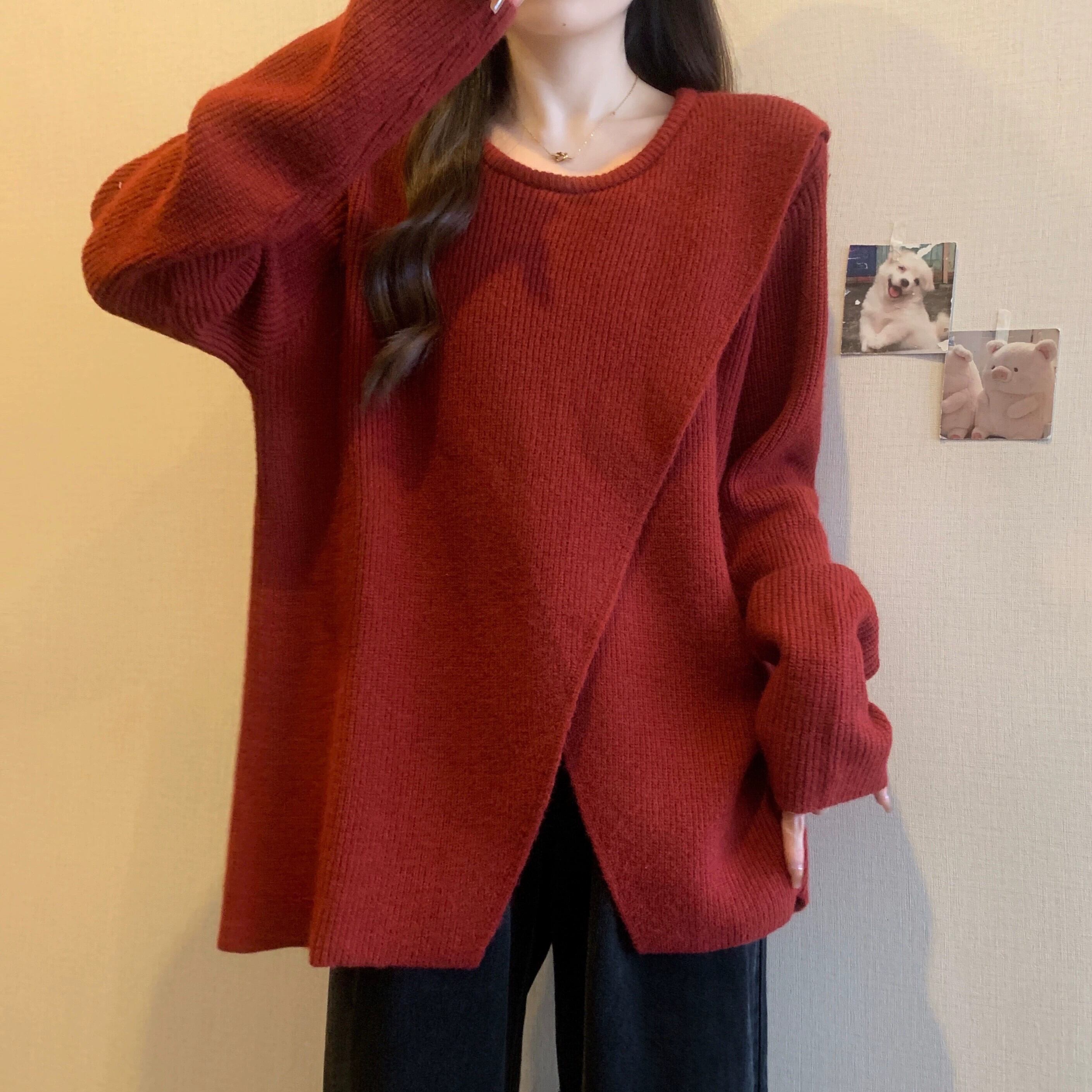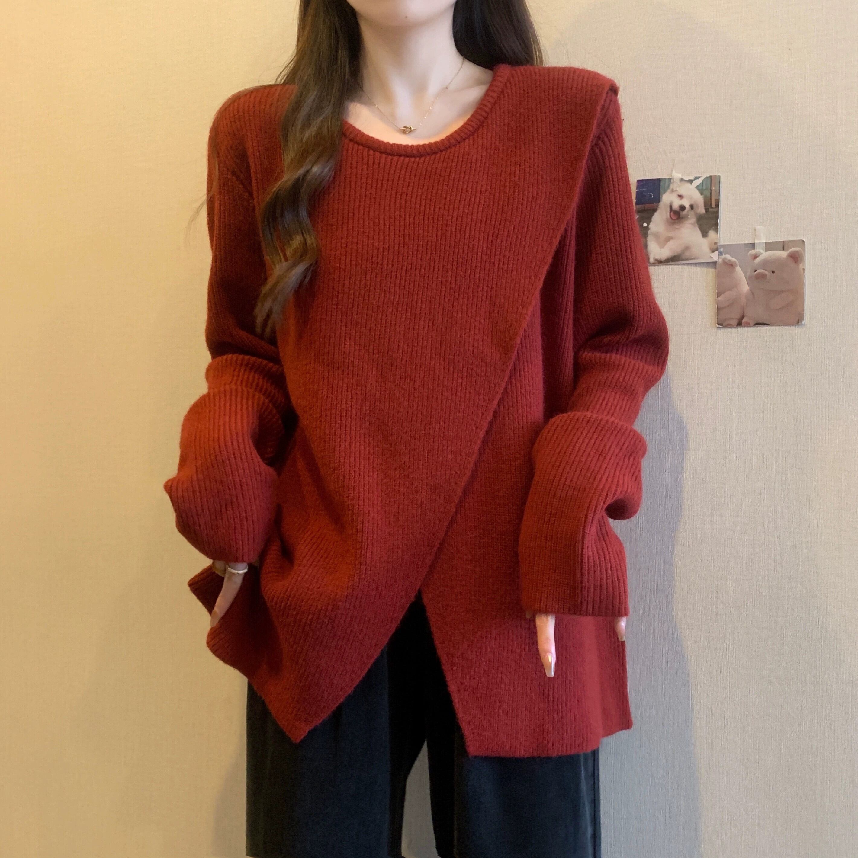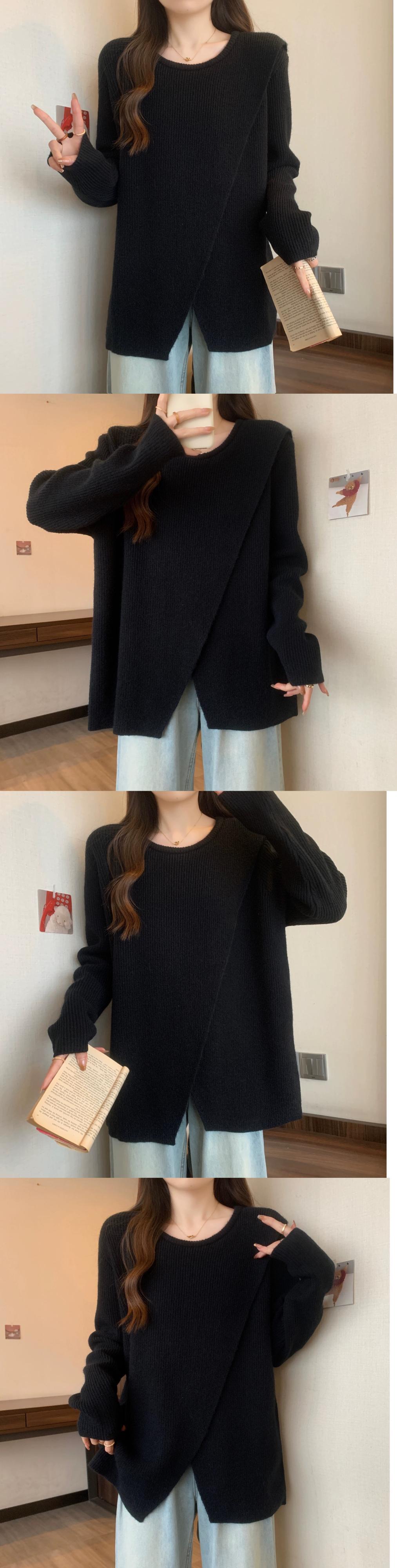 大きいサイズのミドル丈セーター女性 2023 春の新しいラウンドネックデザイン不規則なスリットルーズ痩身セーター 大きめサイズ スプリング 春物 Oネック 8884170149514250