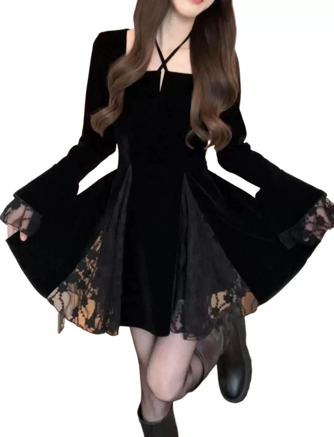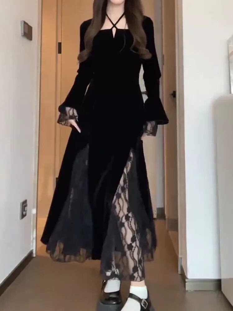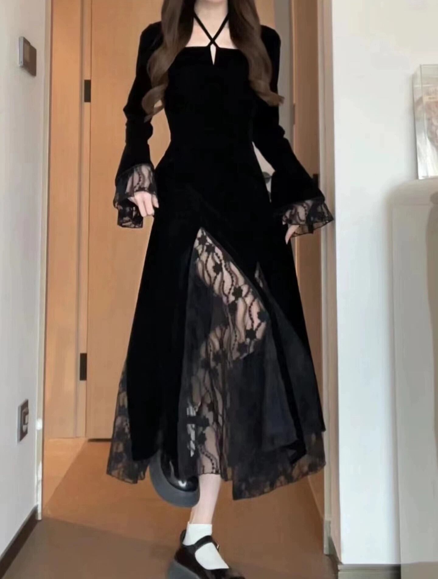プラスサイズの脂肪ミリメートルハイエンドエレガントなスリットレースベルベットスカート女性の春の気質ダークロマンチックなスプライシングドレス 大きめサイズ スプリング 春物 8884146373149458
