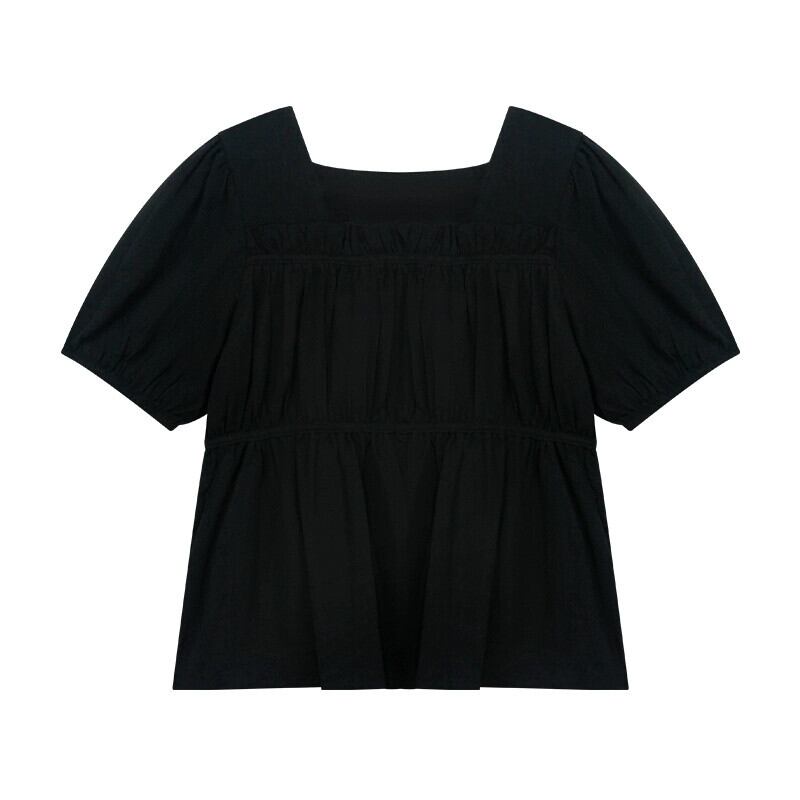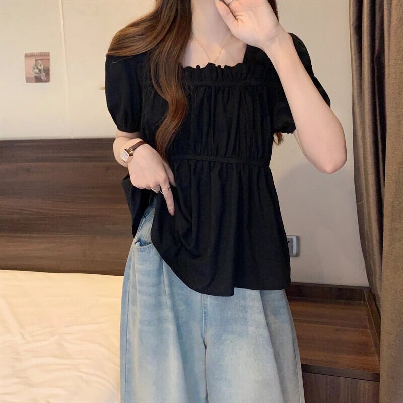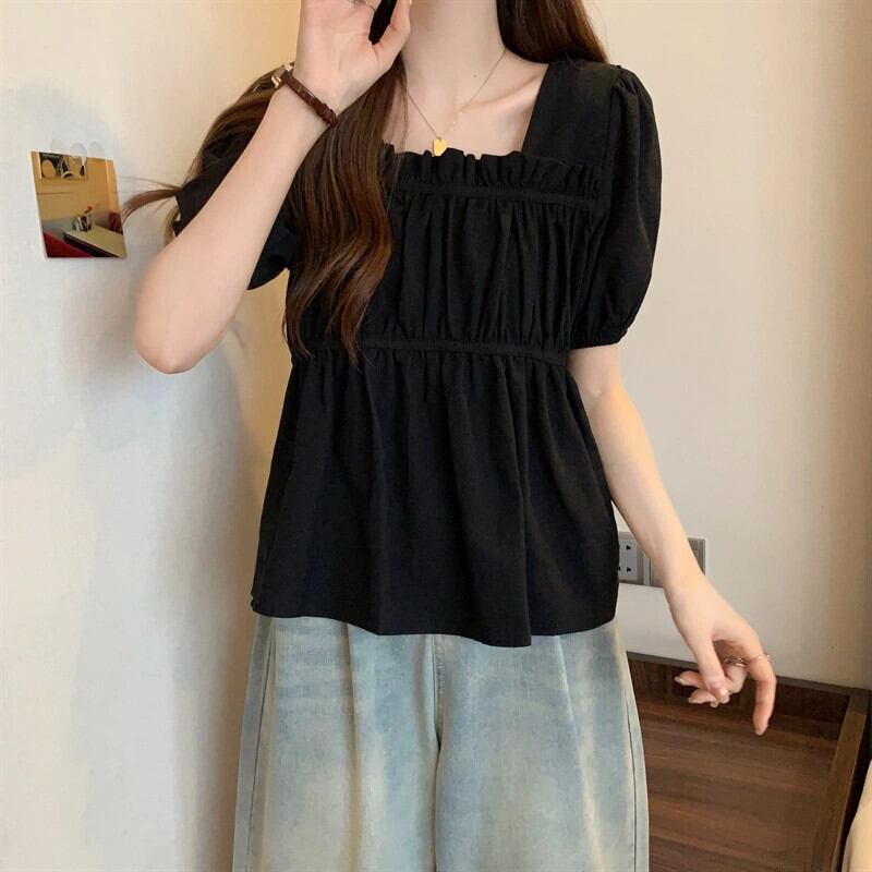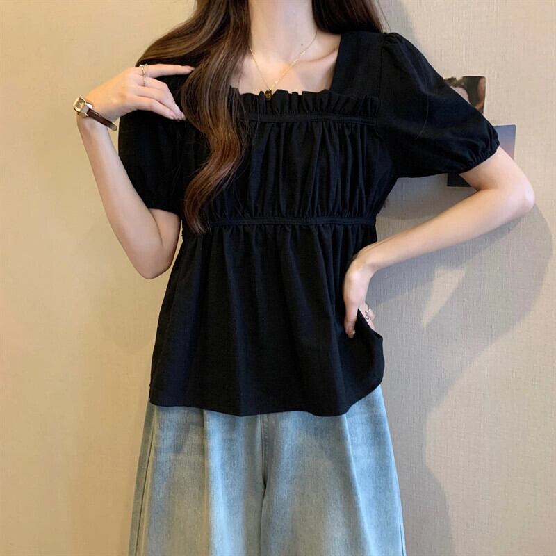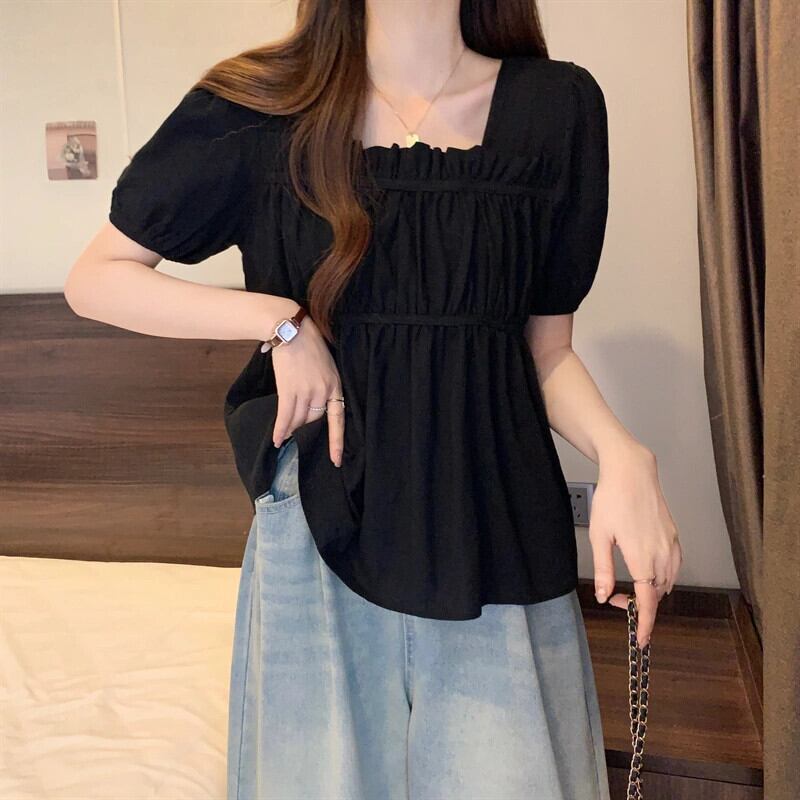 プラスサイズの女性のスクエアカラープリーツ半袖シフォンシャツ女性の夏のデザインゆったりとした少し太ったmmのお腹をカバーして肉を隠すトップ 大きめサイズ サマー 夏物 スクウェア 8884125211925573