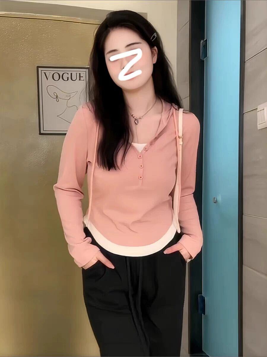 プラスサイズの秋の新しい脂肪mmは肉をカバーしてスリムに見えるボトリングシャツ右肩トップフェイクツーピースデザインフード付き長袖Tシャツ ロング 大きめサイズ オータム 秋物 8884139438318451