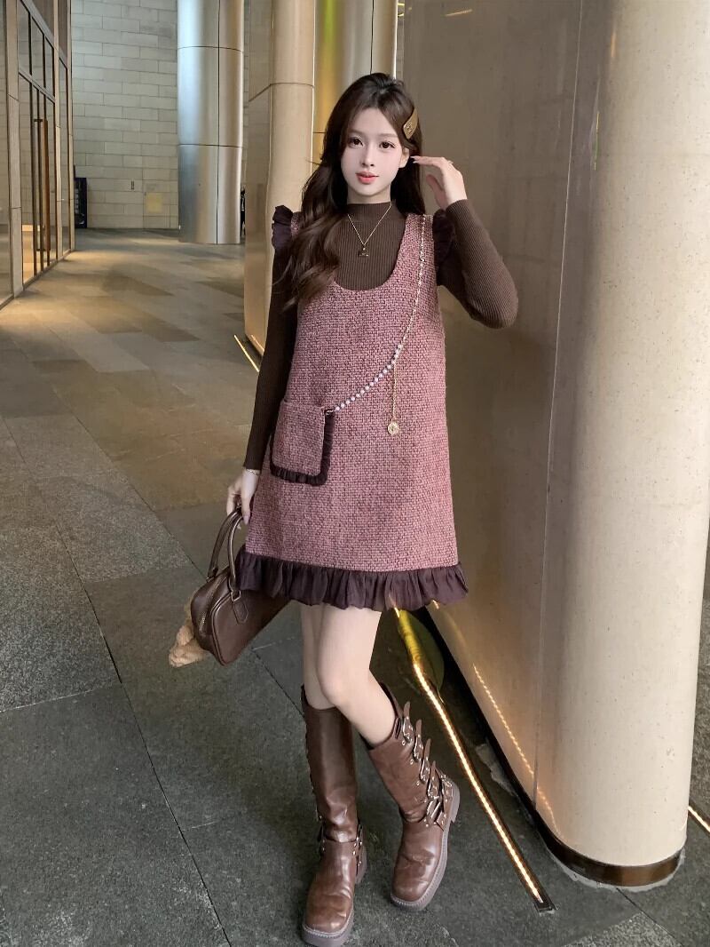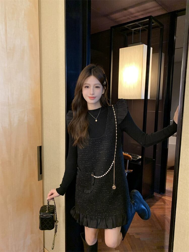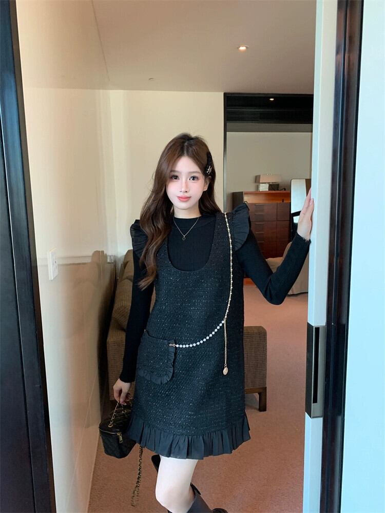 プラスサイズの女性の 2024 春スタイル小さな香りのフリルサスペンダードレス痩身インナーボトリングシャツツーピーススーツ 大きめサイズ スプリング 春物 8884184625854605