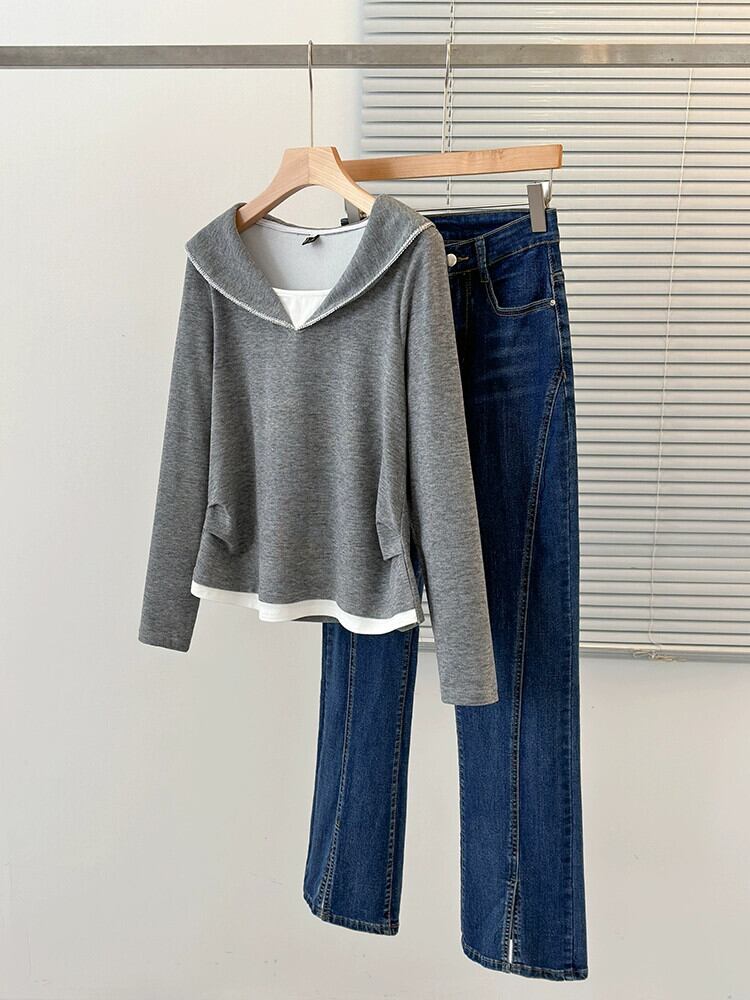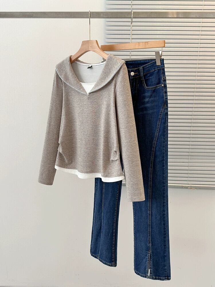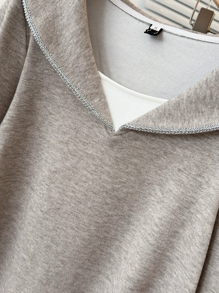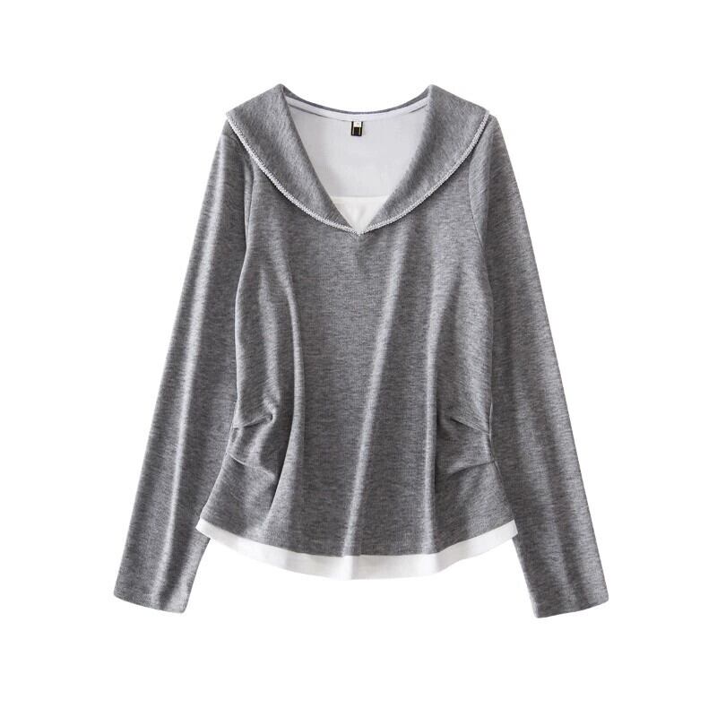 大きいサイズ 2024 春フェイクツーピースカジュアルルーズボトムシャツ女性脂肪 mm 痩身と肉カバー長袖 T シャツトップス ロング 大きめサイズ スプリング 春物 Tシャツ 8884148493716283