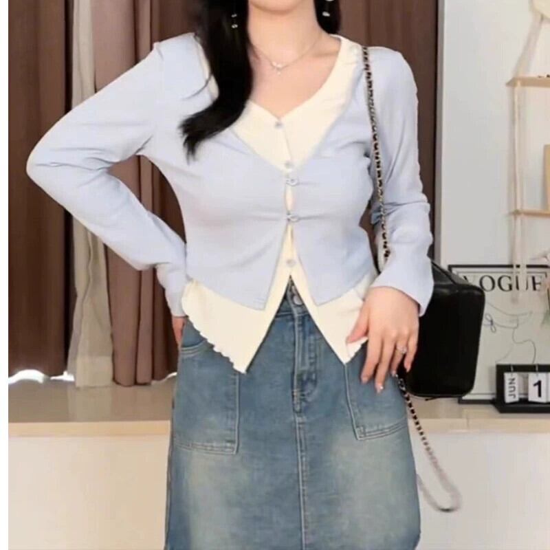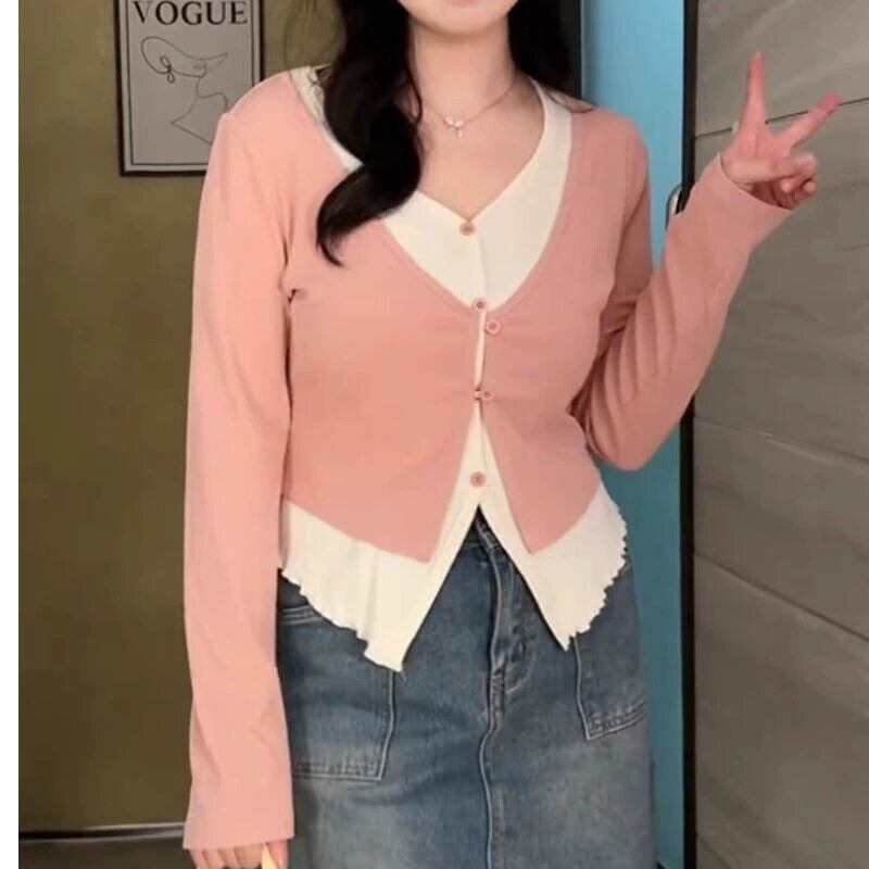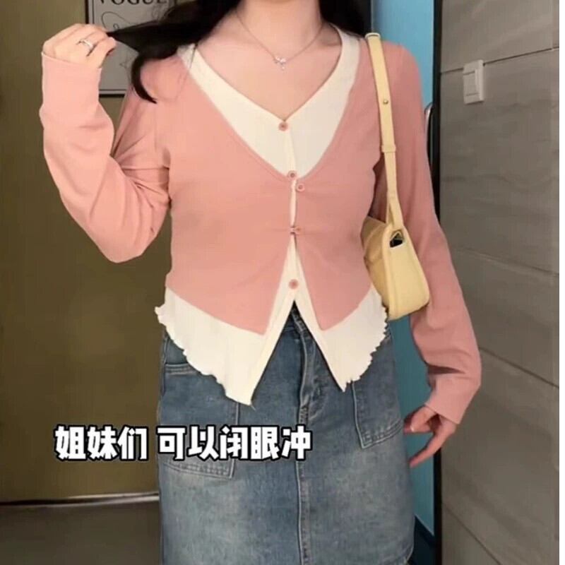 プラスサイズの女性の 2024 春の新作痩身長袖 T シャツ脂肪 mm スタイルファッショナブルな偽ツーピーストップス ロング 大きめサイズ スプリング 春物 Tシャツ 8884120745889982