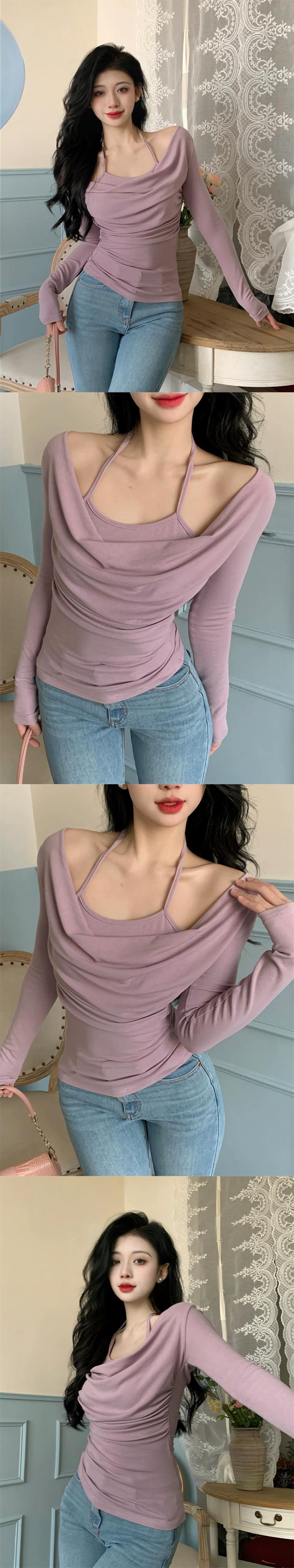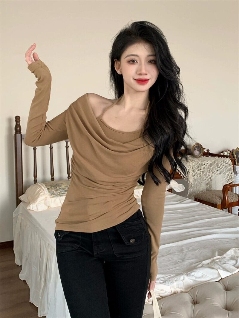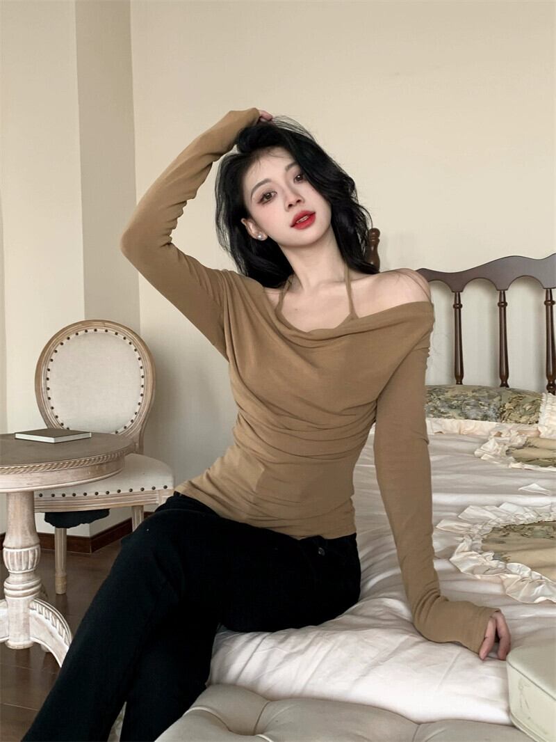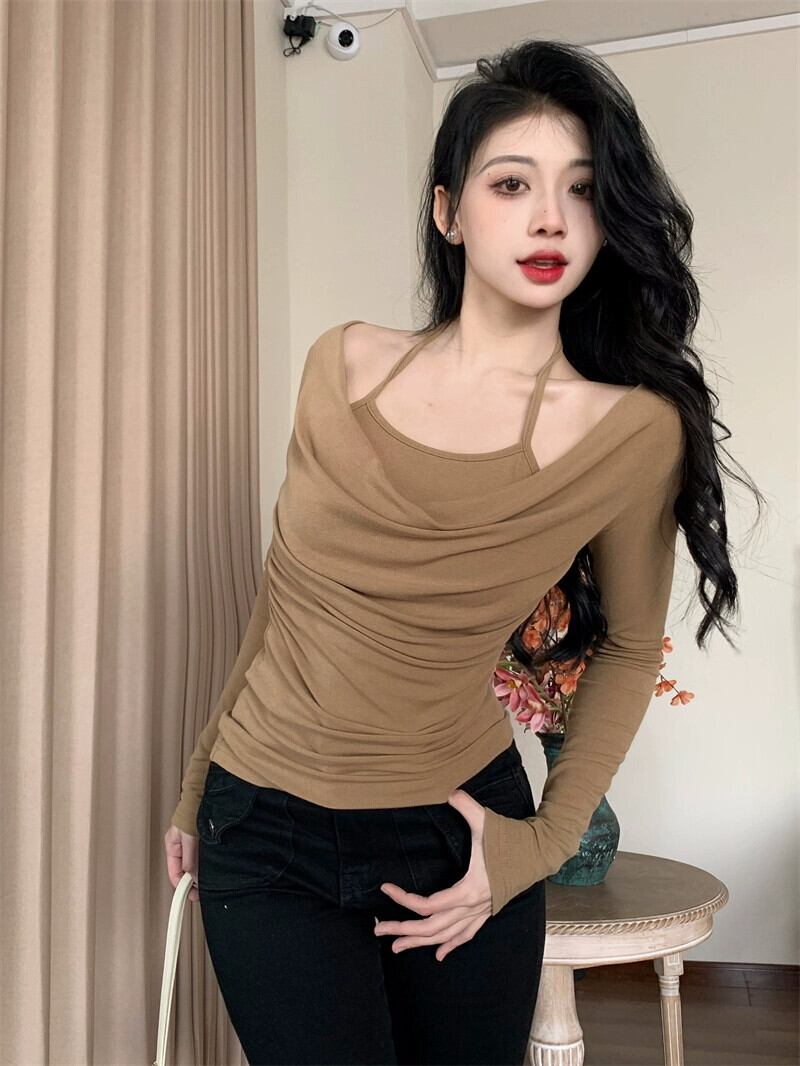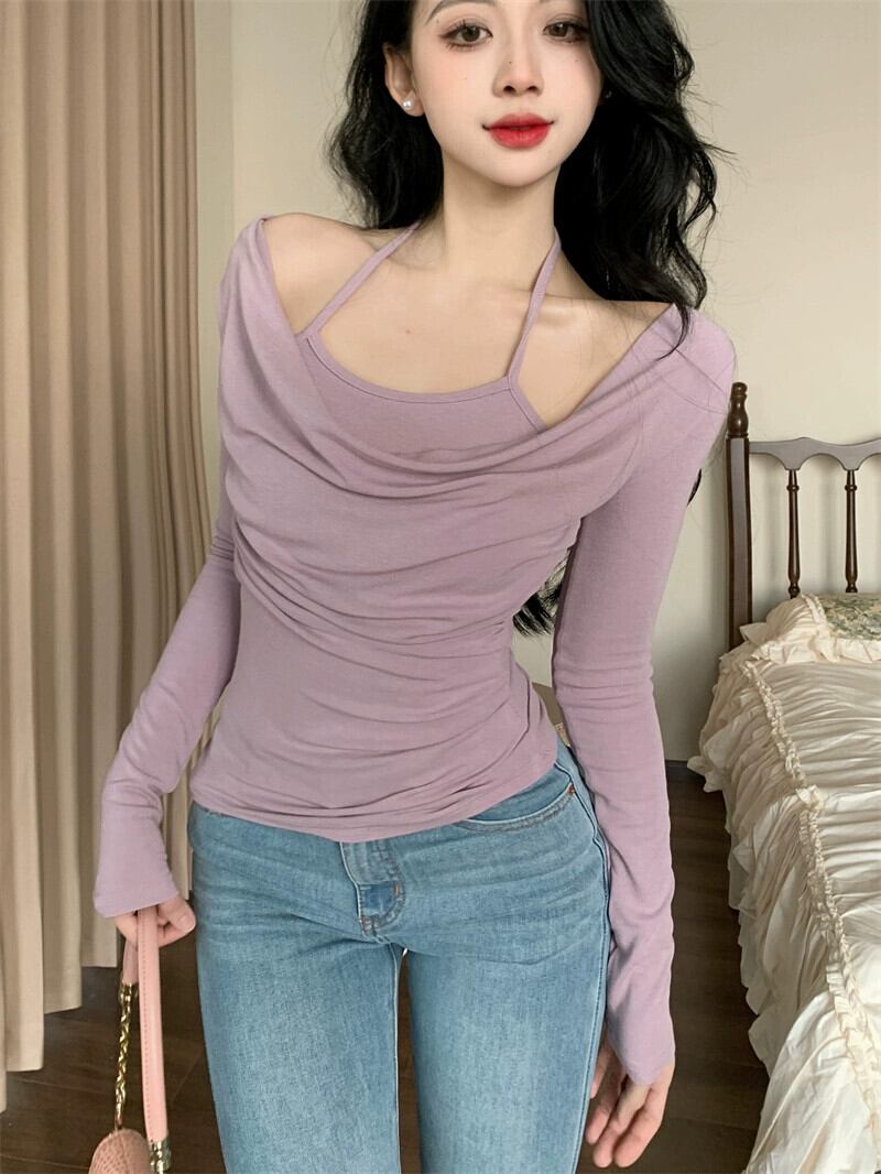 偽ツーピースホルターネックスイングカラーセーター女性 2024 春新作大きいサイズ脂肪ミリメートルセクシーなインナー長袖ボトシャツ ロング 大きめサイズ スプリング 春物 8884128805126001