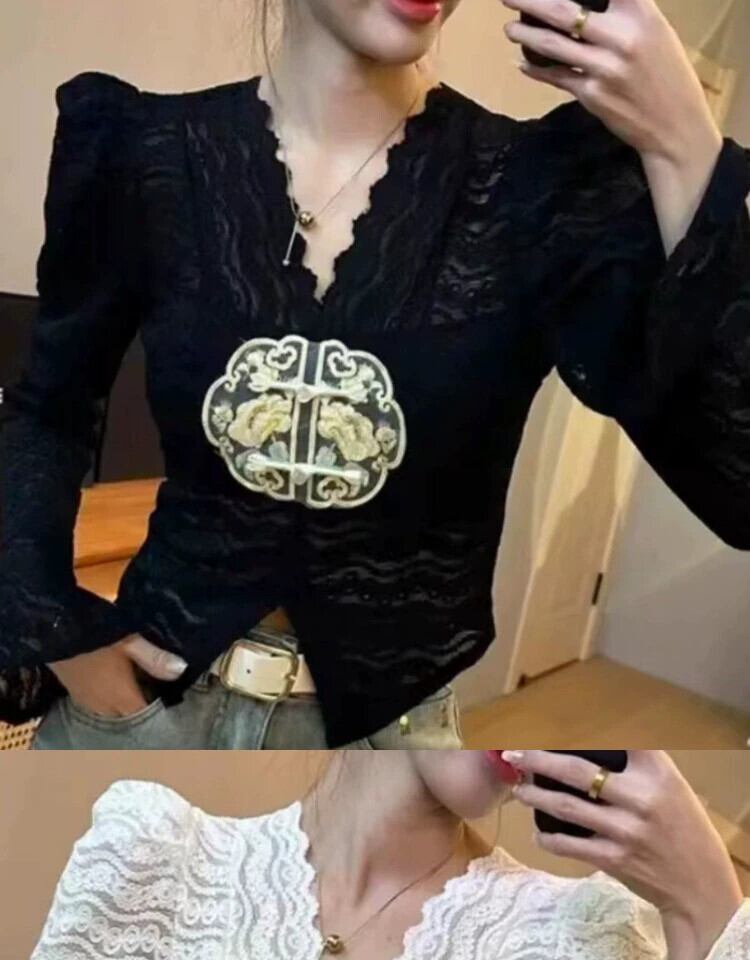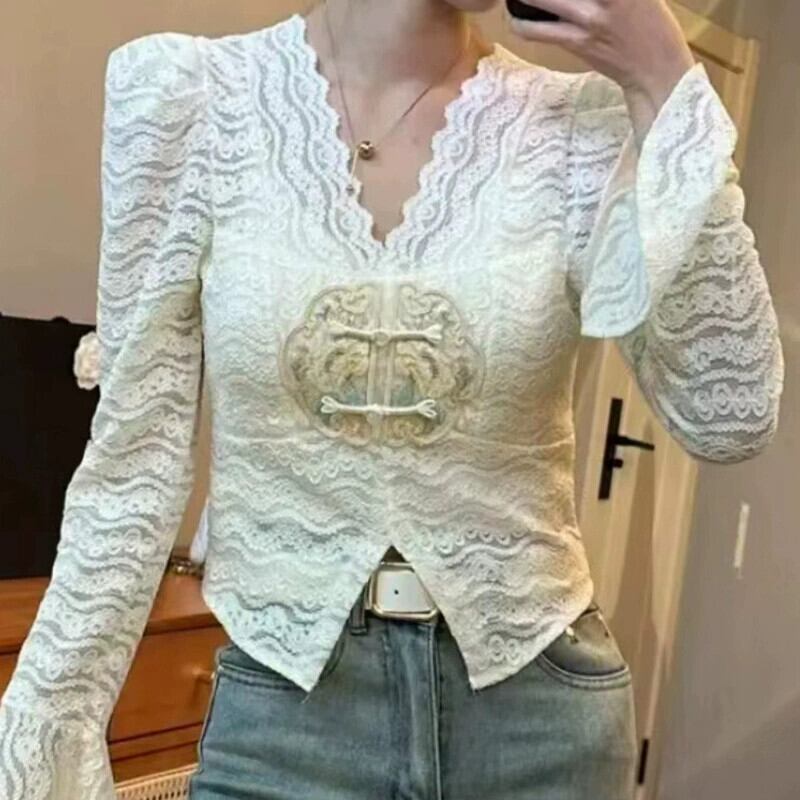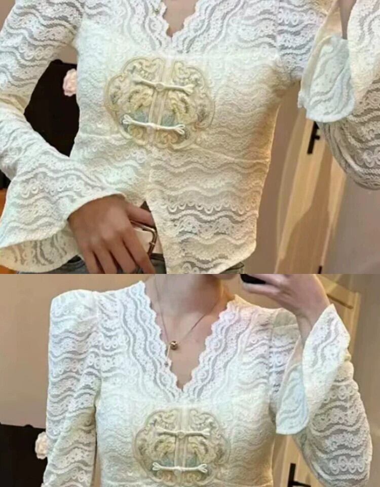 2024 中国風中空レース V ネックシャツ女性のスリムフィットショートボタントップ Vネック 888418045113997