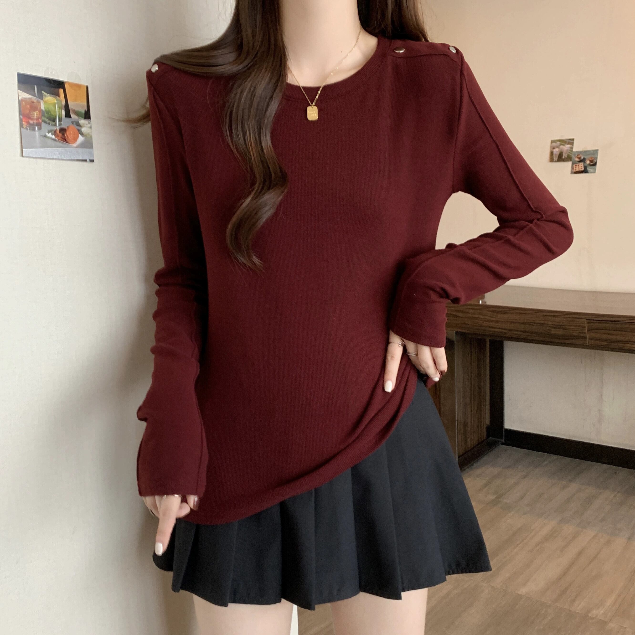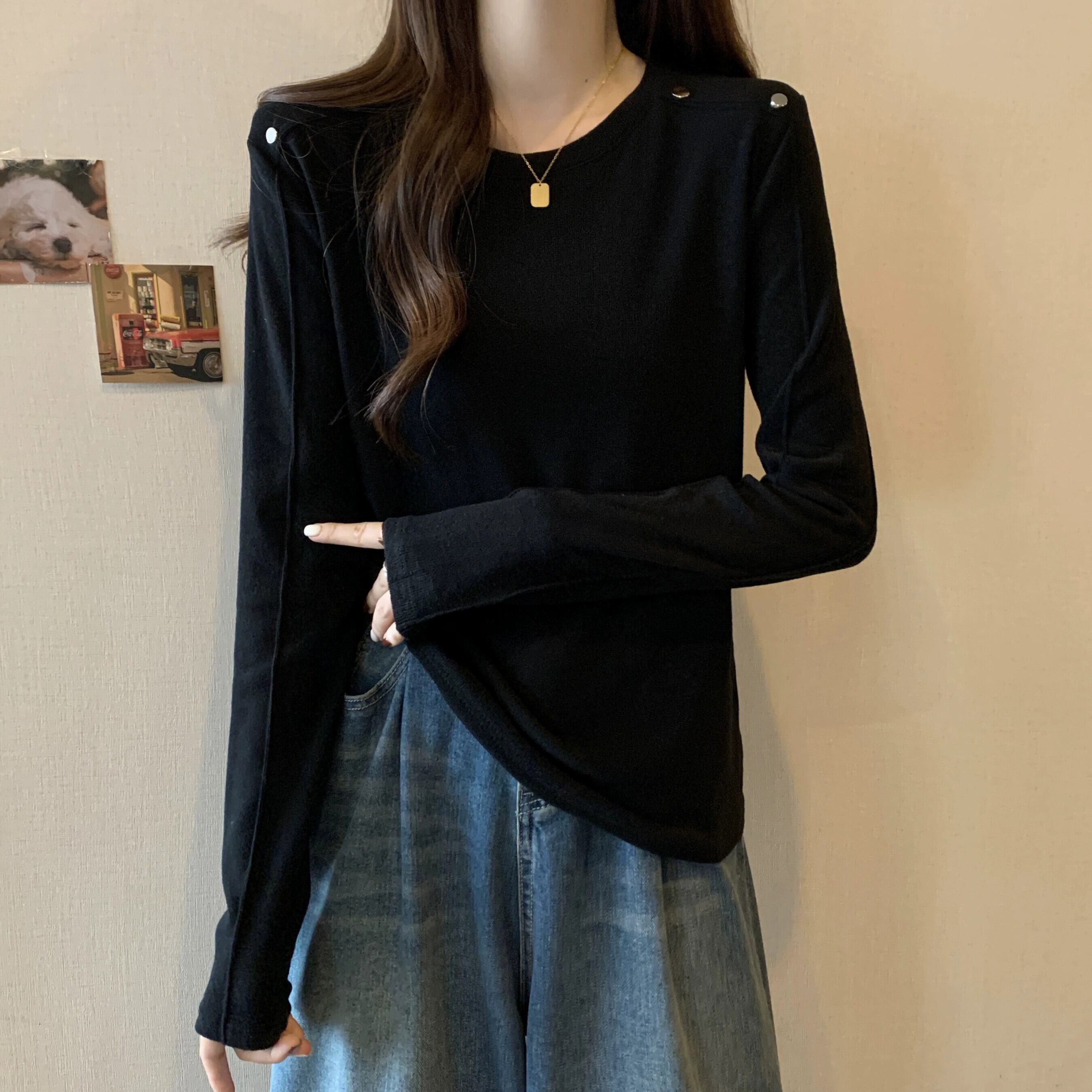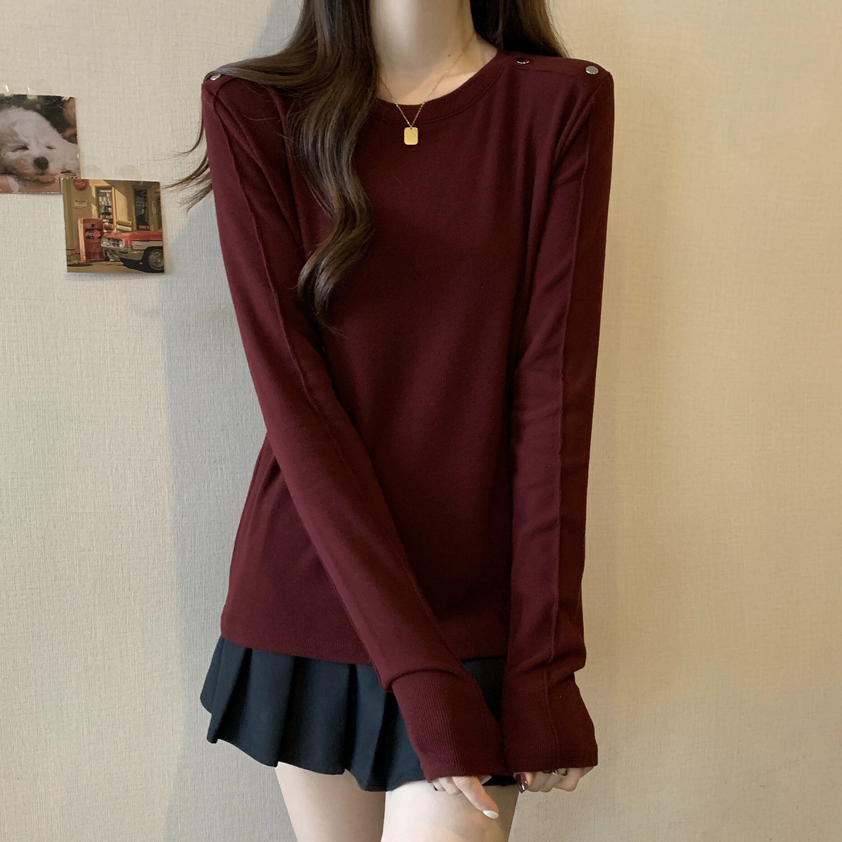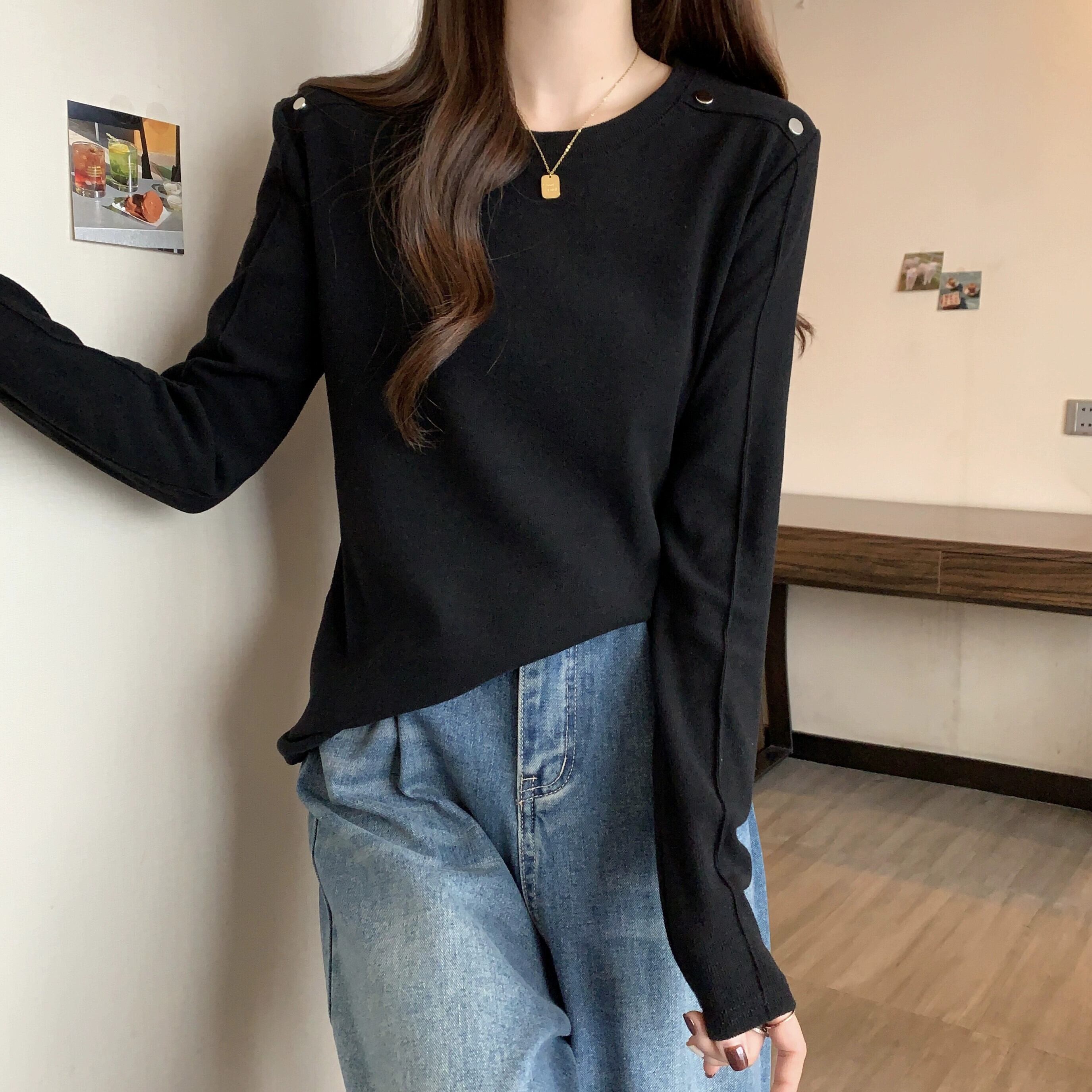 プラスサイズの婦人服 2024 春の新スタイルラウンドネック右肩デザイン無地ボトシャツ長袖トップトレンディな ロング 大きめサイズ スプリング 春物 Oネック ソリッドカラー 8884125210243014
