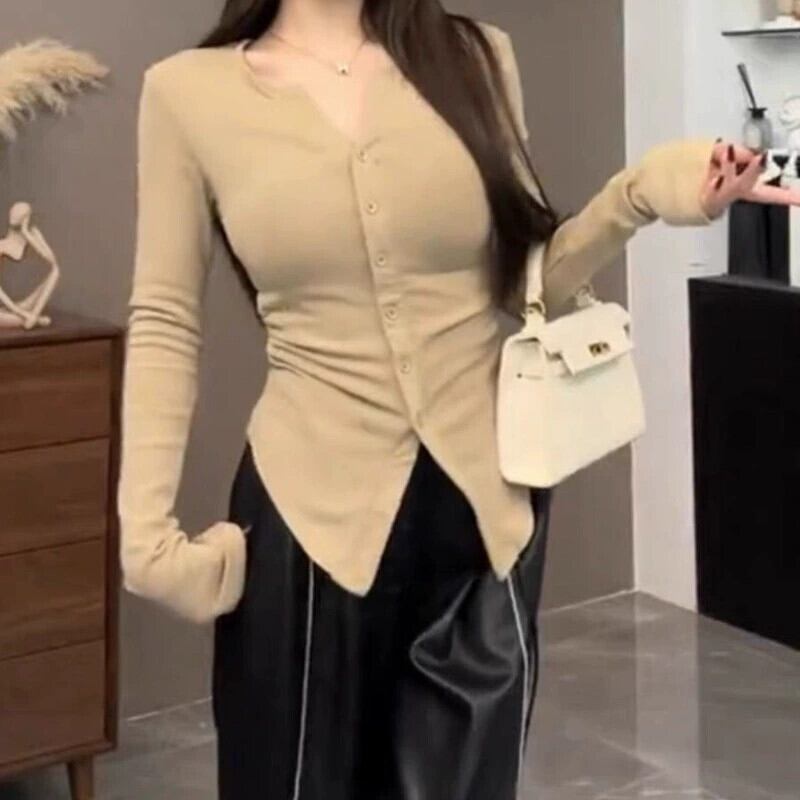 プラスサイズの女性のプリーツウエスト長袖 T シャツ春先の新しいスタイル少し太い mm 痩身インナー重ね着シックな V ネックトップ ロング 大きめサイズ スプリング 春物 Vネック Tシャツ 8884193642842841