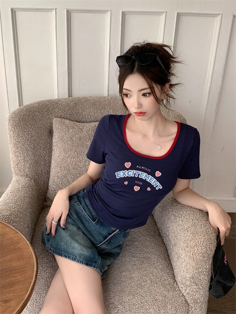 プラスサイズの婦人服ファット mm 夏新 2024 アメリカン U ネック半袖 T シャツ肩デザインスリムショートトップ 大きめサイズ サマー 夏物 Tシャツ 8884134292952461