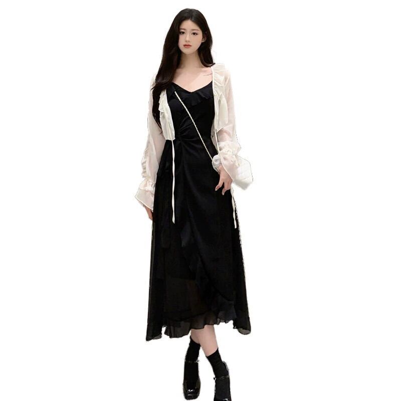 色:カーディガン,パープルパウダースカート,黒いドレス