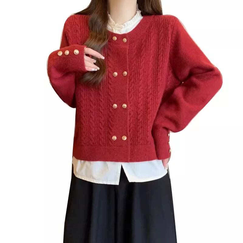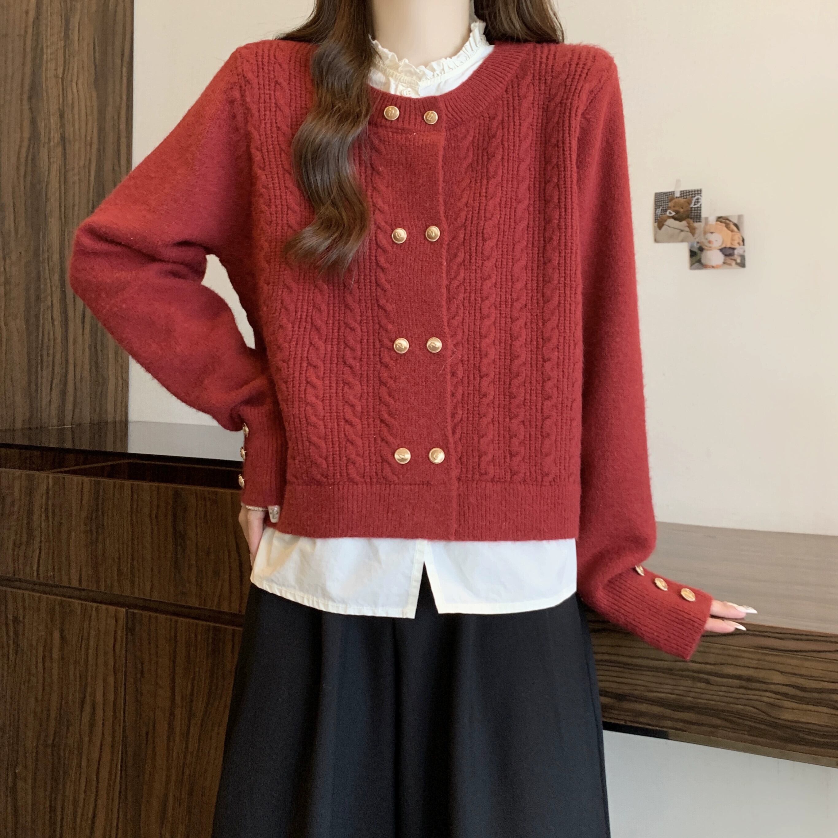 大きいサイズ 2023 春の新スタイルファット MM 婦人服デザインステッチ赤新年着用偽ツーピースニットセーター レッド 大きめサイズ スプリング 春物 8884182802125905