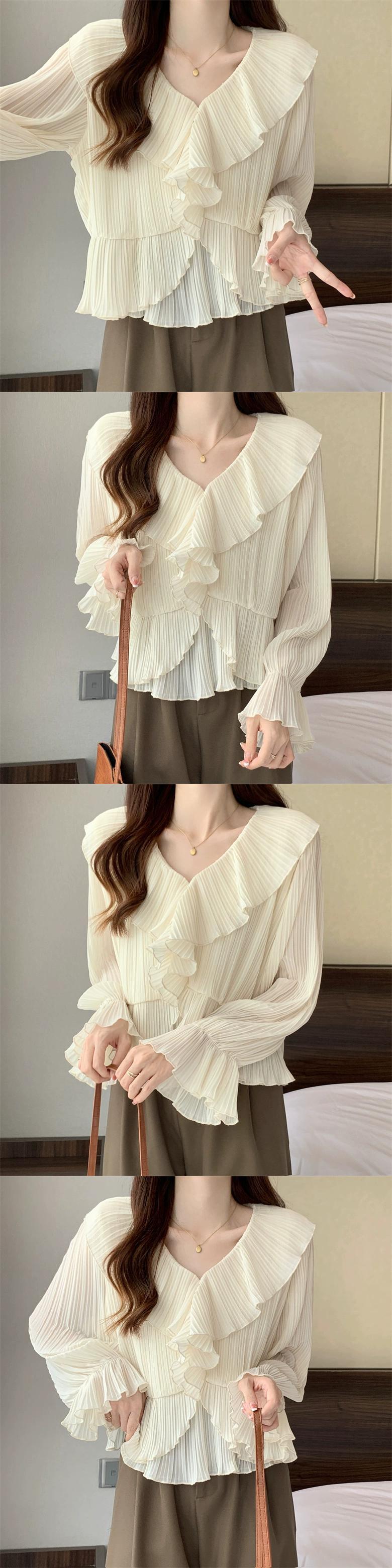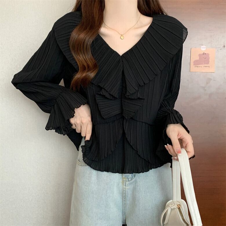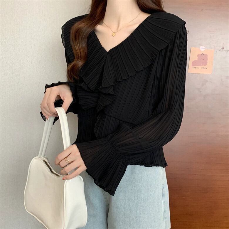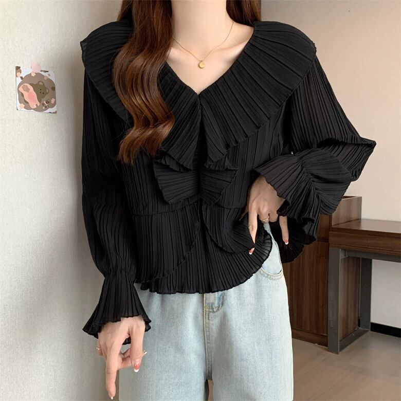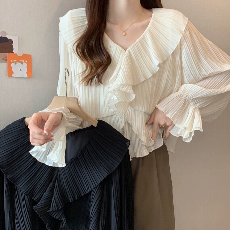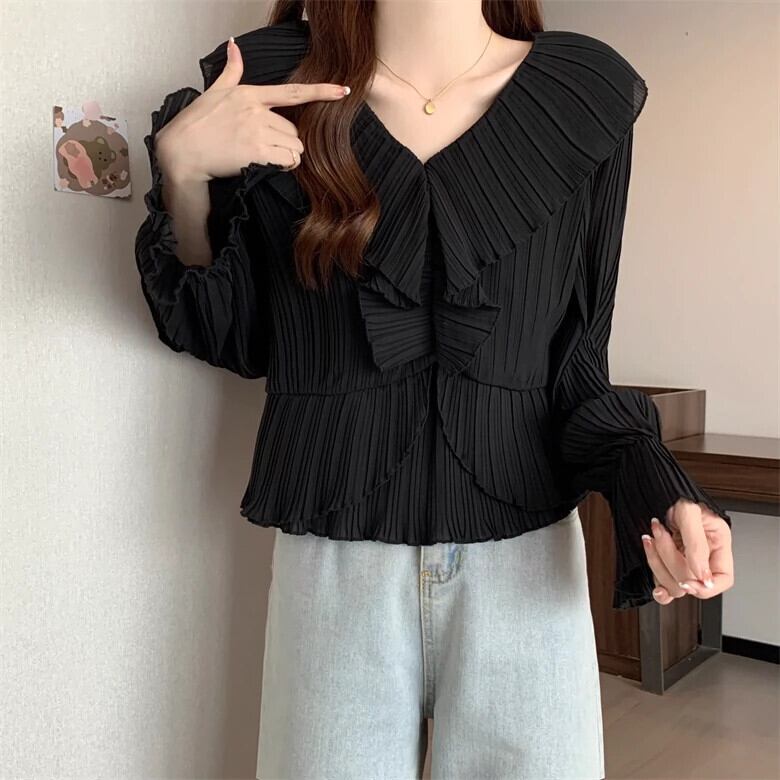 プラスサイズの女性の脂肪 mm 春の新スタイル 2024 ファッショナブルなプリーツフリルシフォンシャツ V ネックスリム長袖トップ ロング 大きめサイズ スプリング 春物 Vネック 8884145609604585