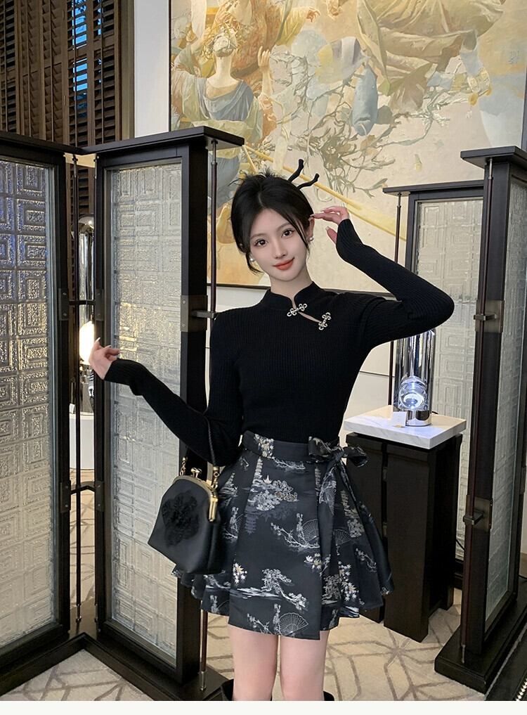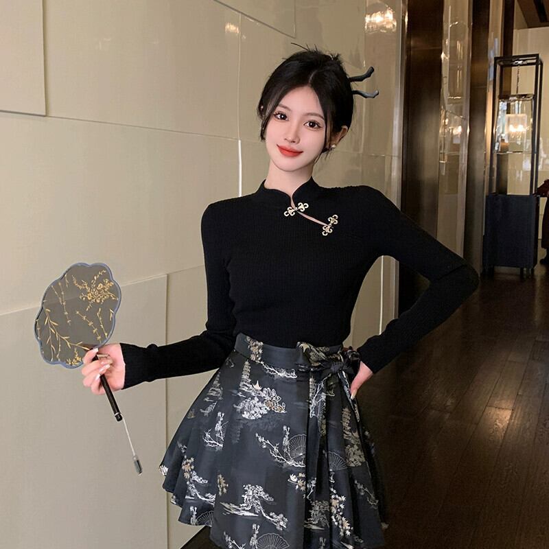 プラスサイズの女性の春の新中国風ディスクバックルボトミングニットトップ痩身国民スタイルプリーツ馬の顔ショートスカート 2 点セット 大きめサイズ スプリング 春物 8884199370841464