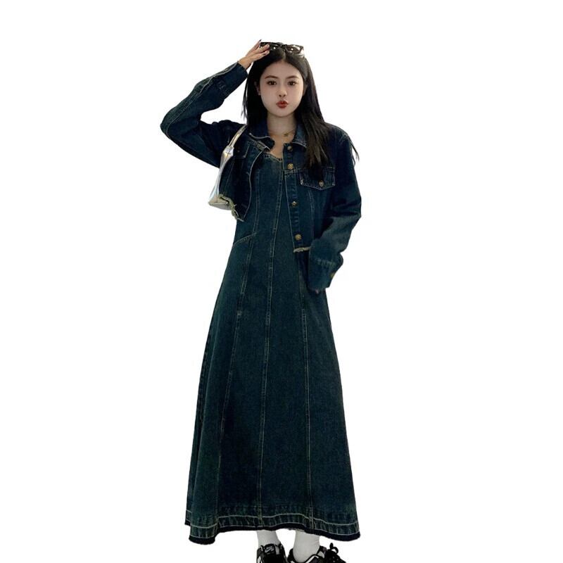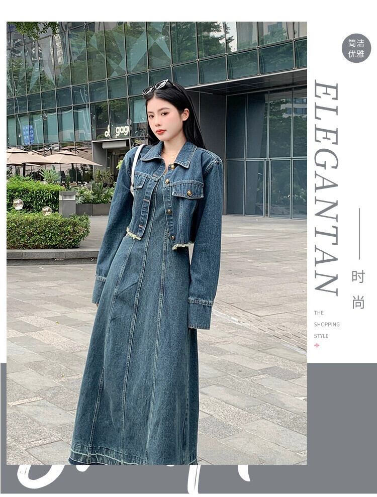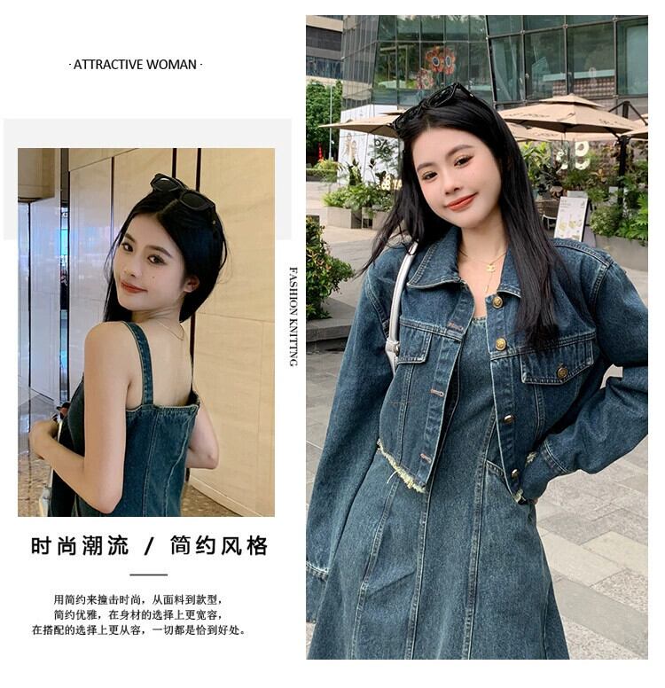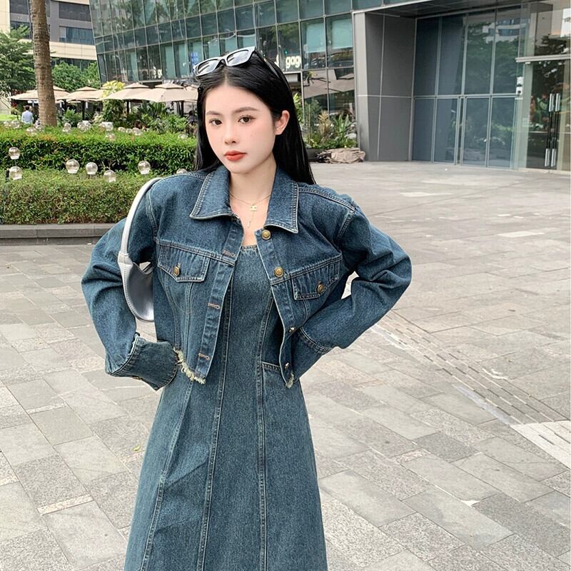 プラスサイズの女性の脂肪 mm 春の新スタイル 2024 レトロデニムジャケットファッションサスペンダーデニムドレス 2 点セット 大きめサイズ スプリング 春物 8884155335930093