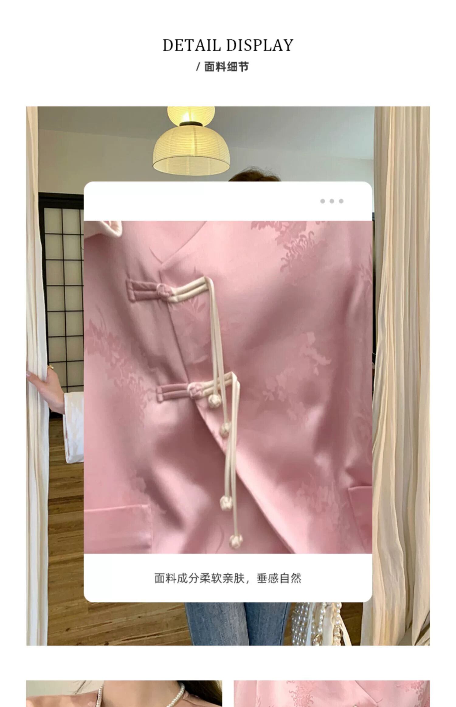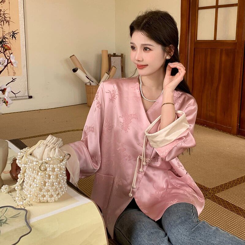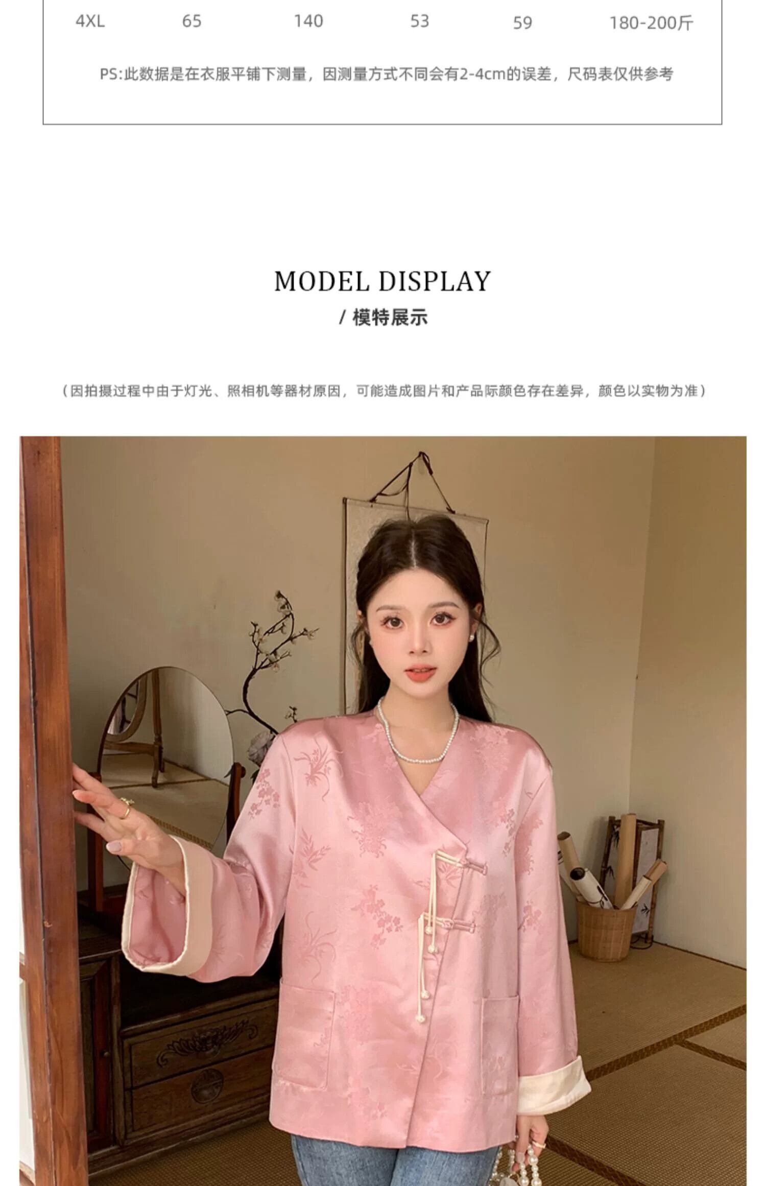 プラスサイズの女性の新しい中国風ボタンダウン長袖 V ネックシャツ春ピンク底シャツ脂肪 mm 気質トップ ロング 大きめサイズ スプリング 春物 Vネック 8884166951338794