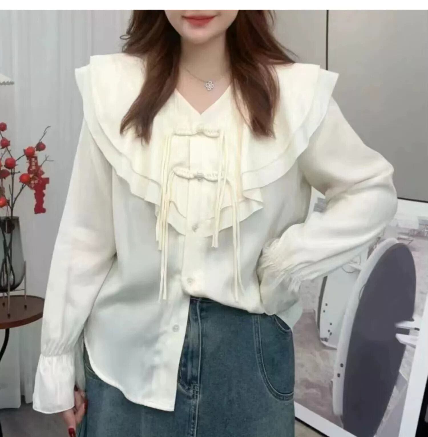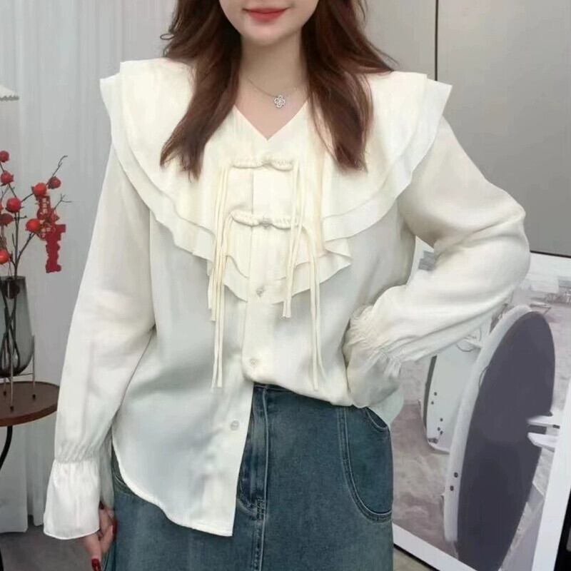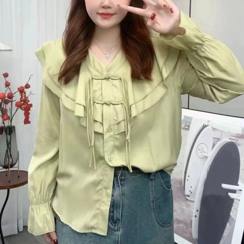 プラスサイズの女性の脂肪mm新春と新中国風プレートボタン甘い長袖シャツデザイン無地ルーズカーディガン ロング 大きめサイズ 大人ガーリー スウィート キュート カジュアル スプリング 春物 ソリッドカラー 8884182858952037