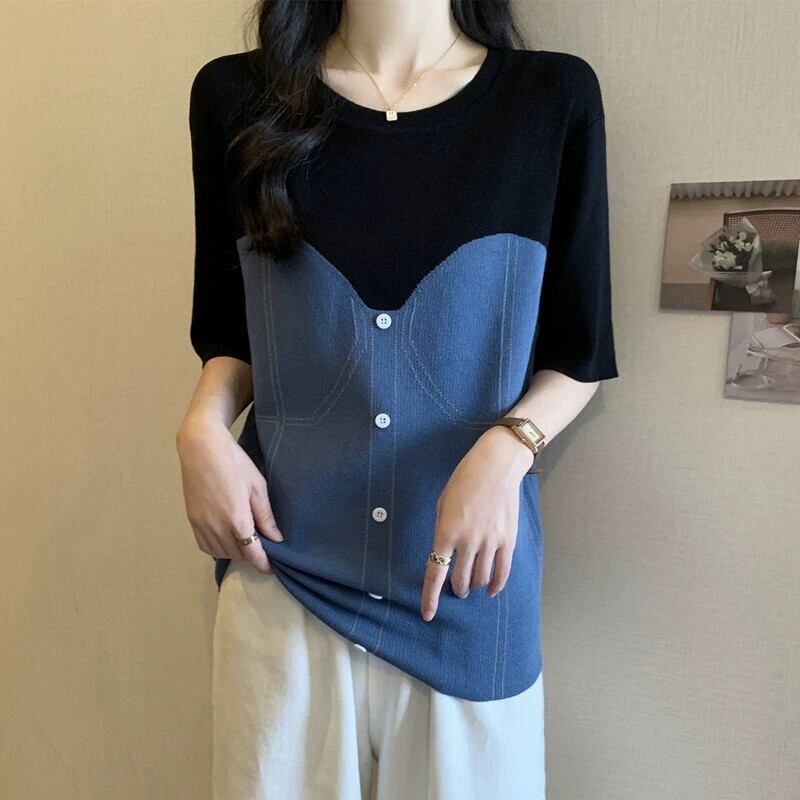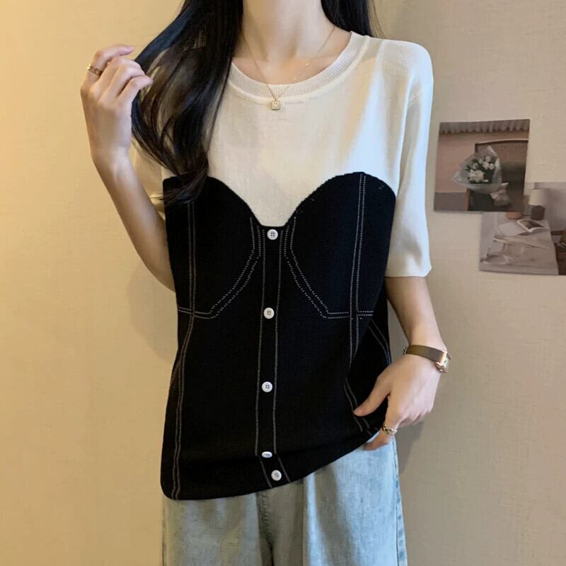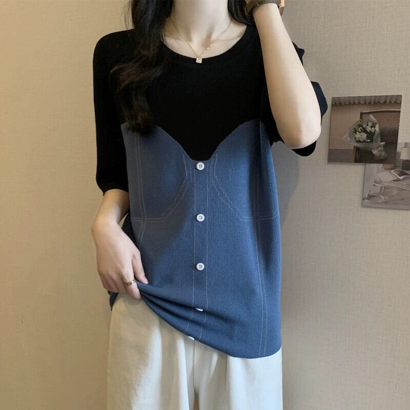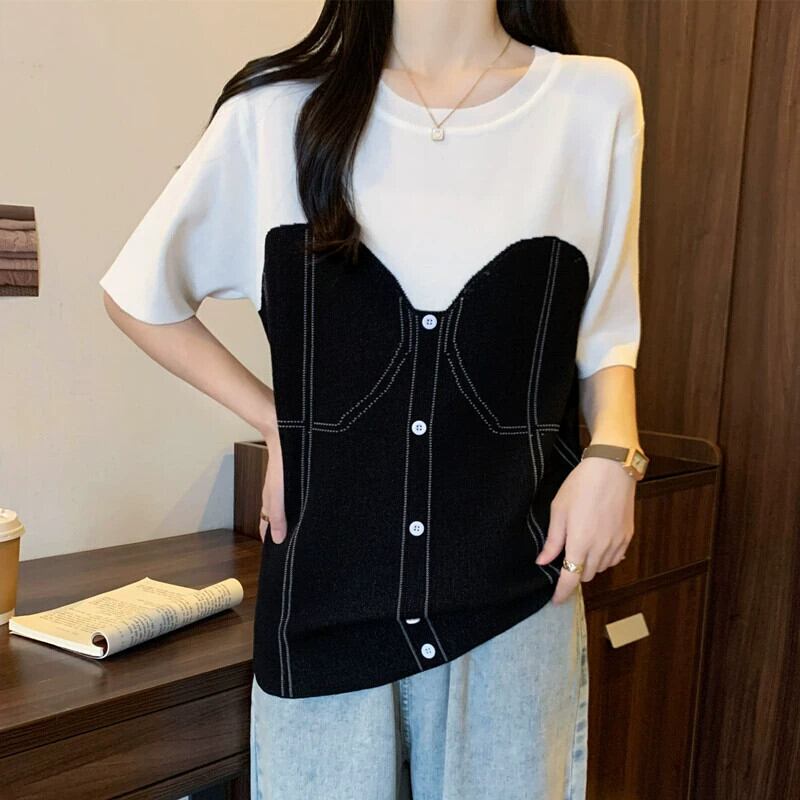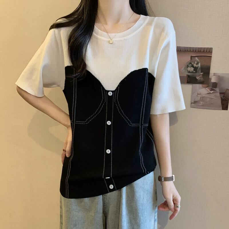 プラスサイズの婦人服ファット mm 夏新 2024 デザインラウンドネック偽ツーピース半袖 T シャツスリムで多目的トップス 大きめサイズ サマー 夏物 Oネック Tシャツ 8884192948226512