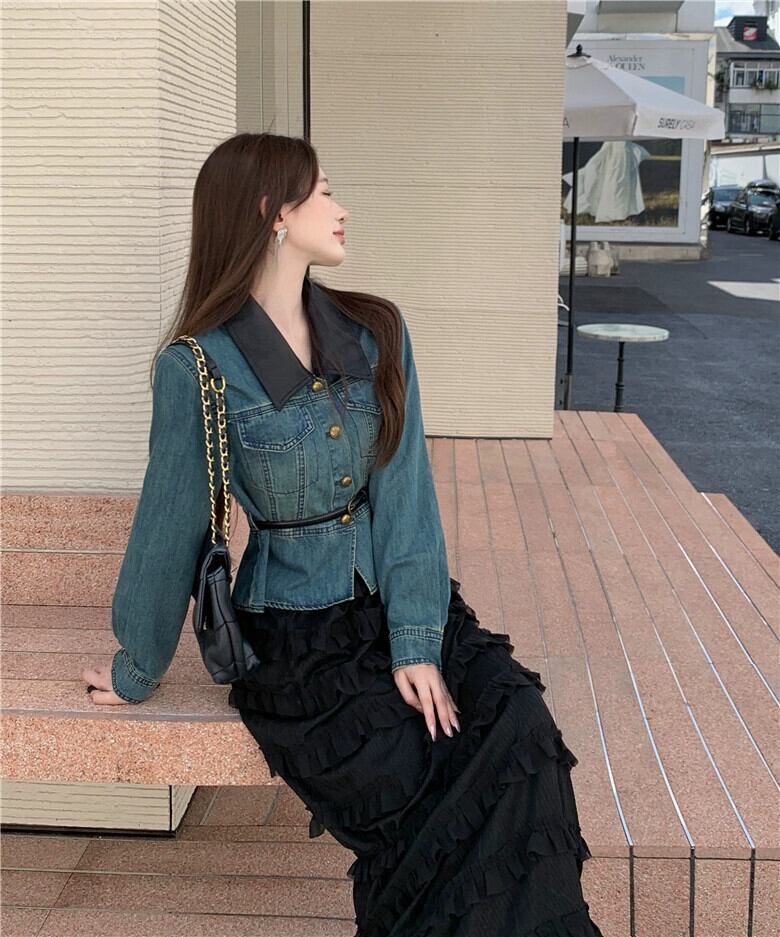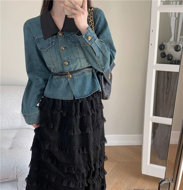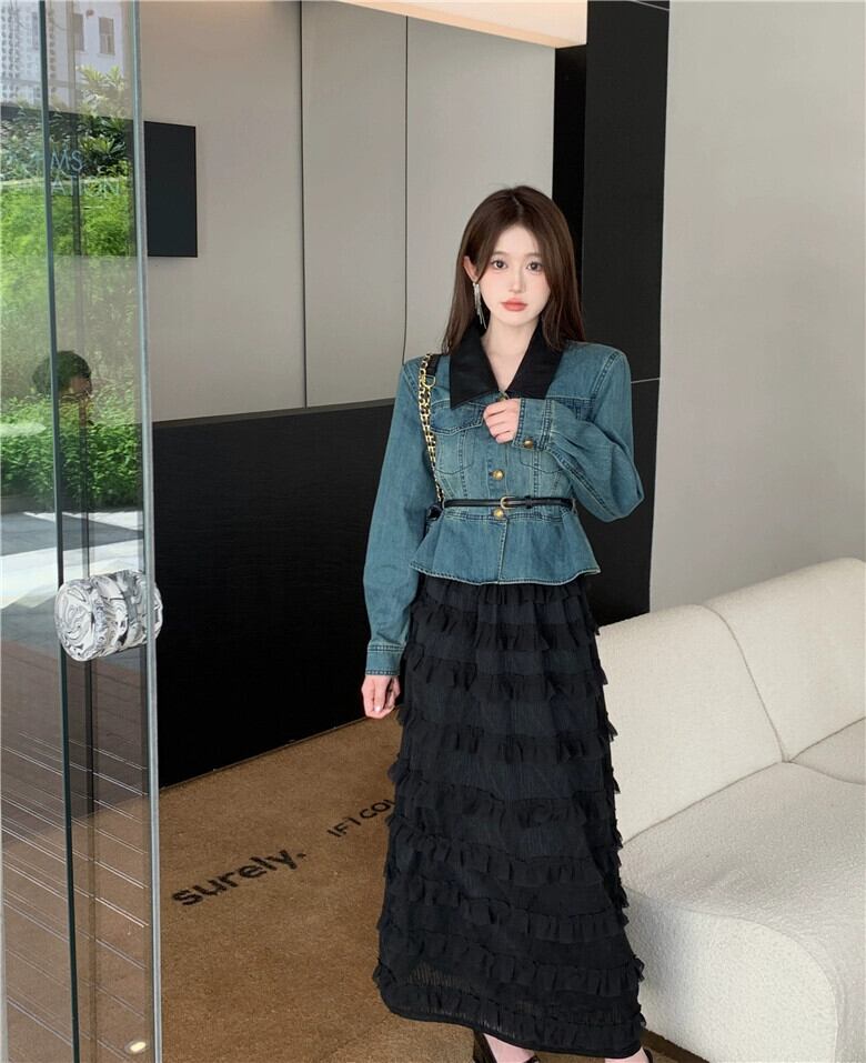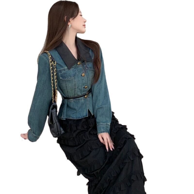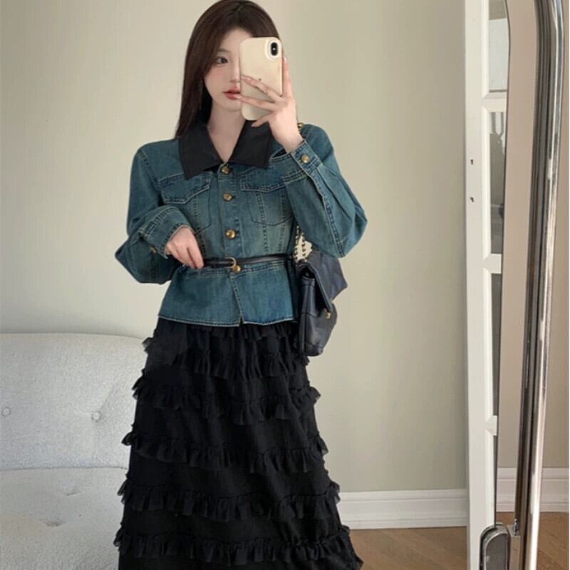 プラスサイズの女性のレトロなデニムシャツジャケット痩身フレンチスイートケーキスカート春ツーピーススーツ 大きめサイズ 大人ガーリー スウィート キュート カジュアル スプリング 春物 8884174056057426