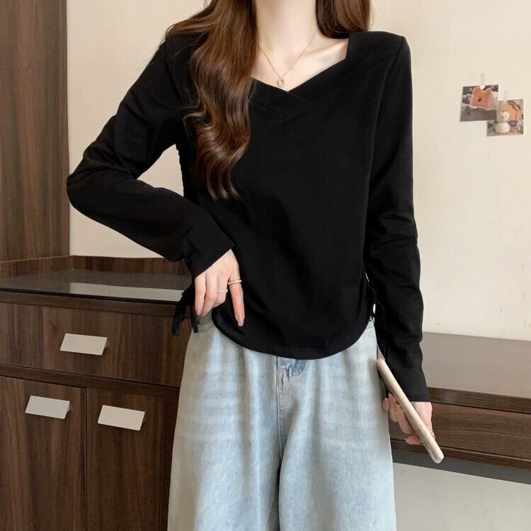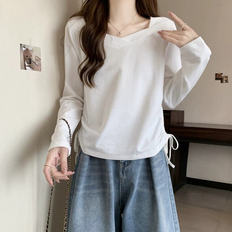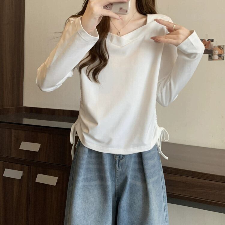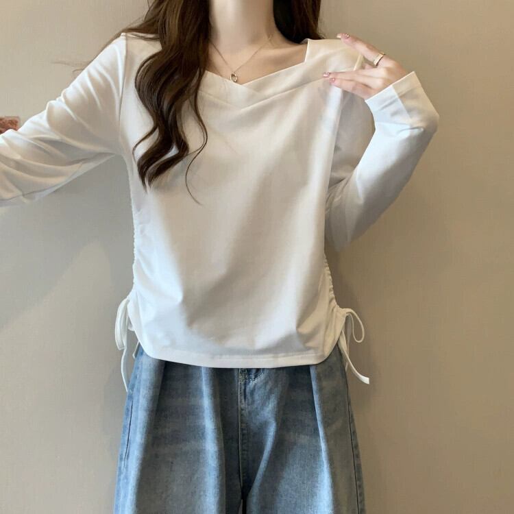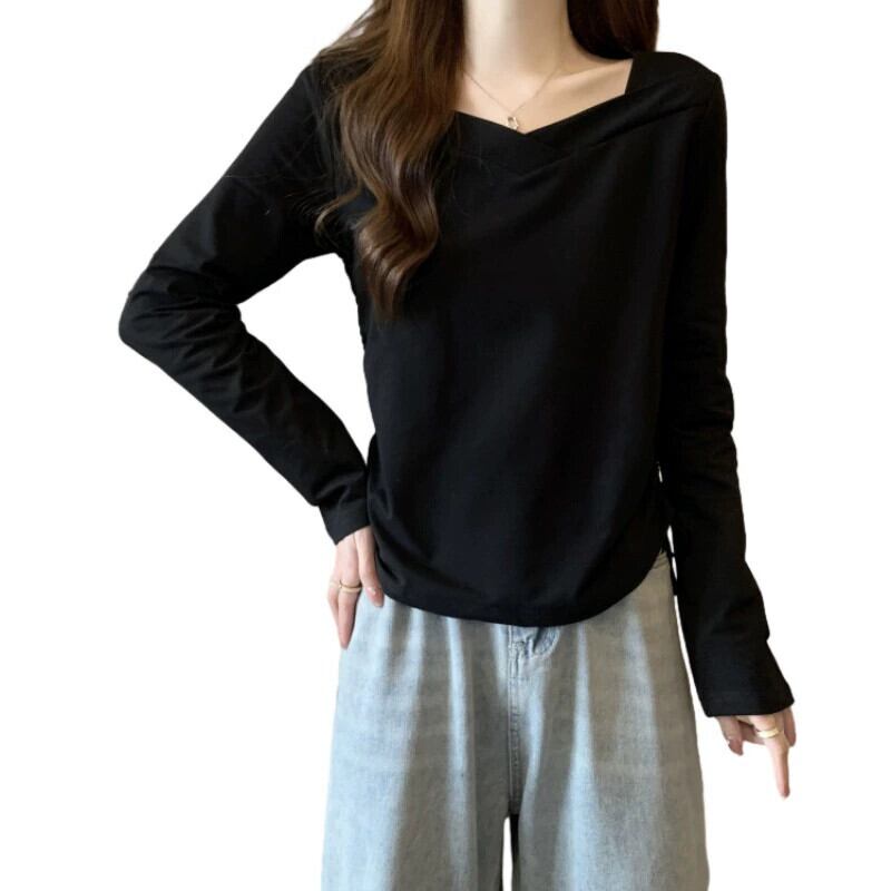 プラスサイズの婦人服ファット mm 2024 春の新ソリッドカラー痩身トップス気質長袖右肩底 T シャツ ロング 大きめサイズ スプリング 春物 Tシャツ 8884123550692973