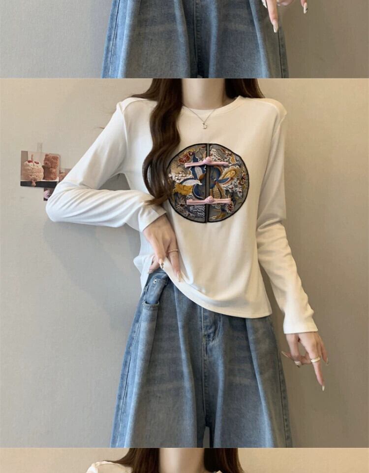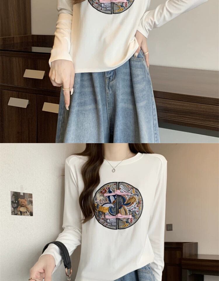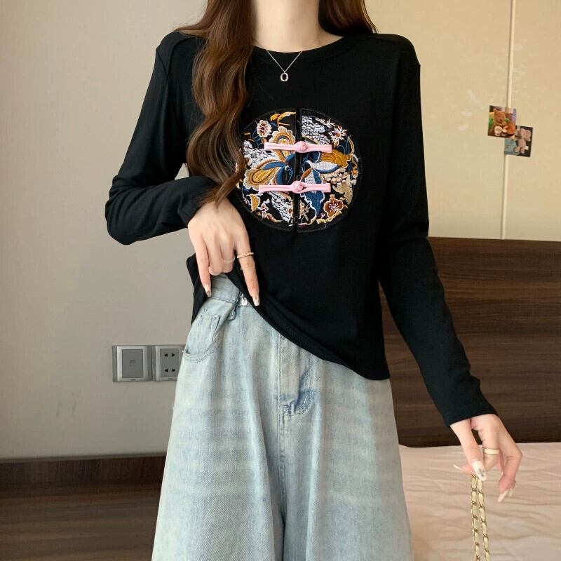 プラスサイズの女性のレトロ中国風のディスクボタン刺繍長袖 Tシャツ春と秋の脂肪 MM ウエスト痩身インナーレイヤードシャツ ロング レッド 大きめサイズ スプリング 春物 オータム 秋物 888414682180367