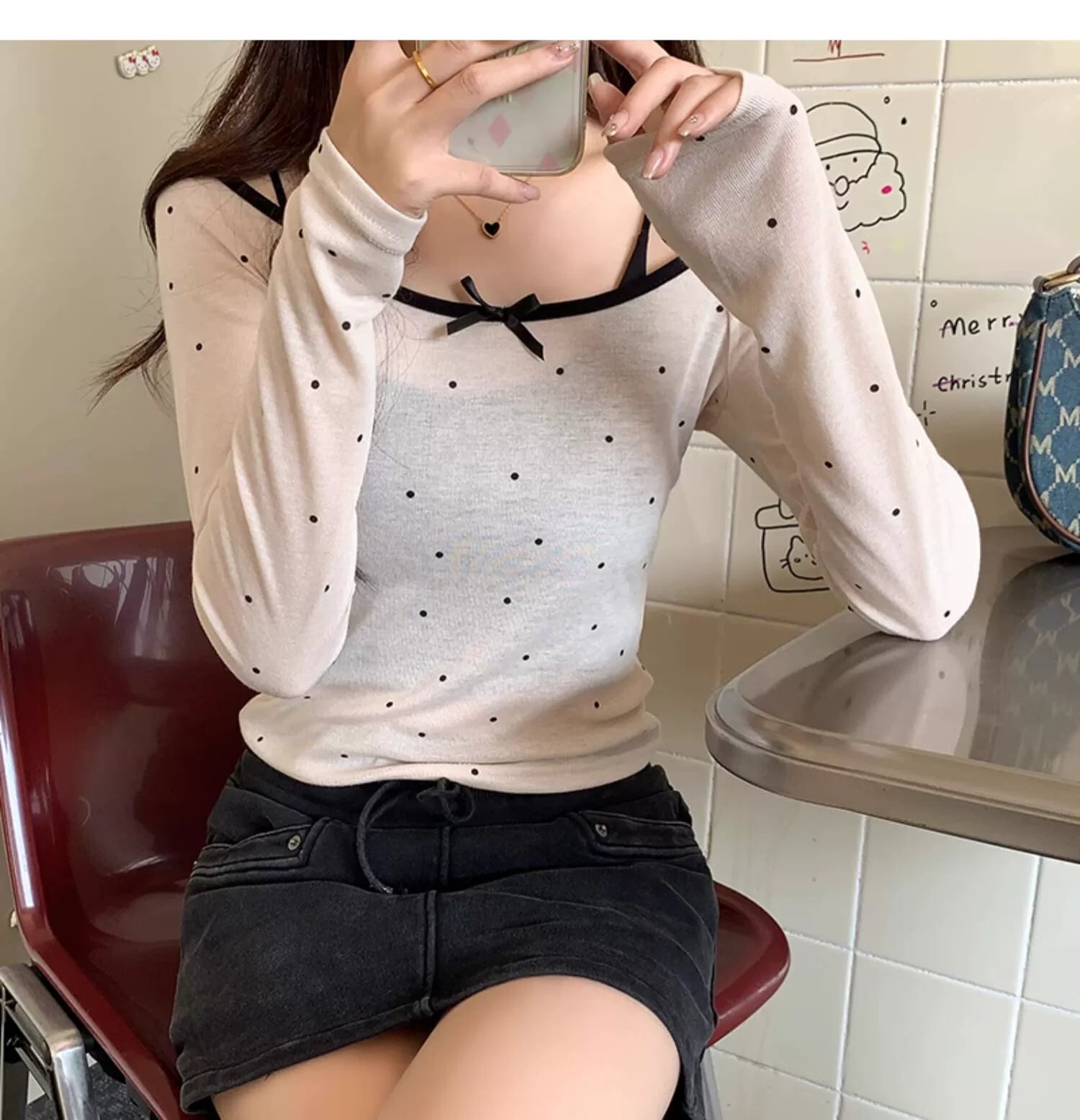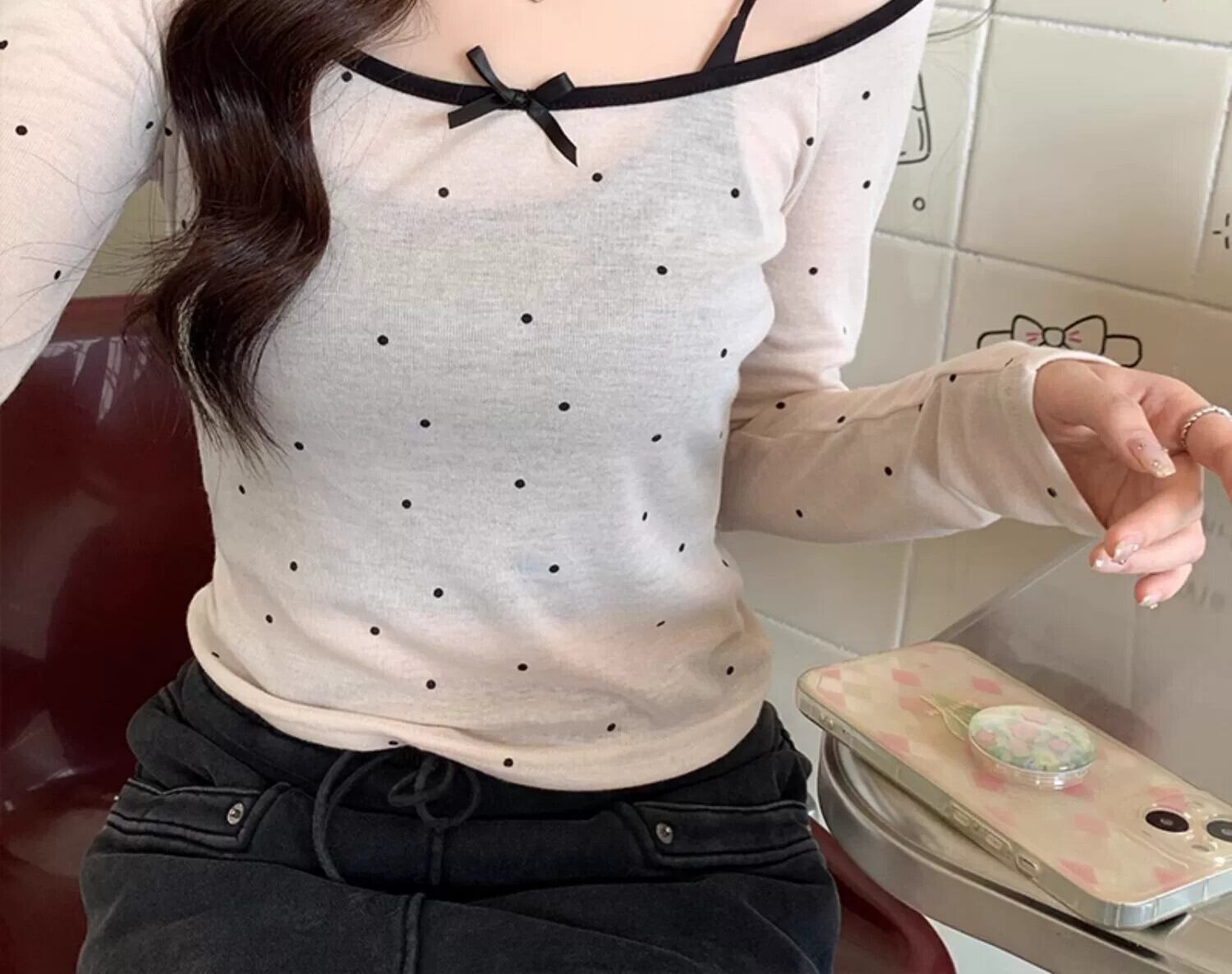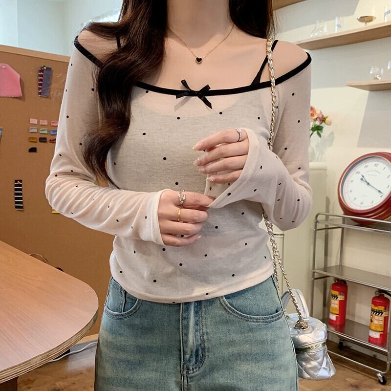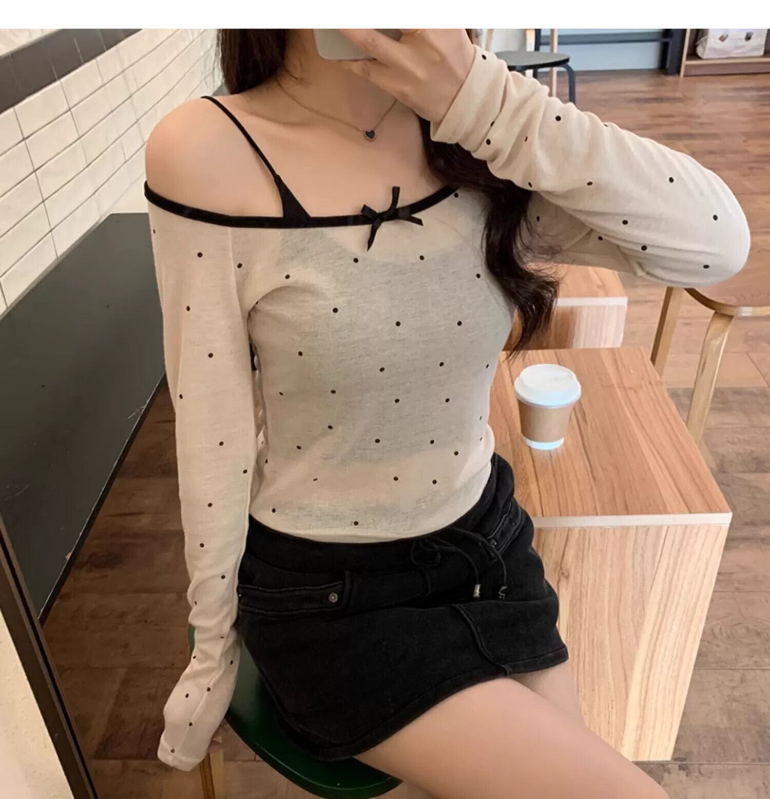 純粋な欲望のマイクロ透過性ウェーブドット弓カバー Tシャツボトリングシャツ女性 2024 初春の新しいレイヤードワンショルダートップ レッド リボン スプリング 春物 8884183241349600