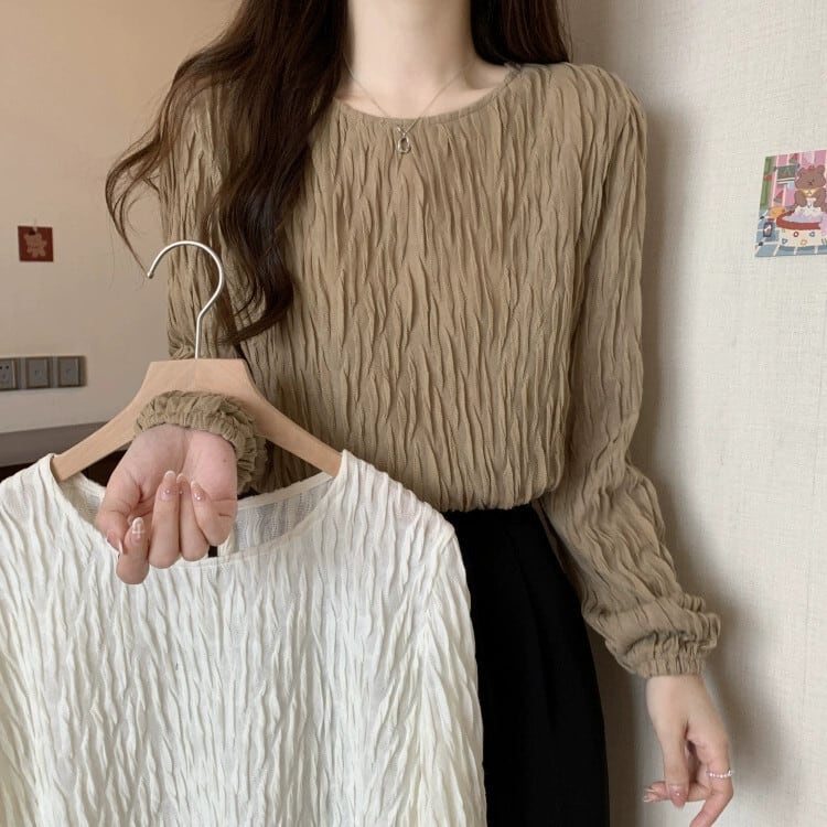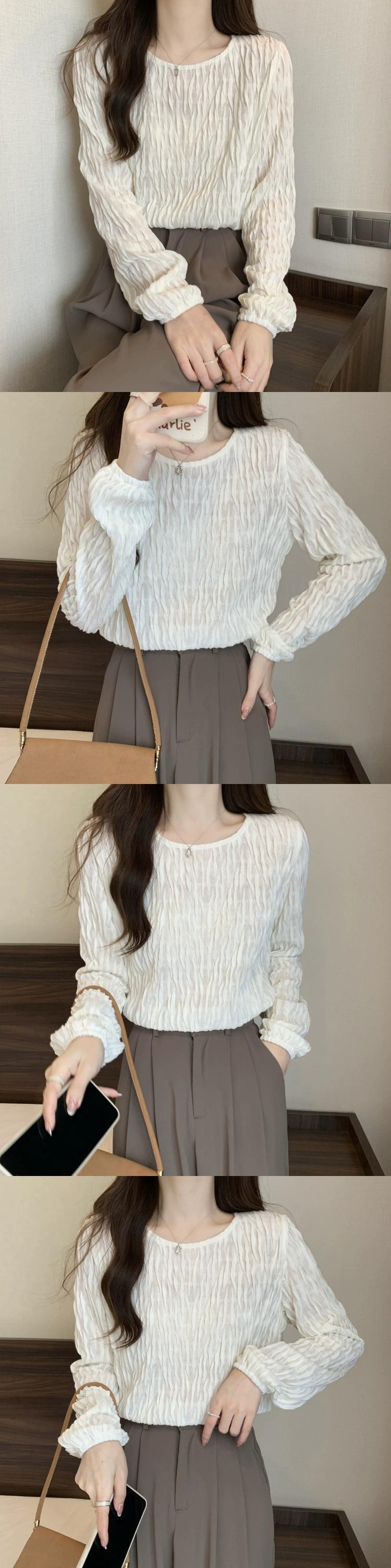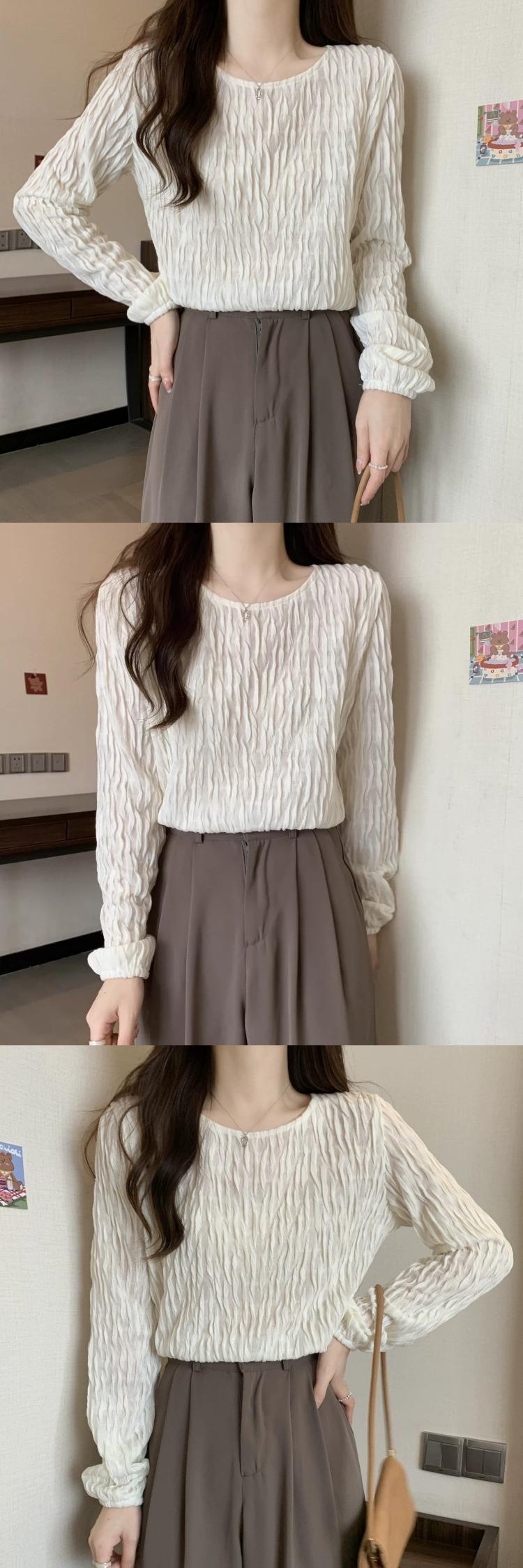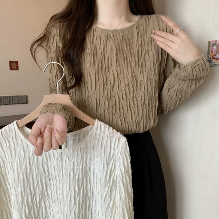 プラスサイズの婦人服脂肪春の新 2023 デザインシンプルなプリーツ無地ラウンドネック長袖 Tシャツトップス ロング 大きめサイズ スプリング 春物 Oネック ソリッドカラー 8884116054783187