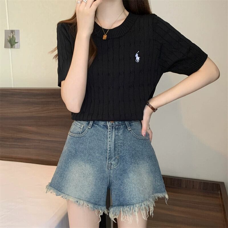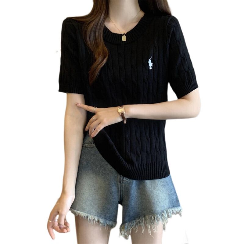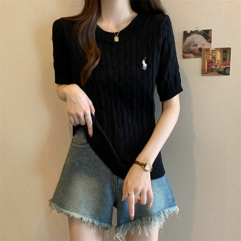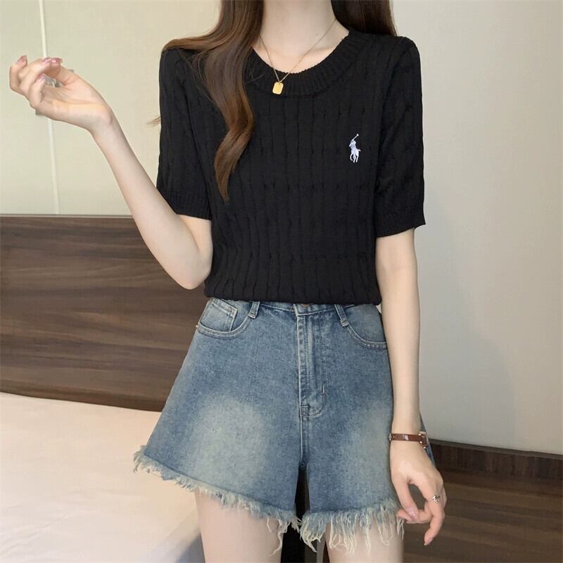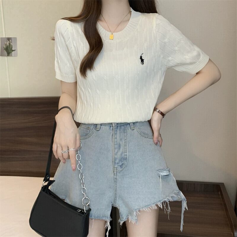 プラスサイズの婦人服ファットミリメートル春の新 2024 刺繍ツイスト半袖セーター Tシャツラウンドネック底トップ女性 レッド 大きめサイズ スプリング 春物 Oネック 8884142104587557