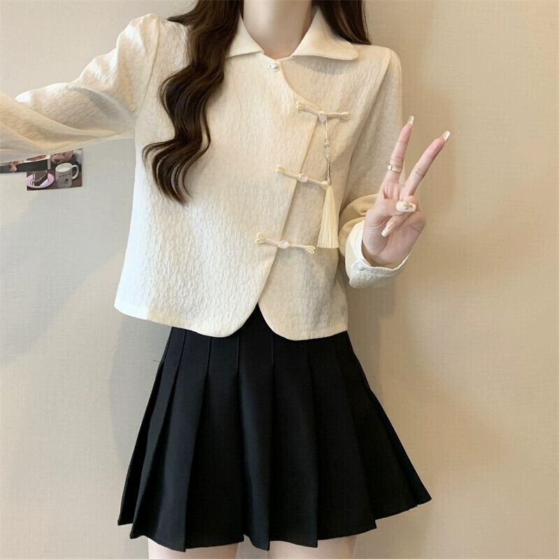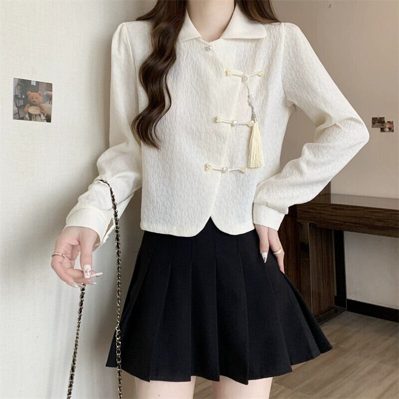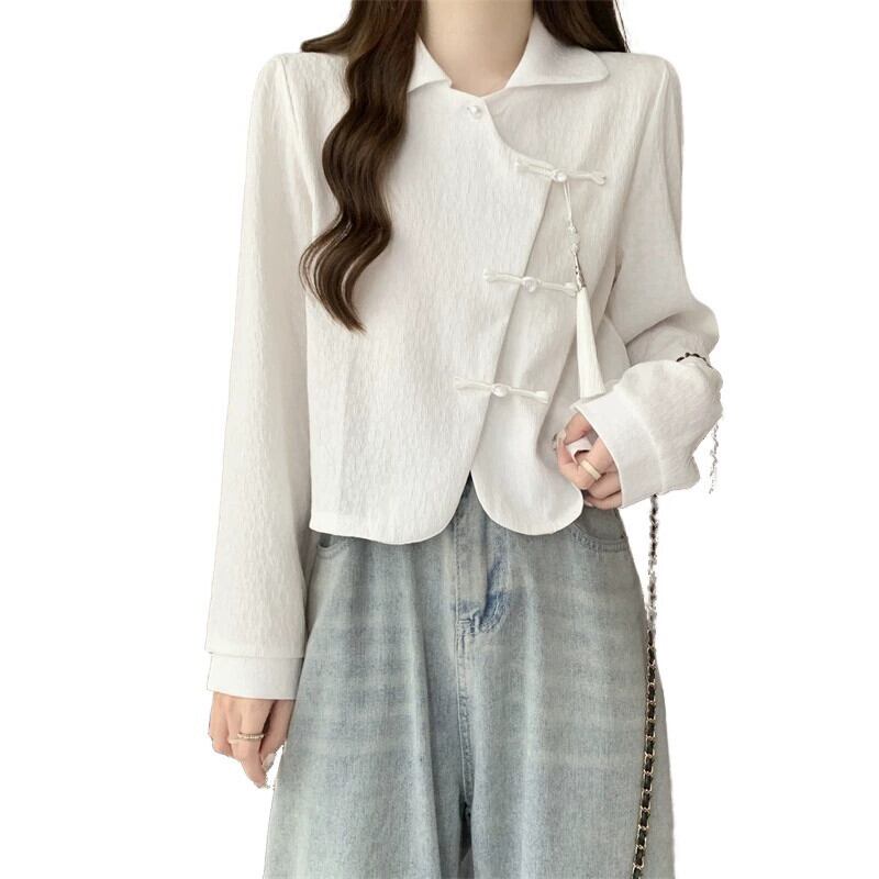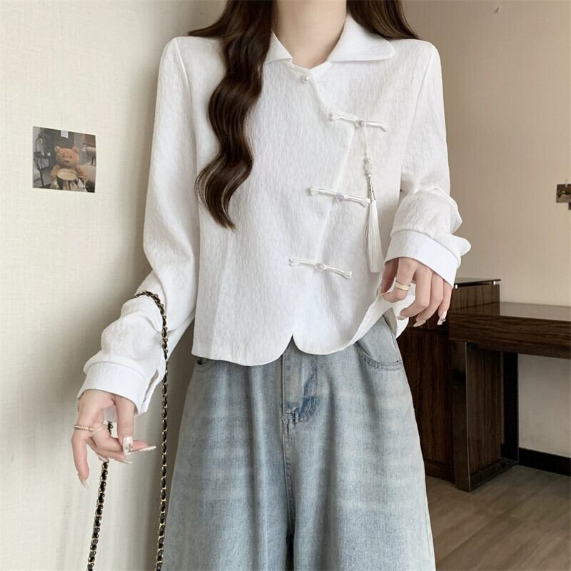 大きいサイズの新しい中国のボタンダウン長袖シャツ中国風の女性の春の脂肪mm右肩ポロカラー短い気質トップ ショート ロング 大きめサイズ スプリング 春物 8884147440895488