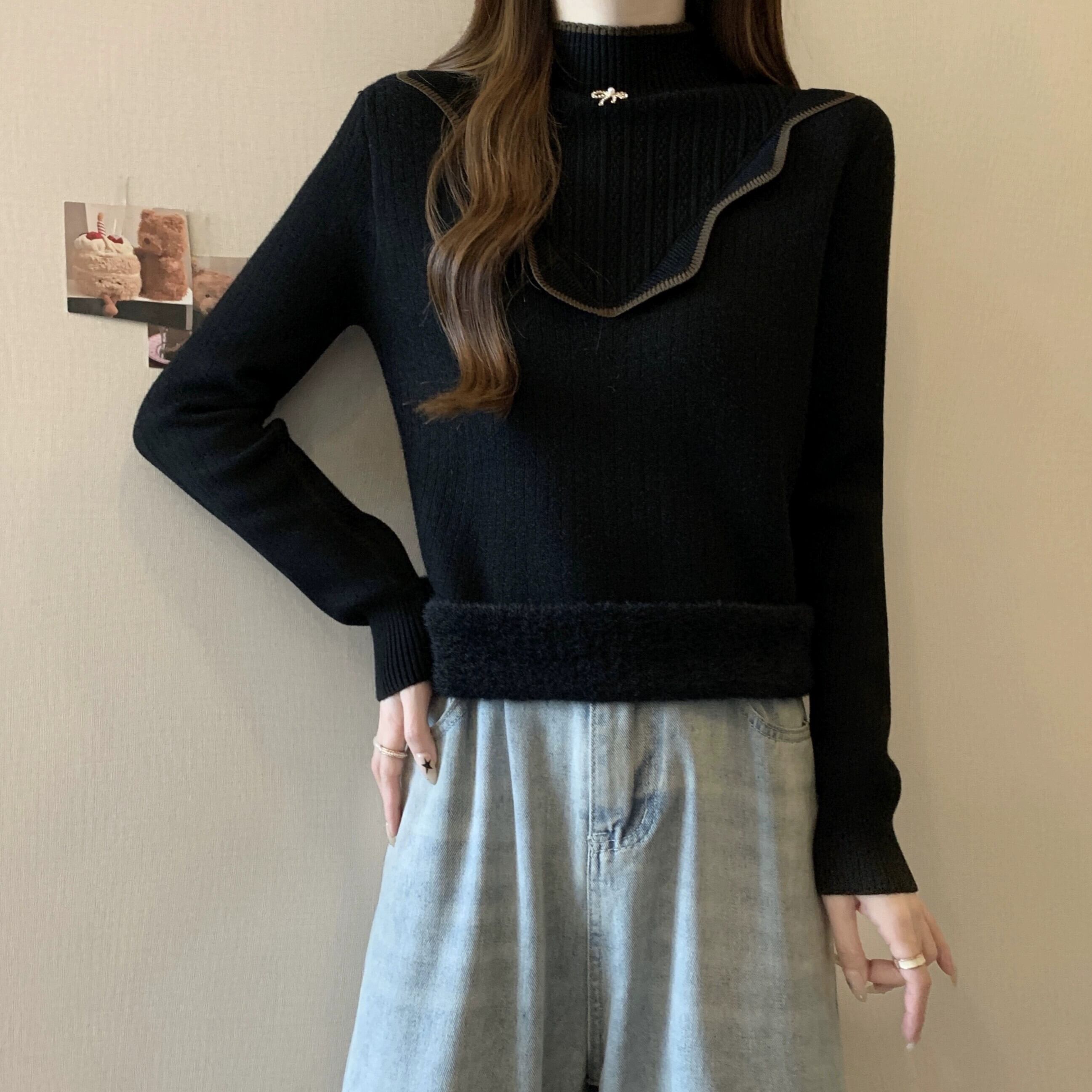 大きいサイズのハーフタートルネックオールインワンベルベットセーターレディース秋冬プラスベルベット肥厚ボトムシャツ、ハイエンド、アインスタイルインナートップ 大きめサイズ オータム 秋物 ウィンター 冬物 8884110618965634