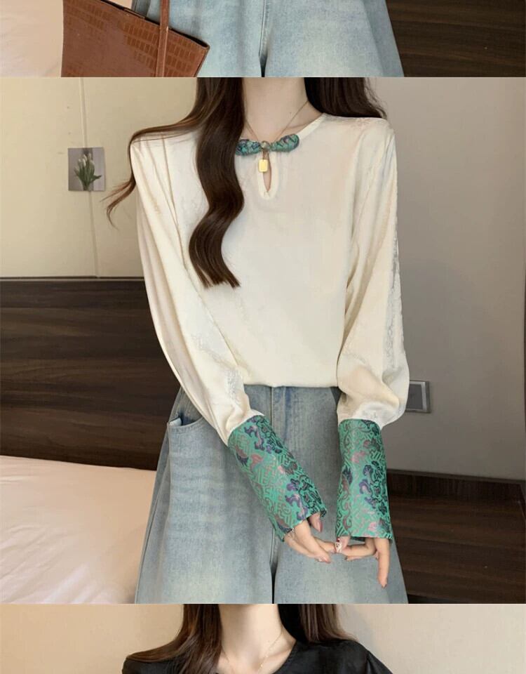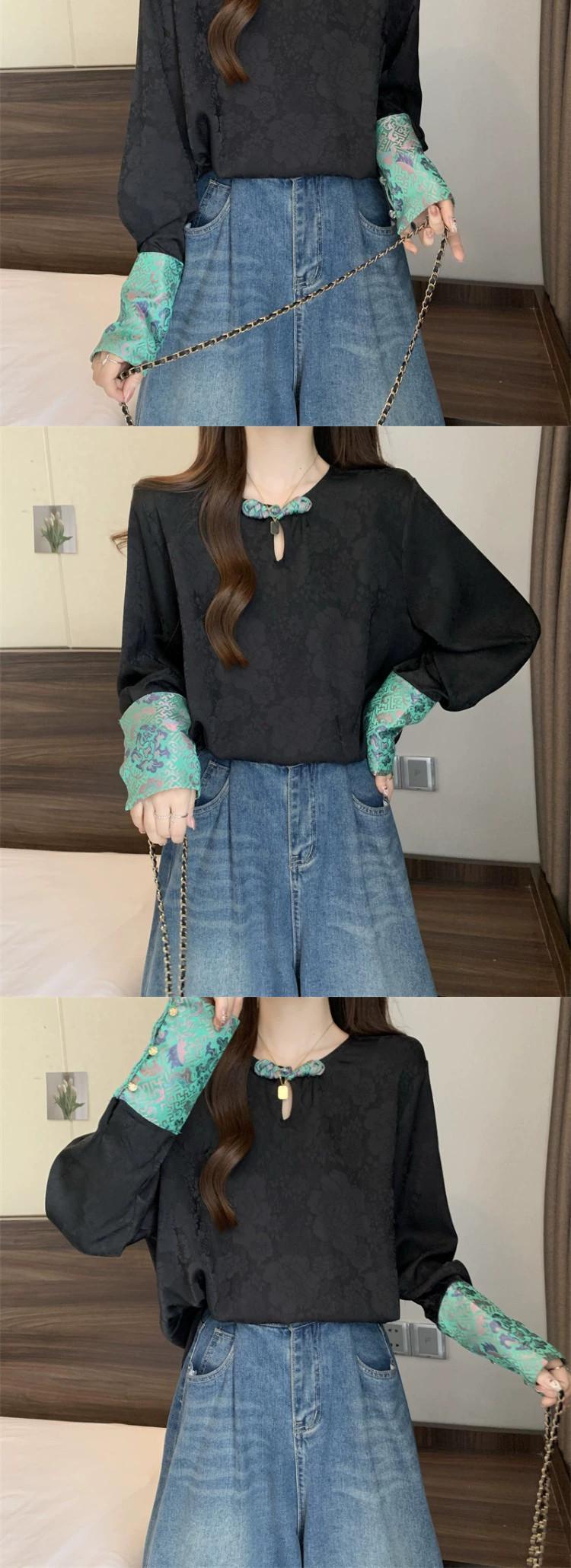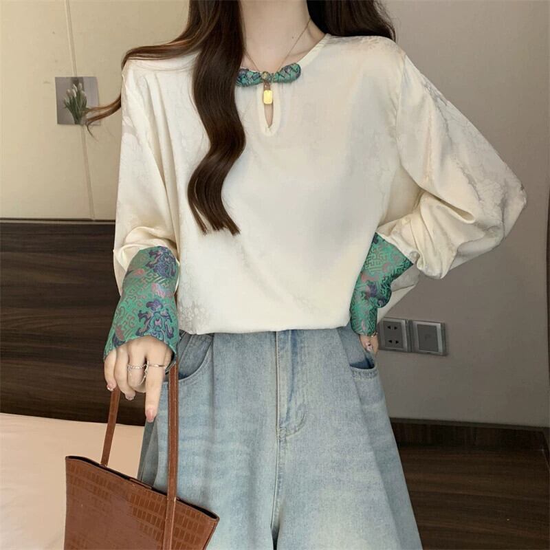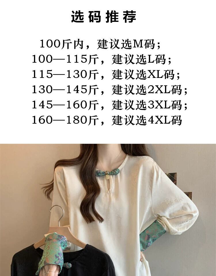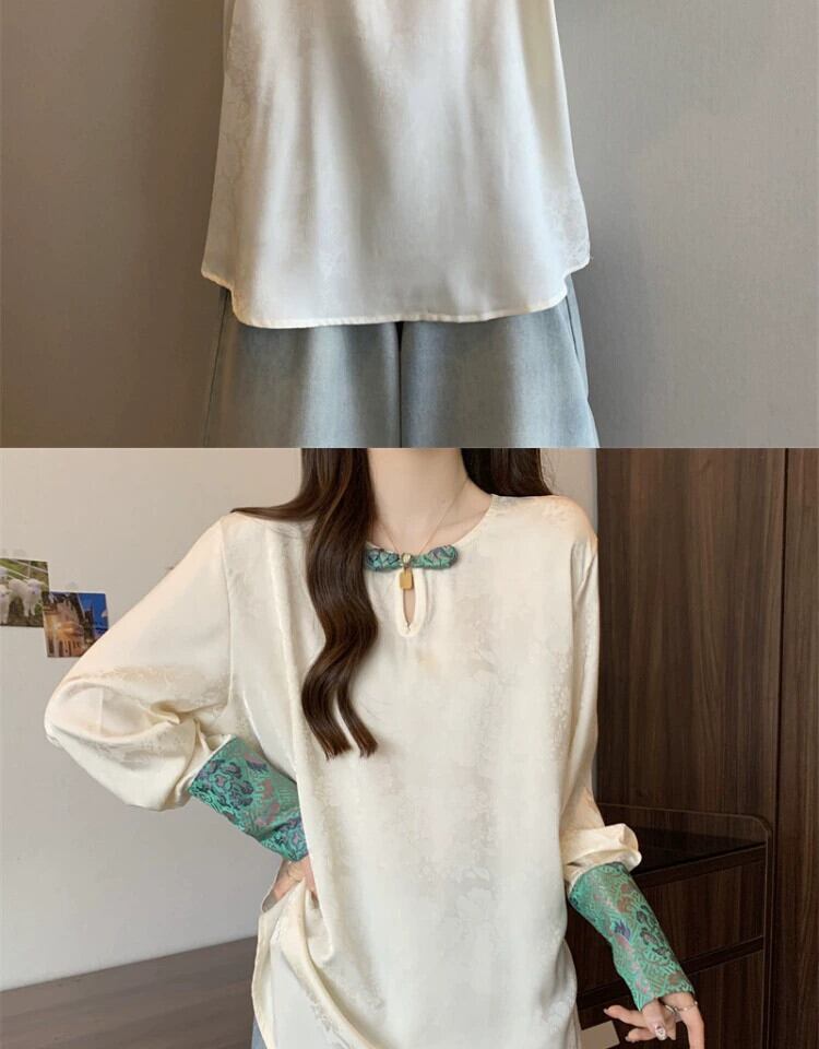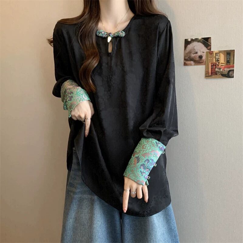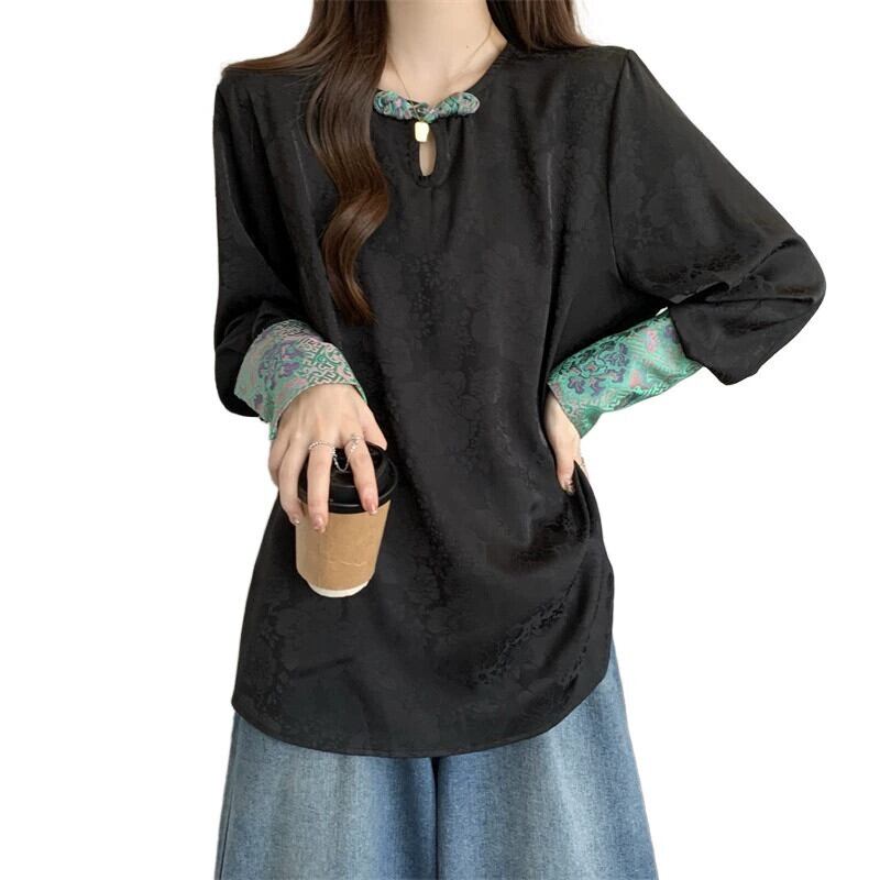 大きいサイズ 2024 春 レディース ラウンドネック 長袖 右肩 中国風 中国風 ディスクボタン サテン ルーズトップ ロング 大きめサイズ スプリング 春物 Oネック 888418115784901
