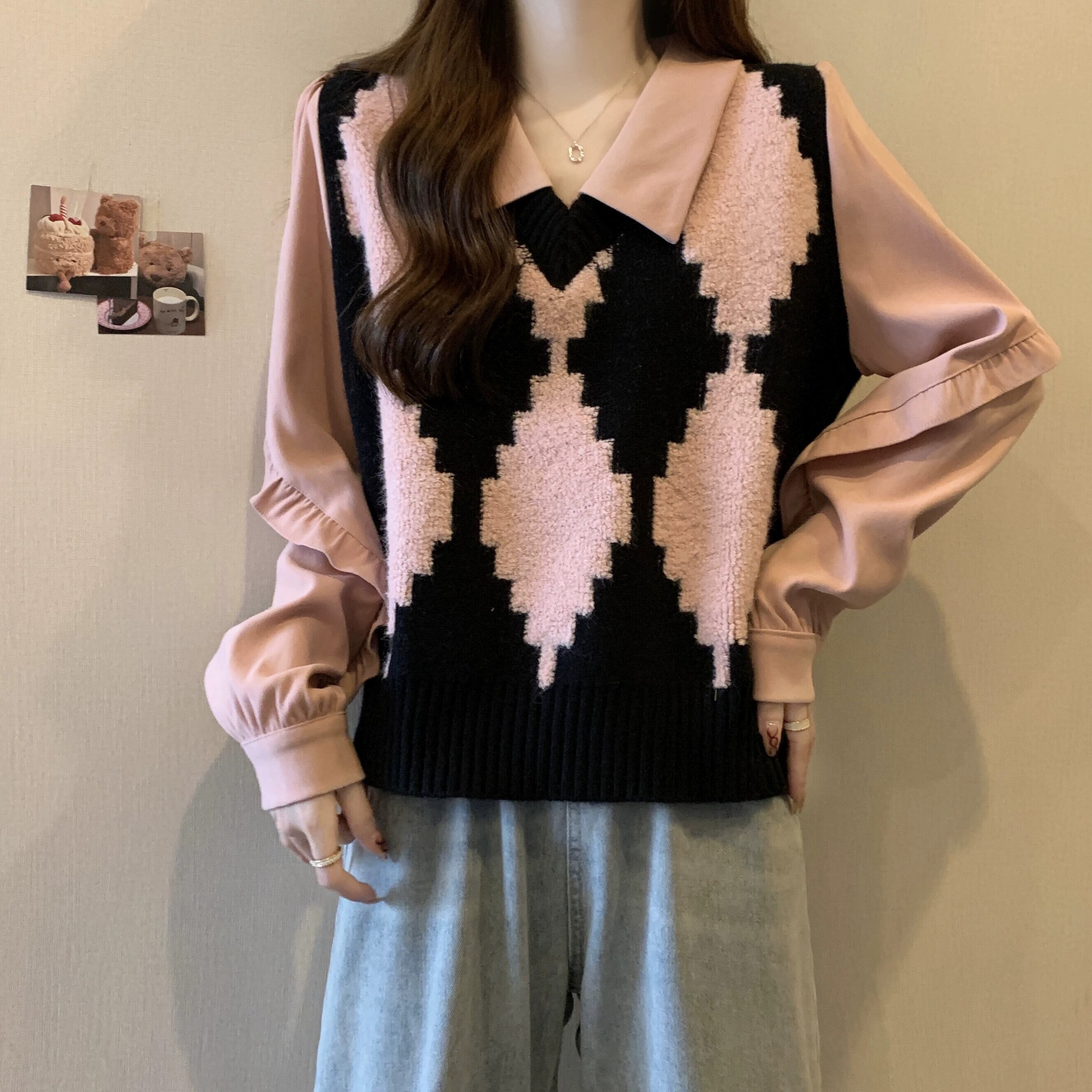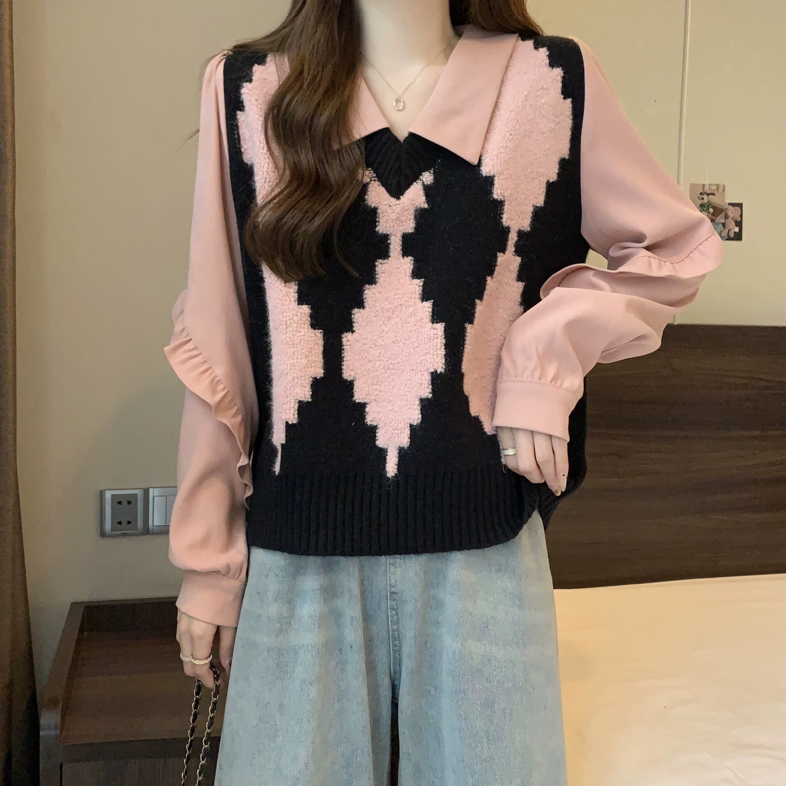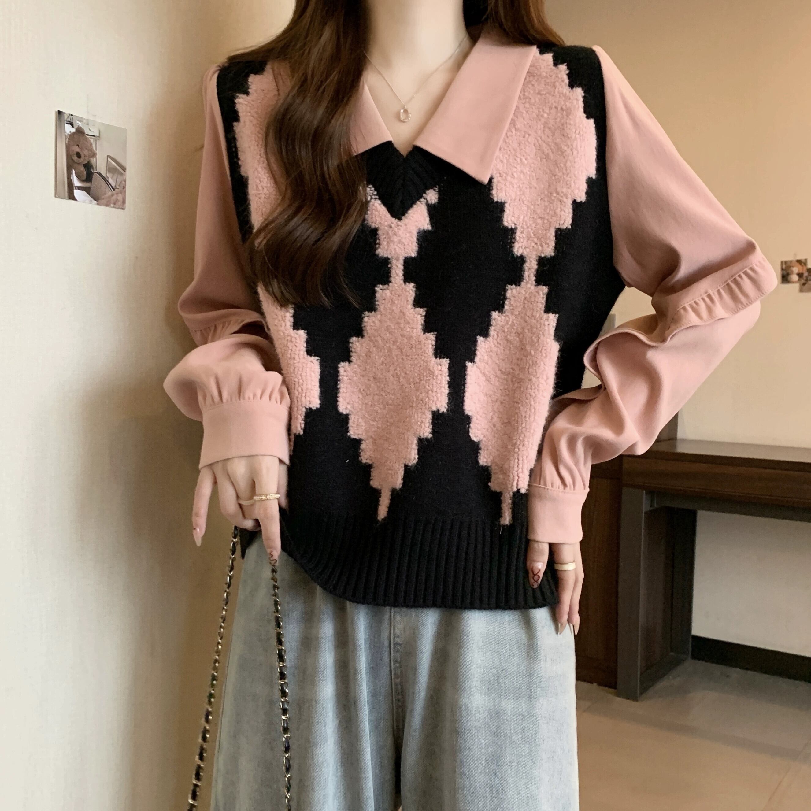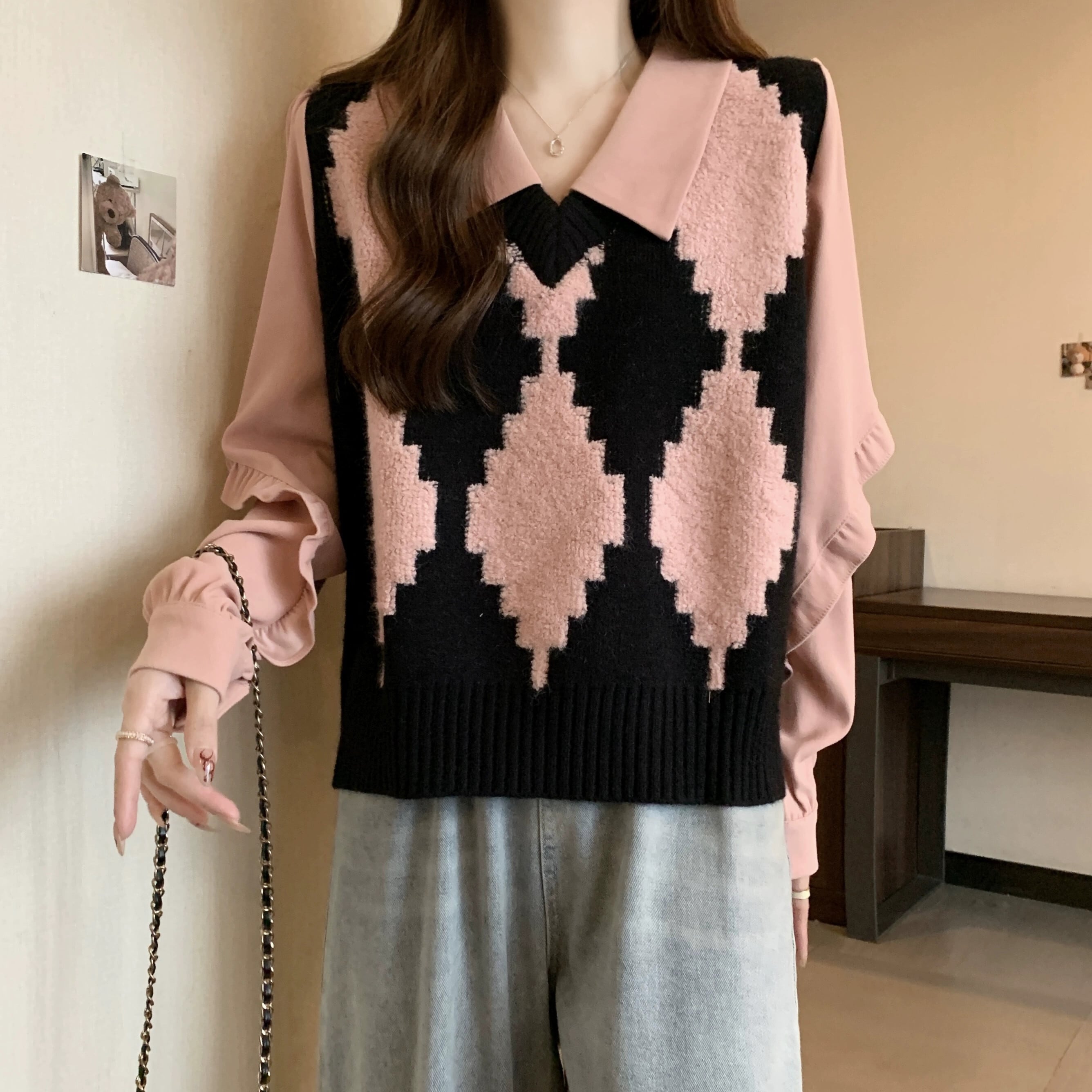 今年の人気の美しい菱形フェイクツーピースセーター女性の冬プラスサイズ脂肪ミリメートル痩身ポロカラーセータートップ 大きめサイズ ウィンター 冬物 8884154323907762