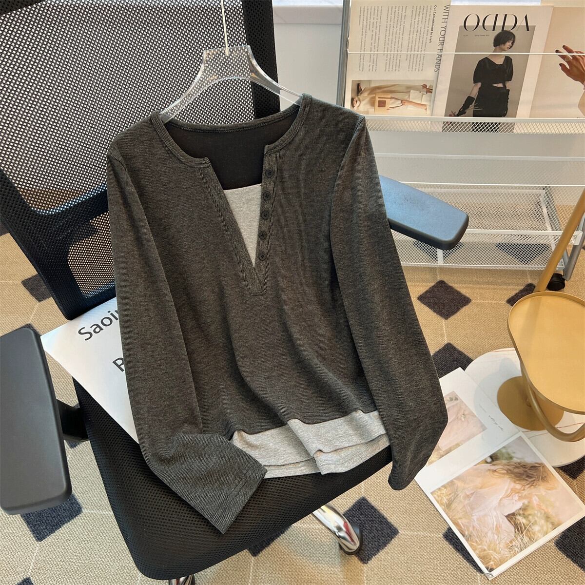 プラスサイズの女性の脂肪 mm 春の新スタイル 2024 スタイル長袖フェイクツーピーストップスルーズで多用途のズボンツーピースセット ロング 大きめサイズ スプリング 春物 8884143372040740
