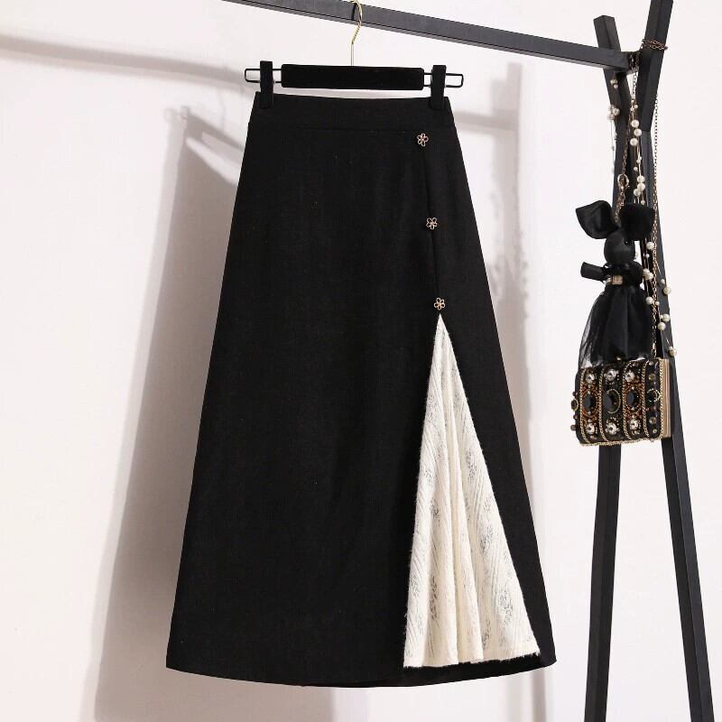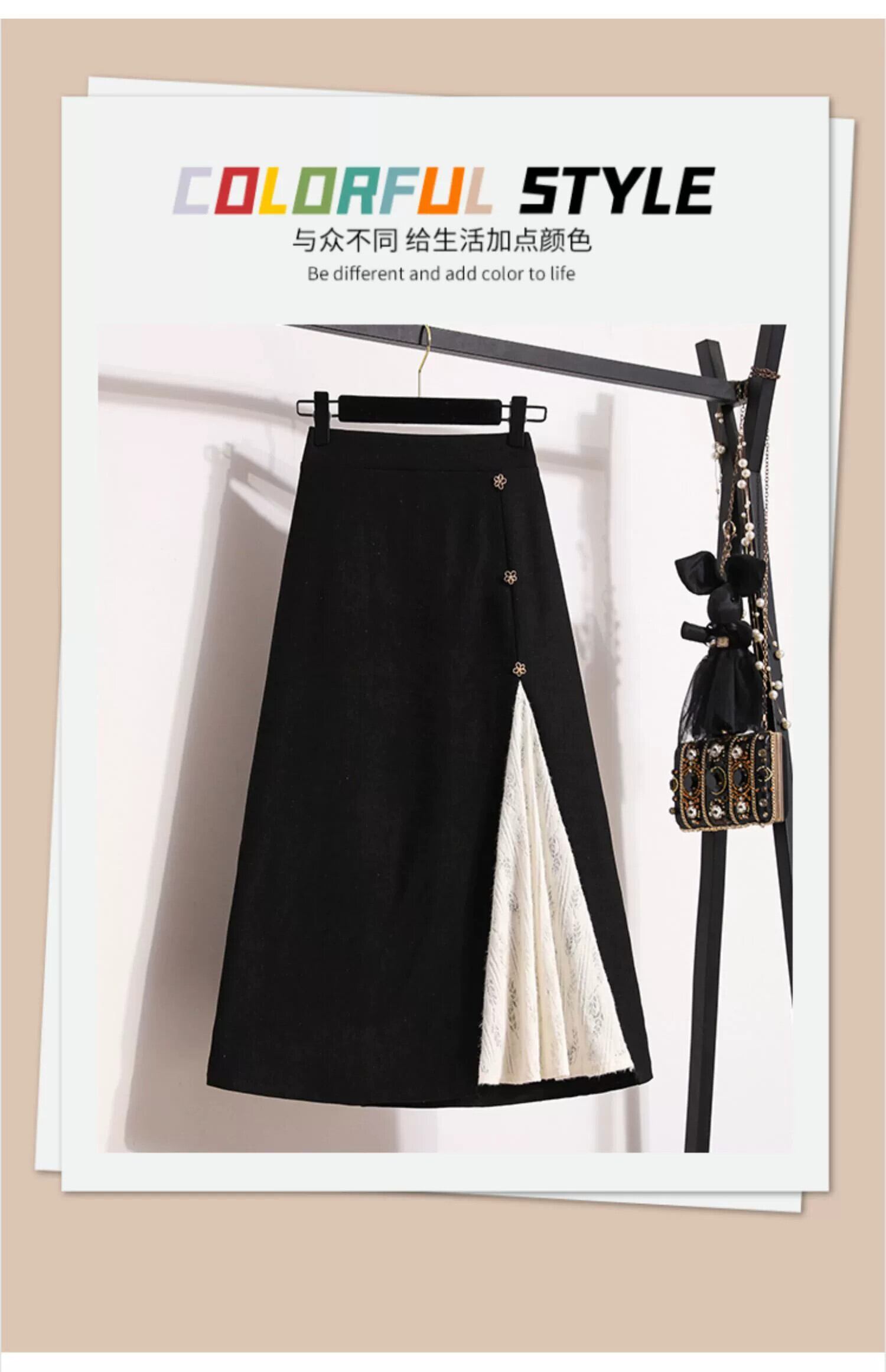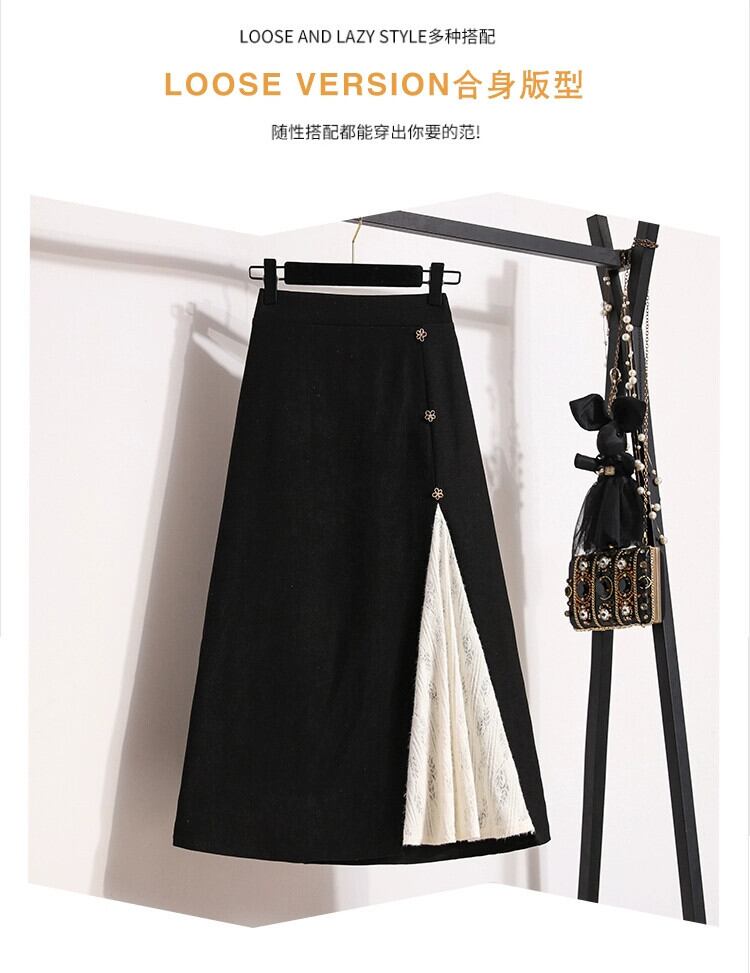 中国風のディスクバックルレーススプライシングスカート女性春プラスサイズ脂肪ミリメートル痩身Aラインプリーツスカート気質ロングスカート 大きめサイズ スプリング 春物 8884157617777073