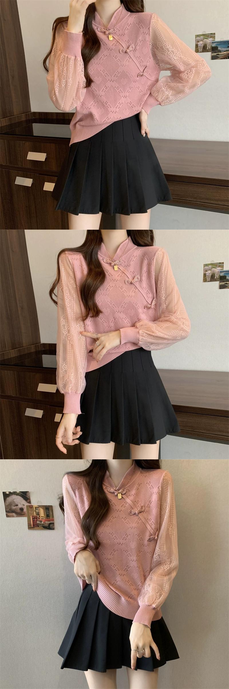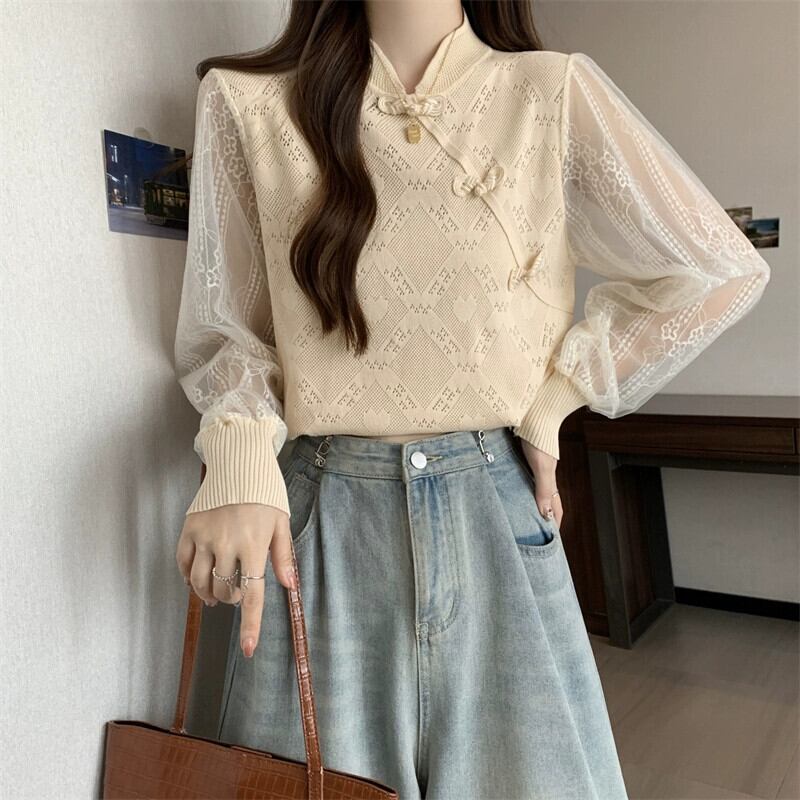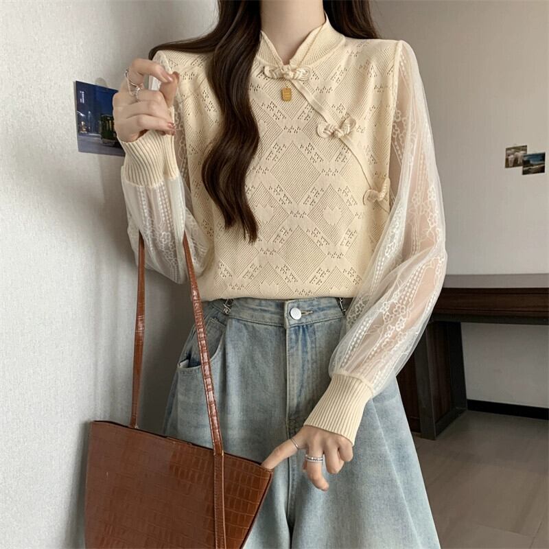 プラスサイズの婦人服脂肪ミリメートル春の新スタイル 2024 中国風のディスクボタン長袖レーススプライシングデザインセータートップ ロング 大きめサイズ スプリング 春物 8884167263907631