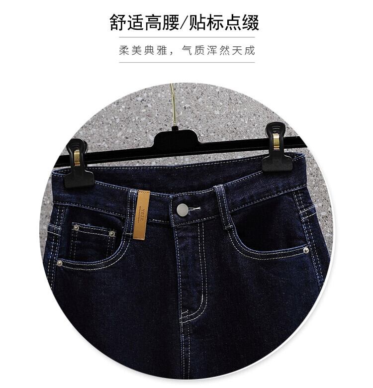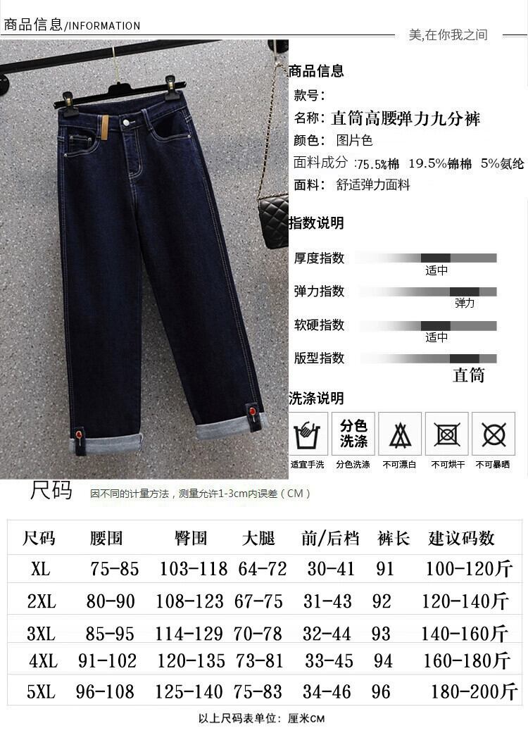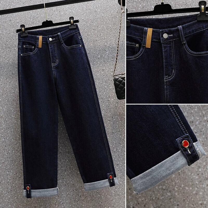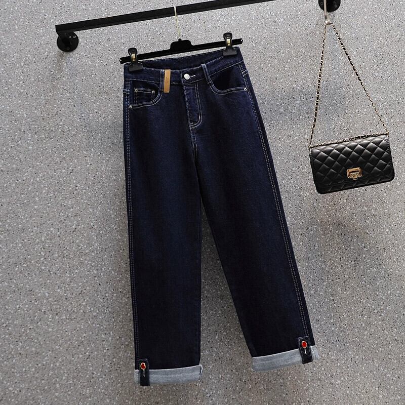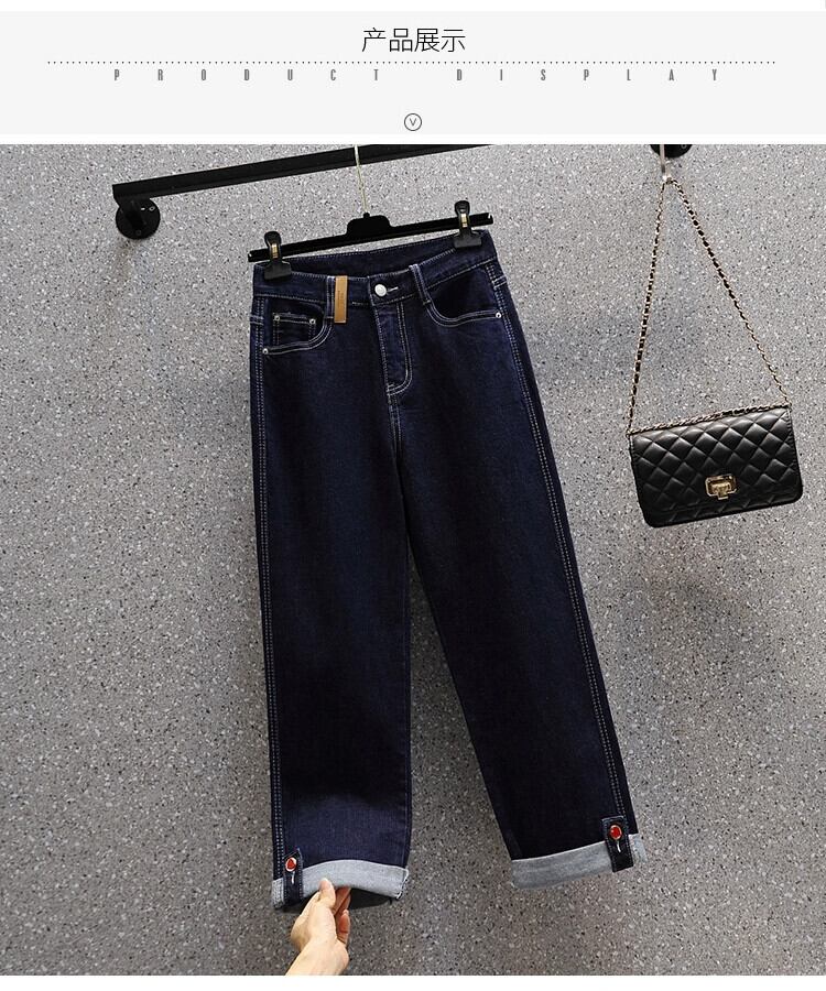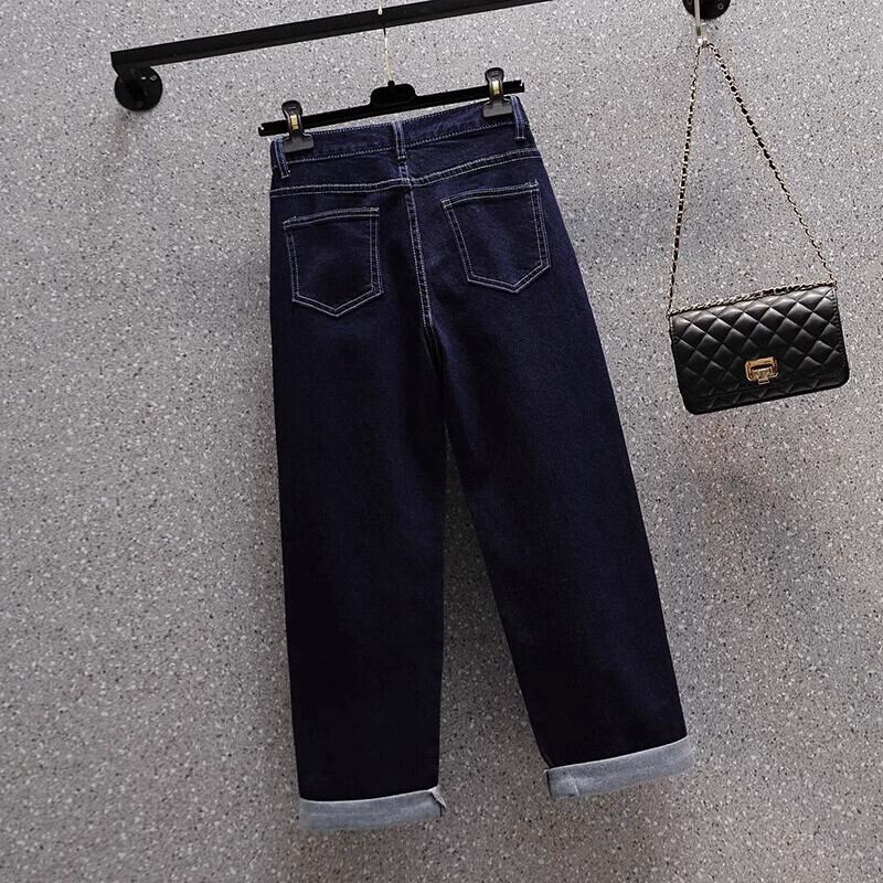 プラスサイズの女性の 2023 冬の新しいストレッチストレートカフスハイウエストジーンズファット MM カジュアルルーズ 9 点 ハイウェスト 大きめサイズ ウィンター 冬物 8884164887996549