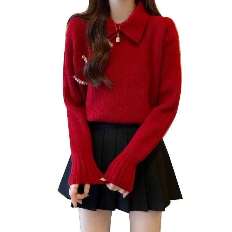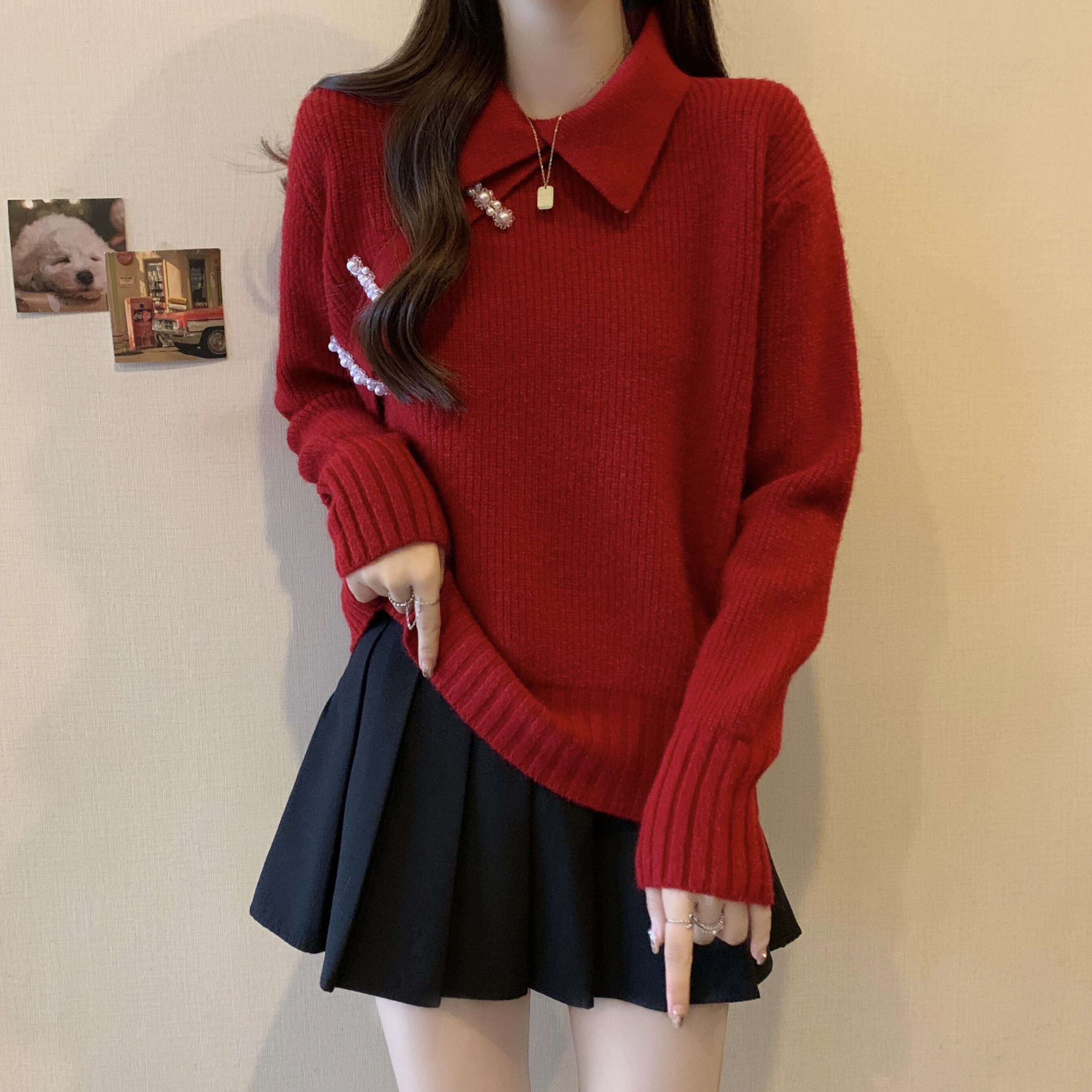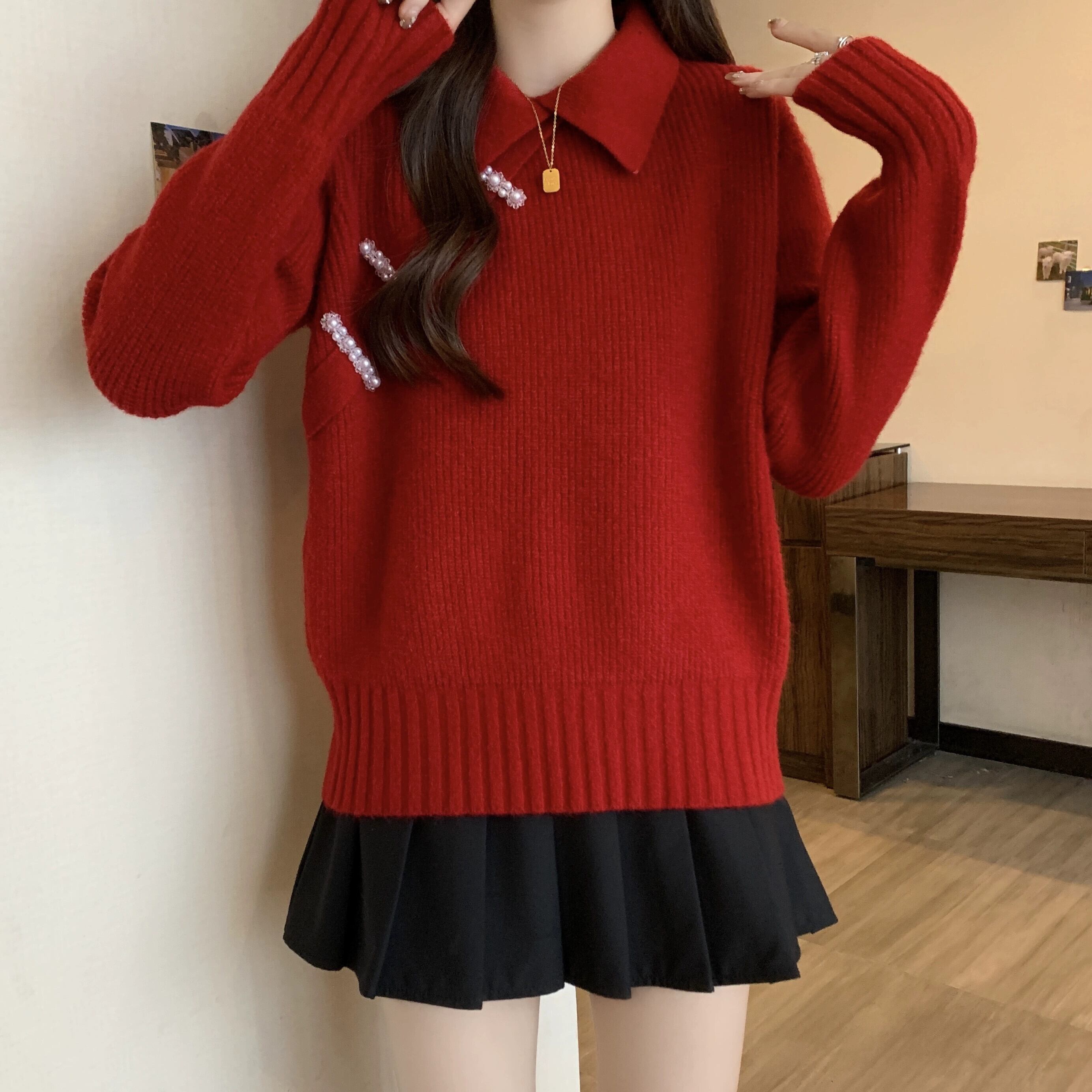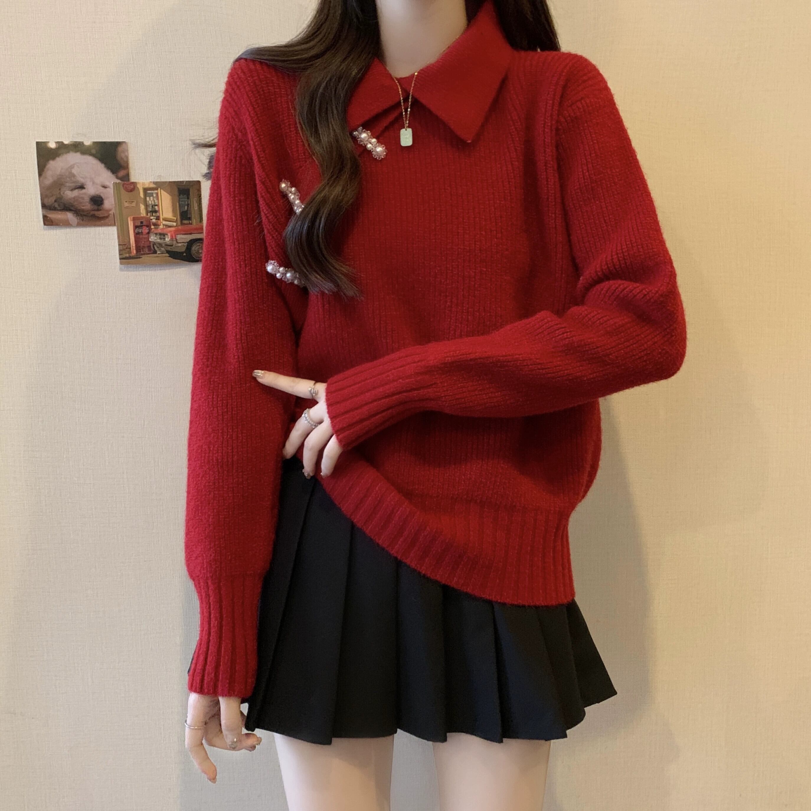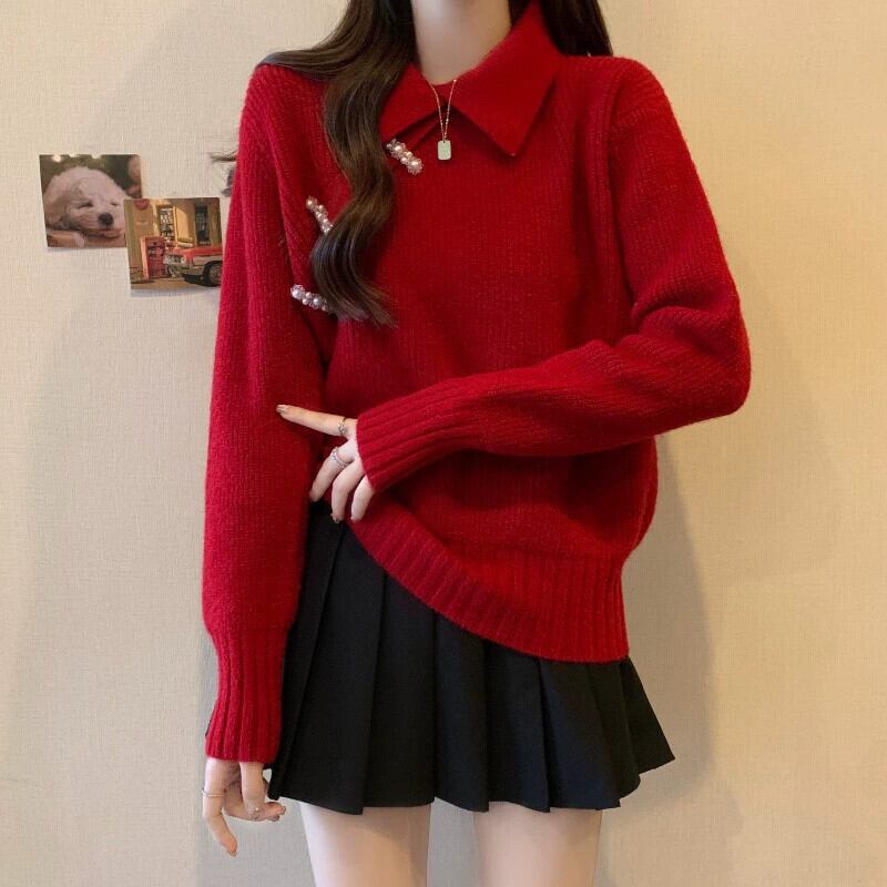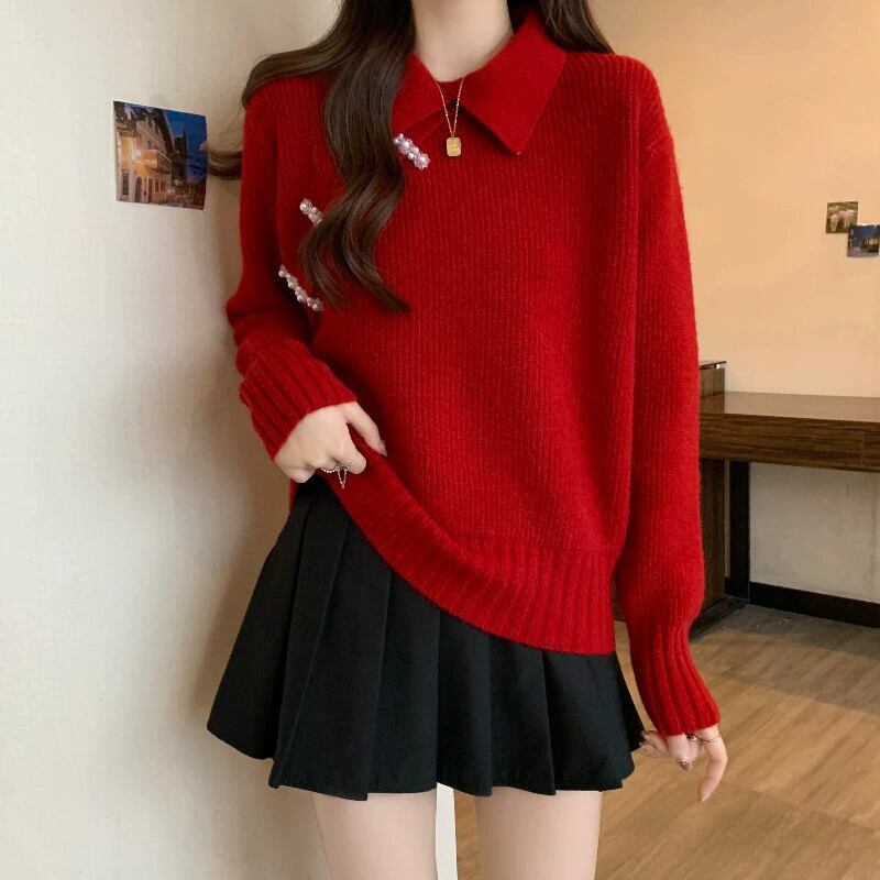 プラスサイズの女性の春の新スタイル脂肪ミリメートル痩身長袖赤いセーターラペル新しい中国風のディスクボタンセーター ロング レッド 大きめサイズ スプリング 春物 8884183304138983