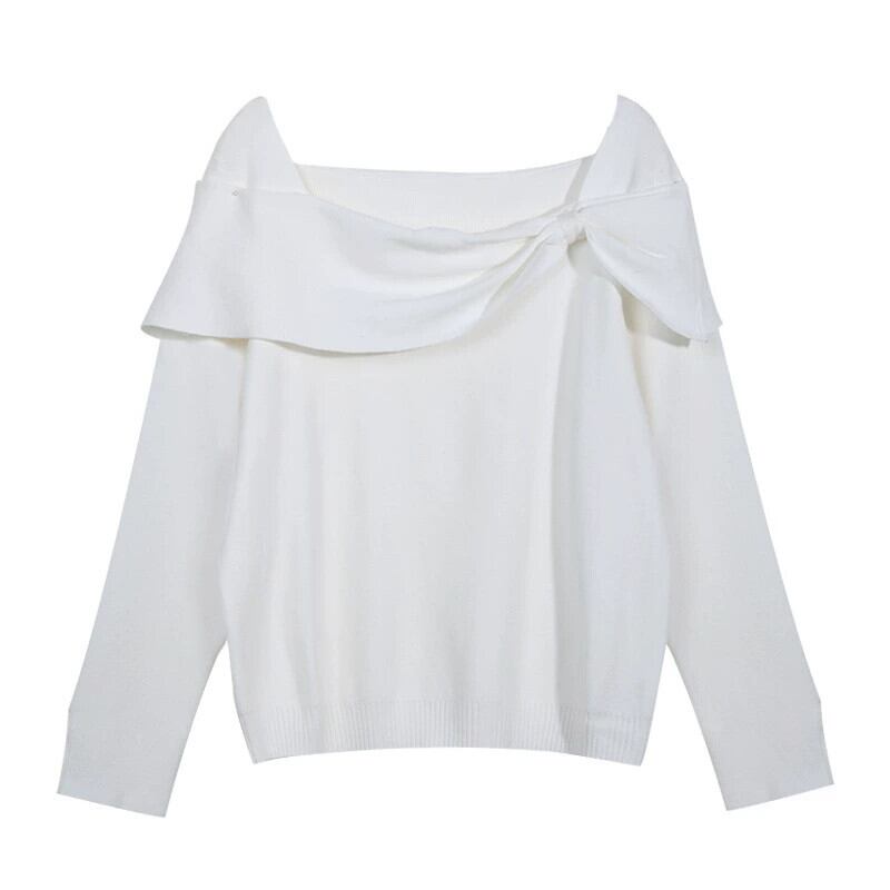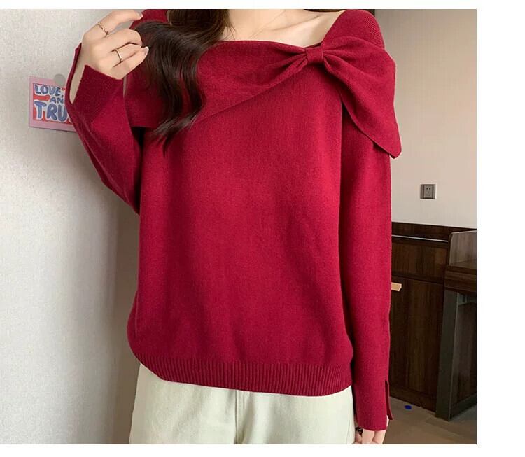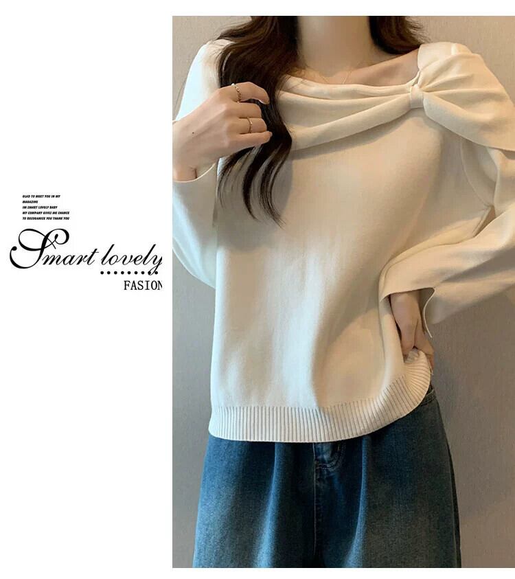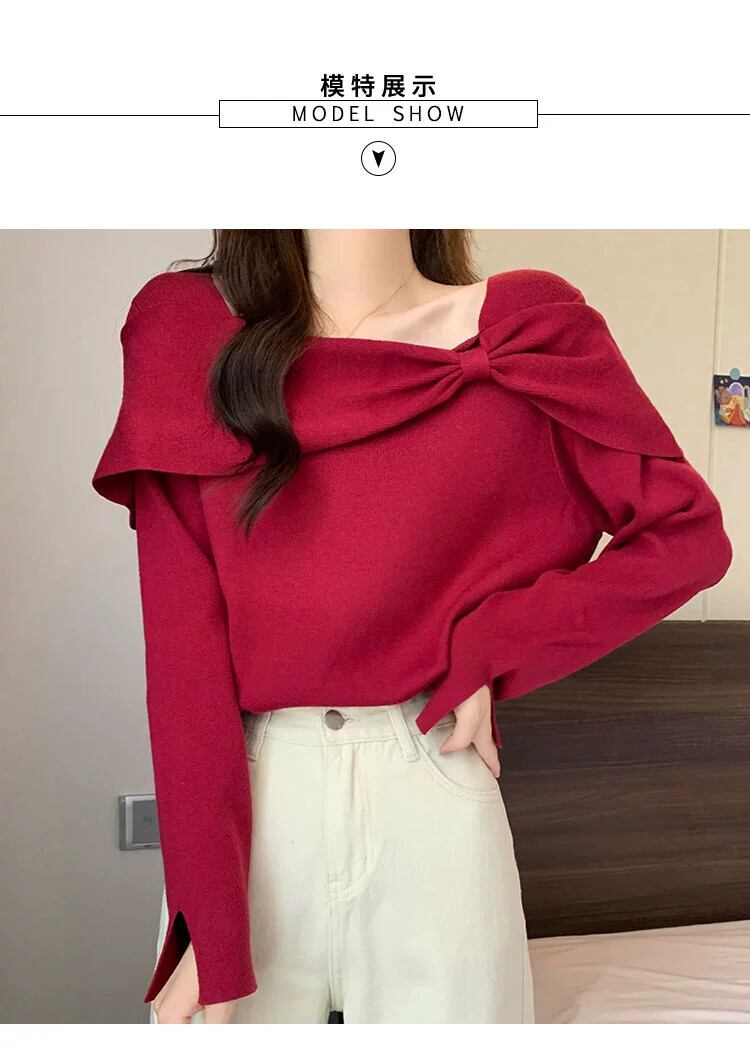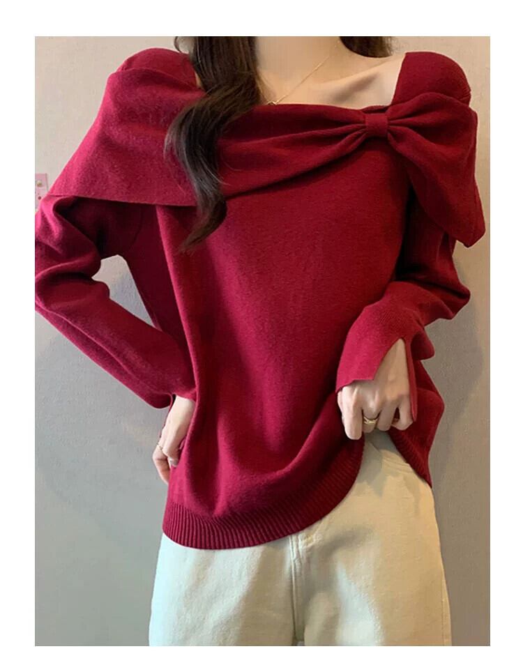 大きいサイズの弓のセーターの女性 2023 春の新作脂肪ミリメートル痩身カバーフレンチスクエアネックニット底トップ リボン 大きめサイズ スプリング 春物 スクウェア 8884119700777330