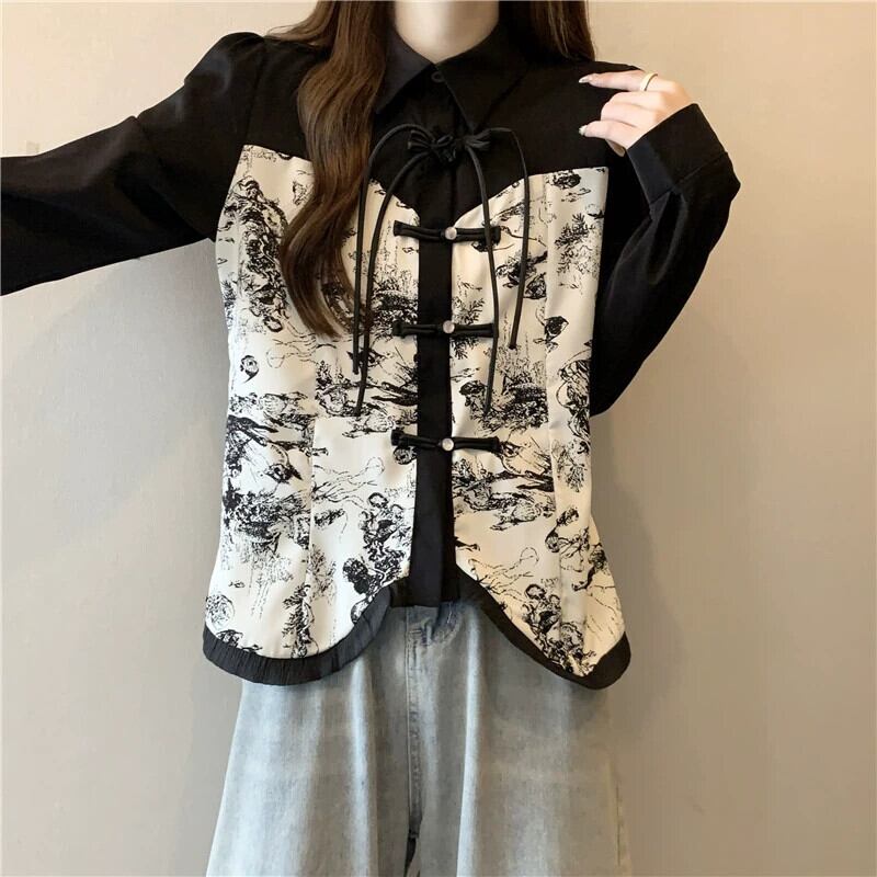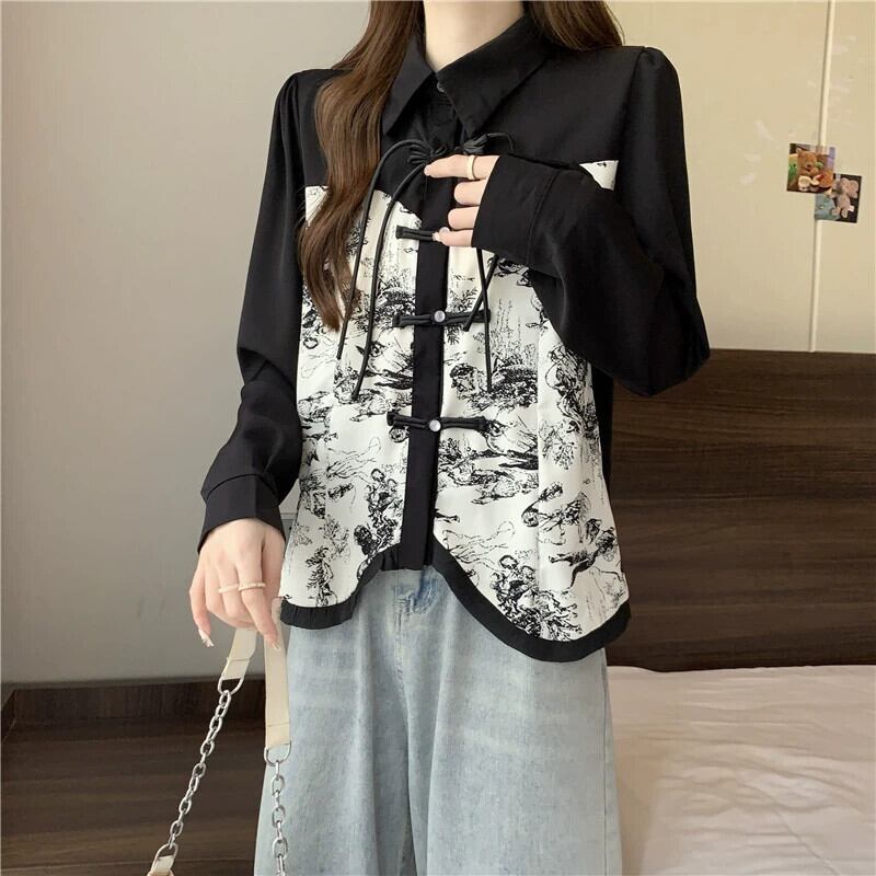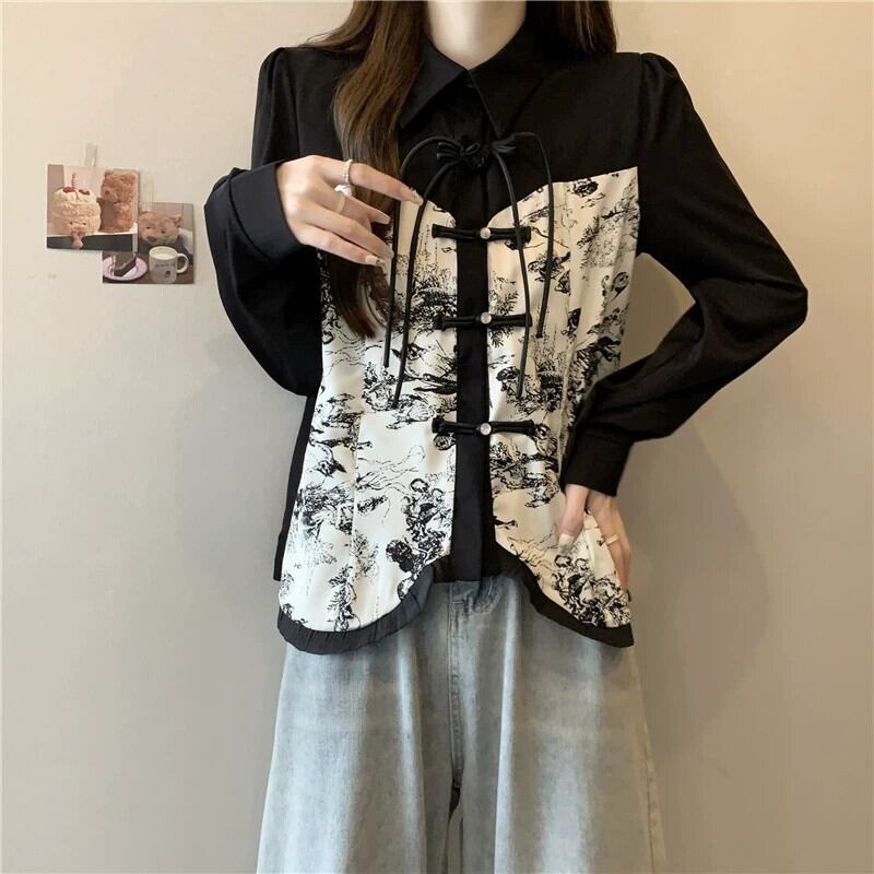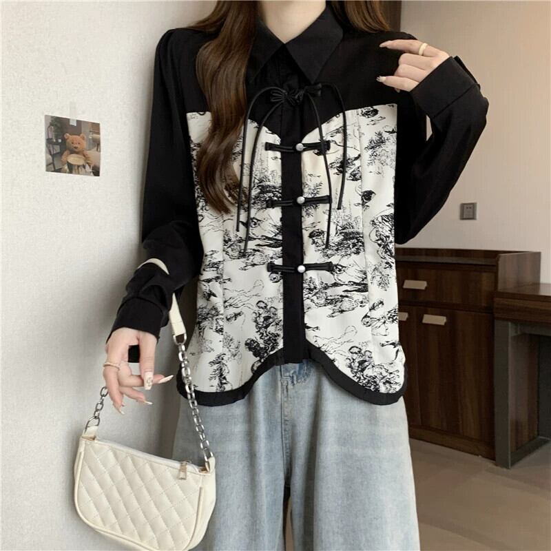 プラスサイズの女性の脂肪 mm 春の新スタイル 2024 長袖新中国風の痩身シャツ、国民風のシックなお腹カバートップ ロング 大きめサイズ スプリング 春物 8884142102246937