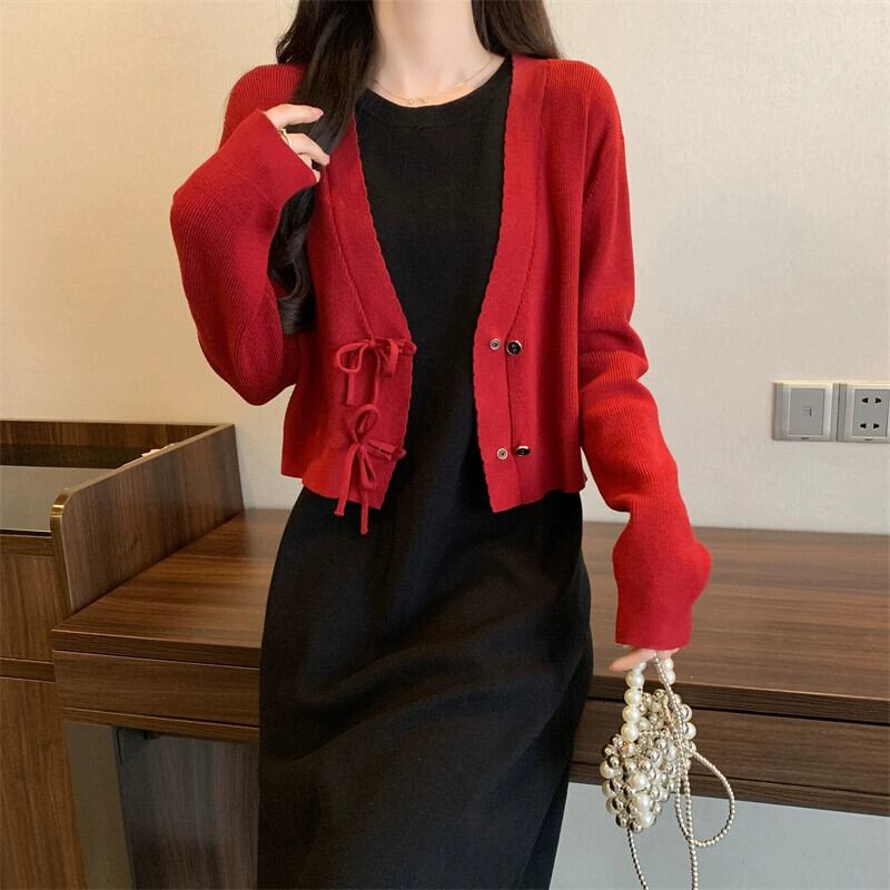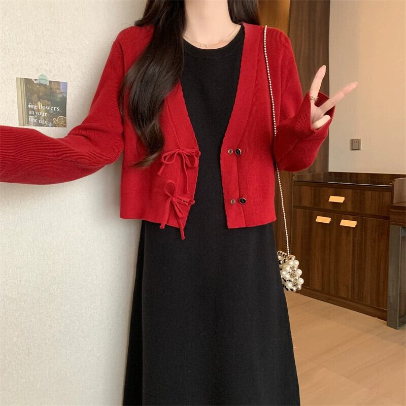 色:シングルレッドカーディガン,シングルブラックタンクトップスカート,ツーピースセット
