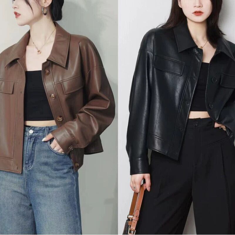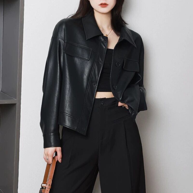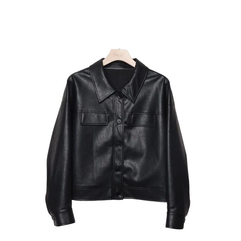 春の大きいサイズの高級おしゃれなラペル付きレザージャケットです。太めのmmがお肉をカバーしてスリムに見えます。有能なレザージャケットトップ 大きめサイズ スプリング 春物 8884184250491920