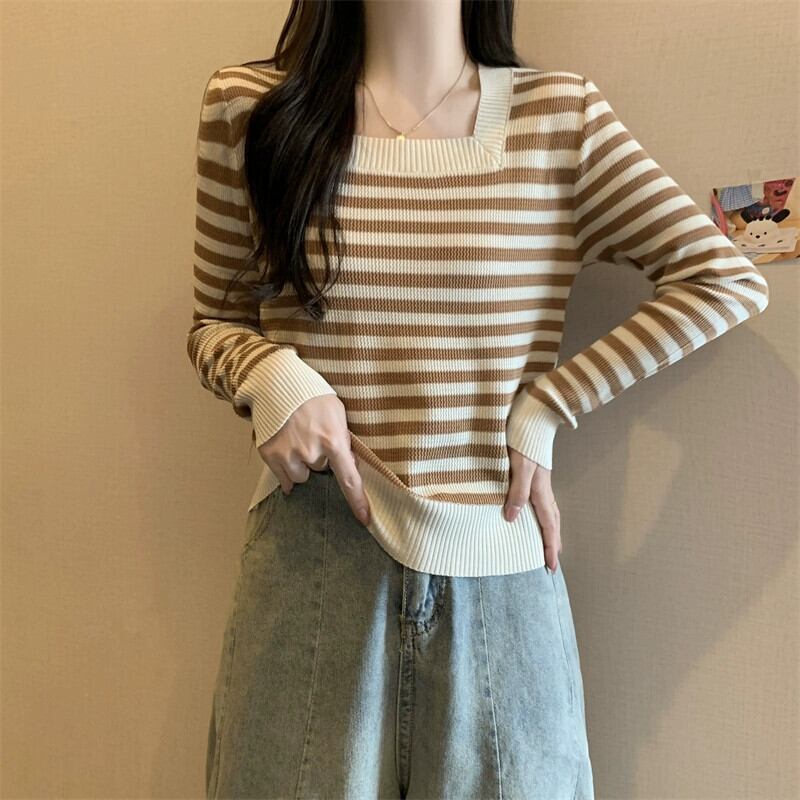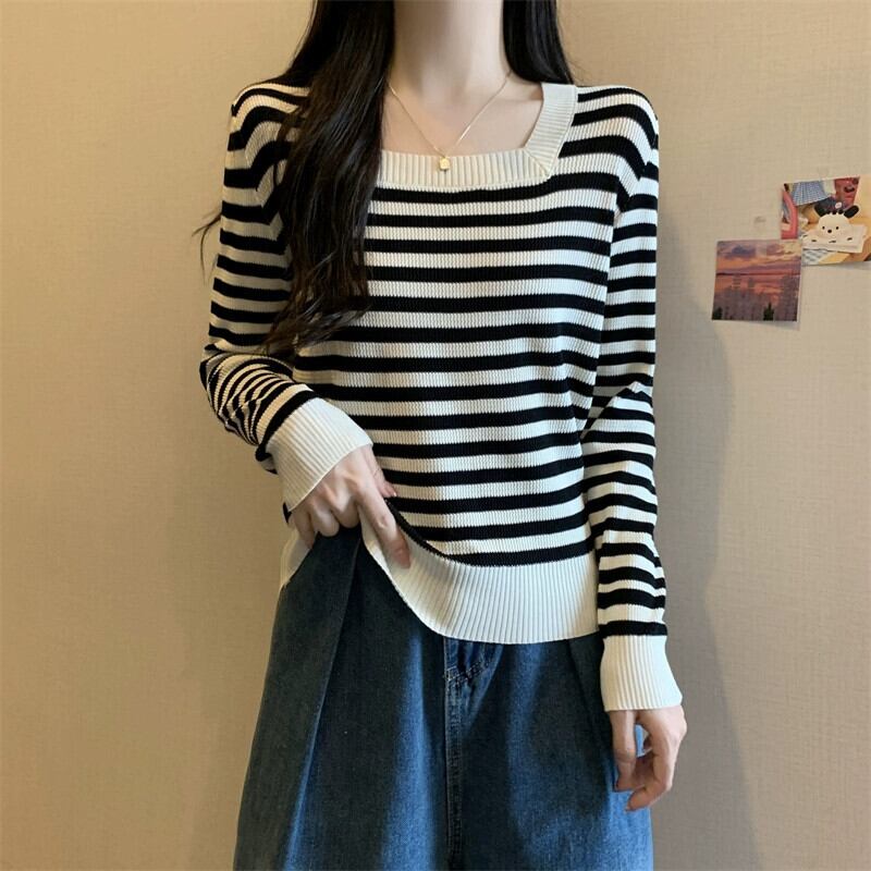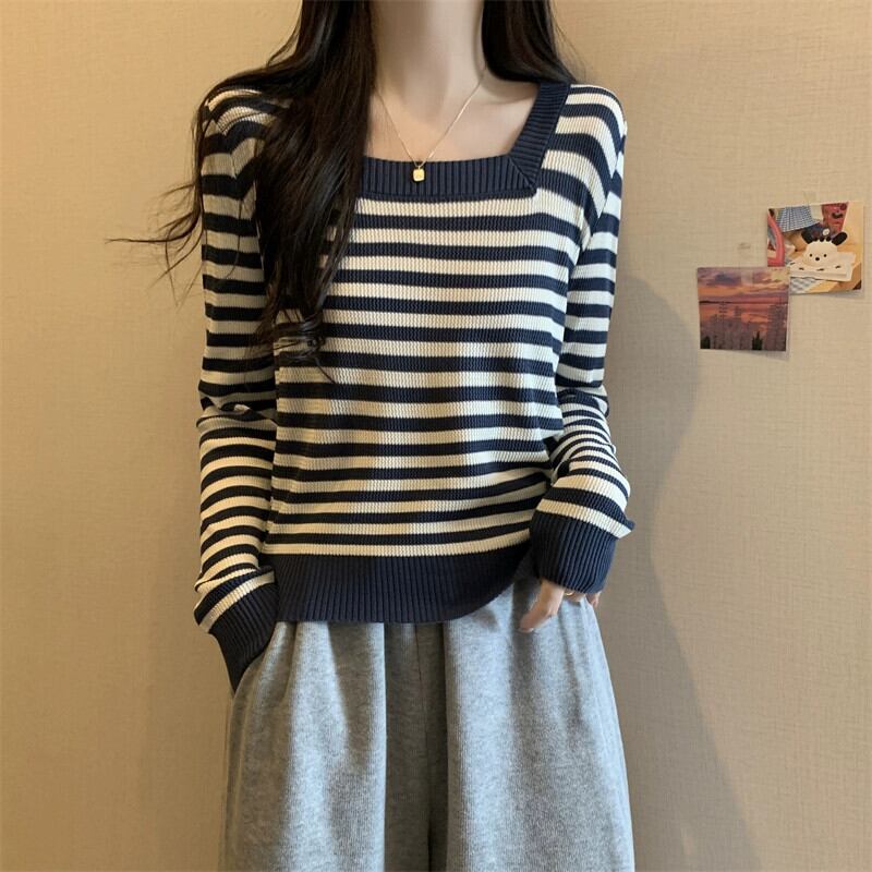 プラスサイズの婦人服ファット mm 春の新 2024 スクエアネックスリムセーターストライプ長袖 T シャツとボトリングシャツ ロング 大きめサイズ スプリング 春物 Tシャツ スクウェア 8884172480142175